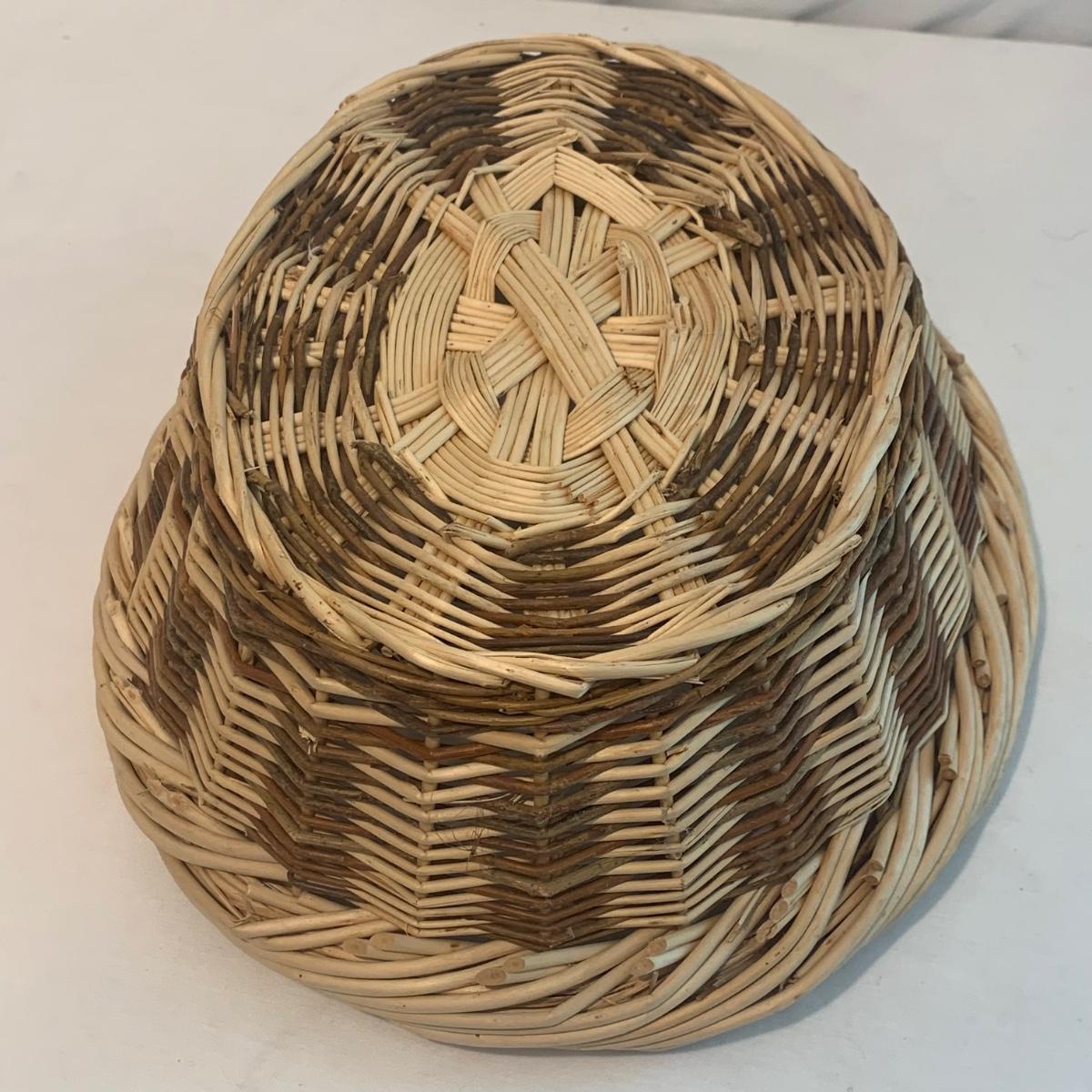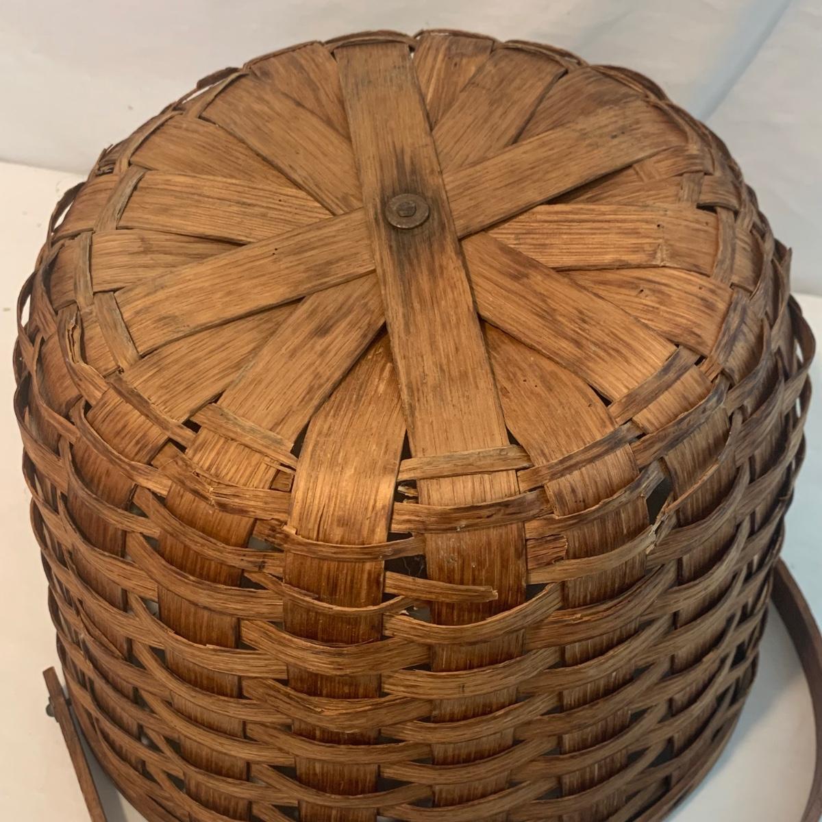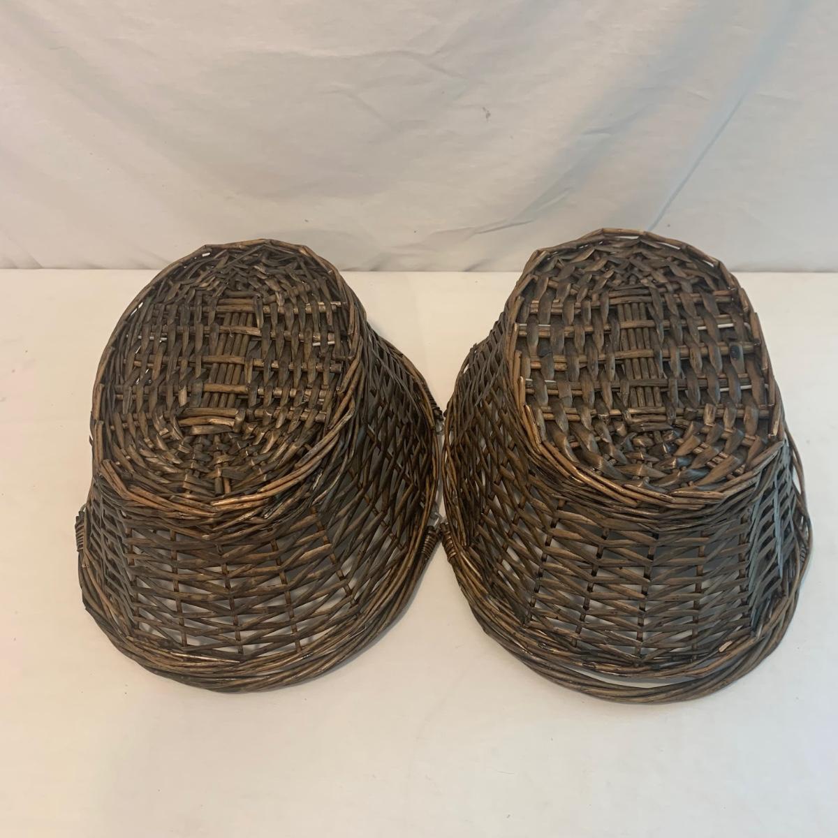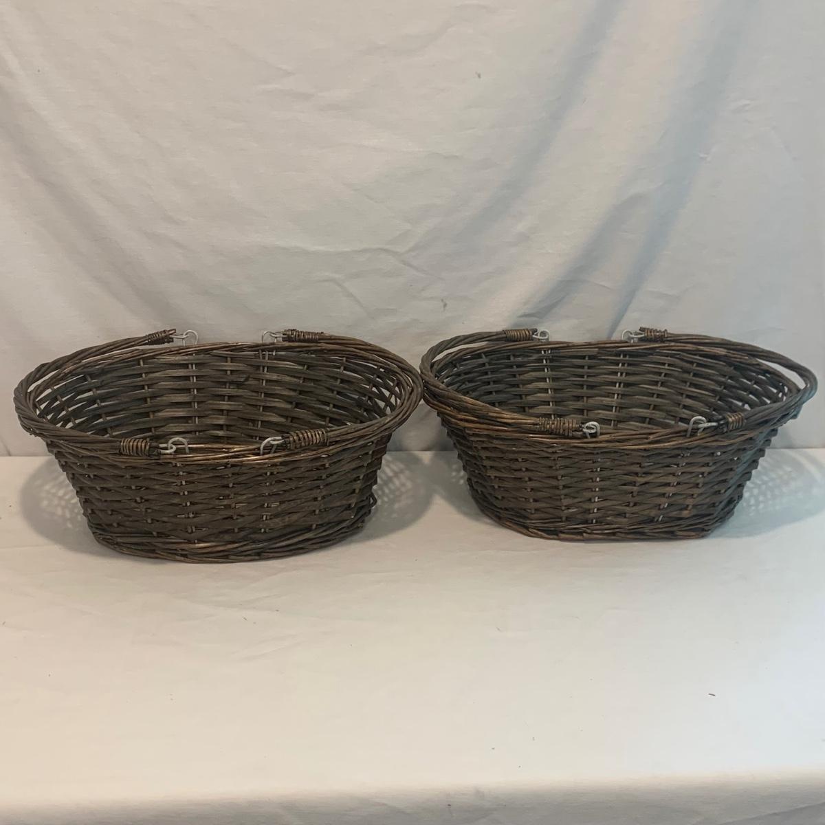 Six woven baskets, five of which have handles. Two have stationary handles while the other three have movable handles. The largest basket is round and measures 13.75”D x 11”H, not including the handle. This one has a little damage; see photos.