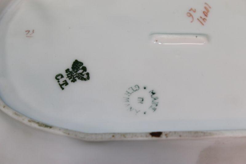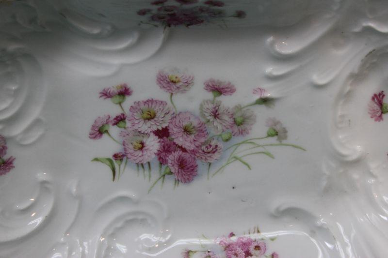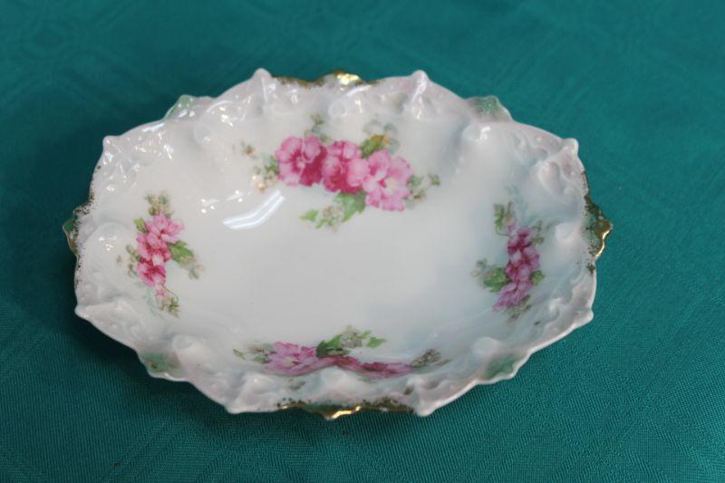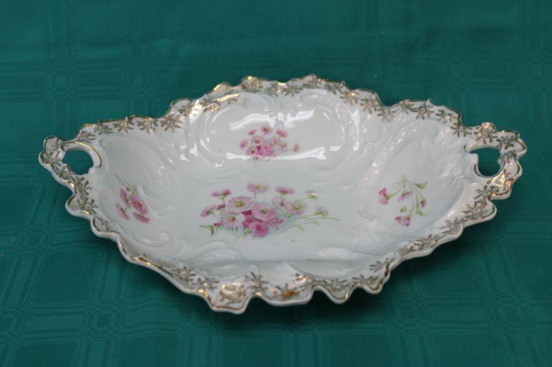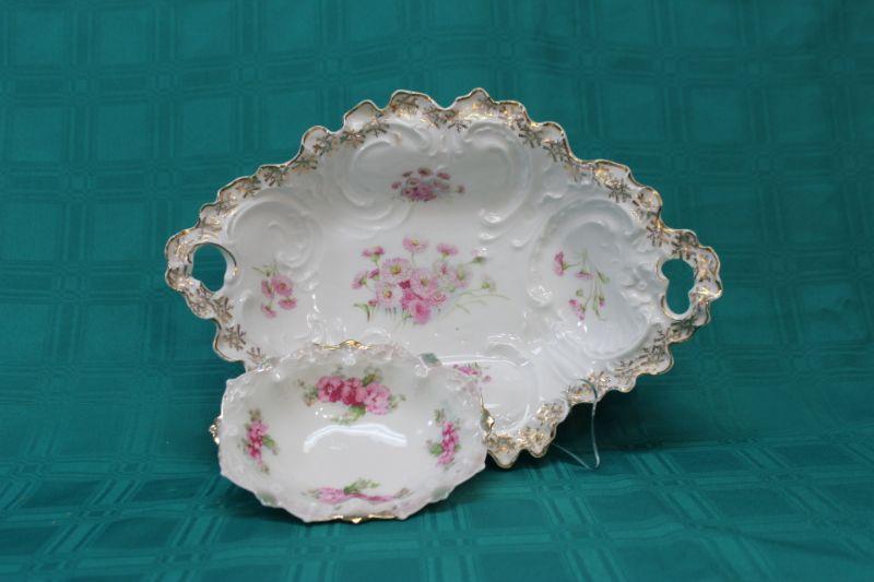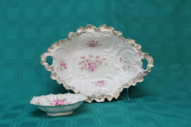 Pair of fine china serving pieces. Pink Floral Patterns. Gold accent. The large piece is made in Germany. The smaller in Austria. Both have maker's markers.