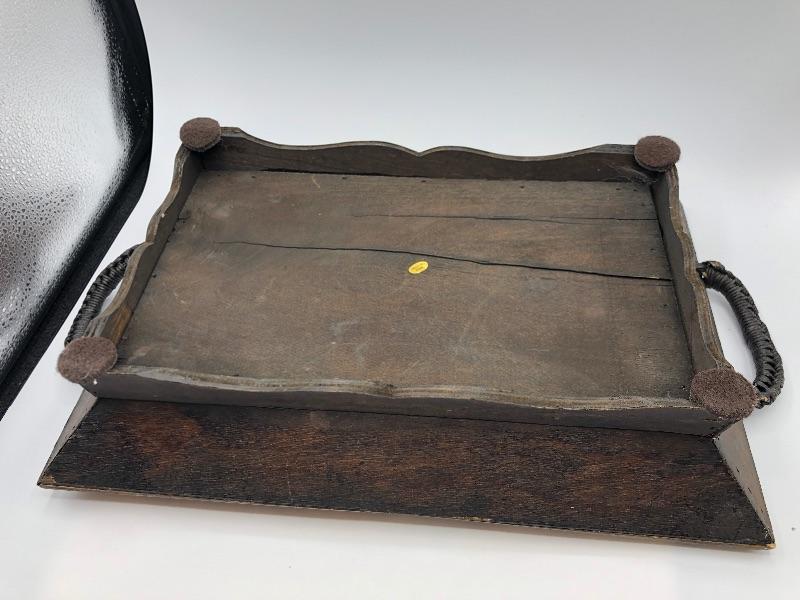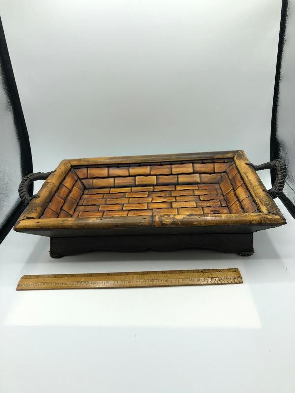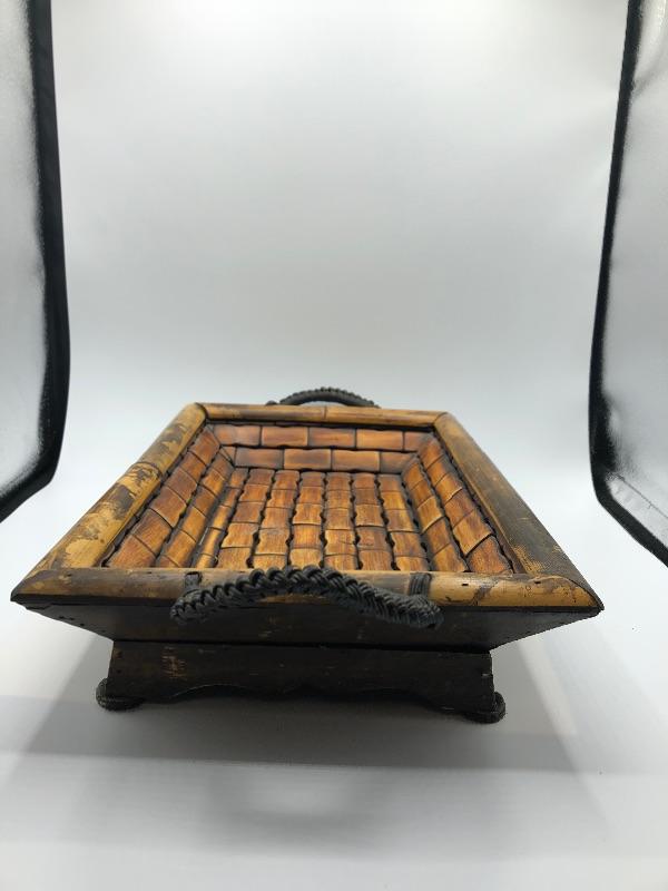 Decorative Wood Basket Tray. Asian inspired look. Bamboo edge. Rectangular, with handles. About 14" on the longest edge.