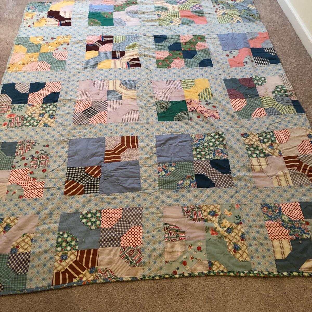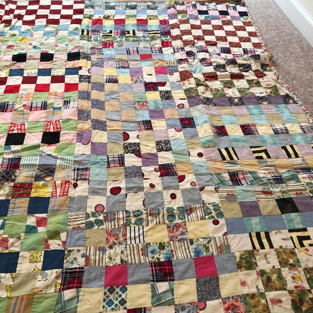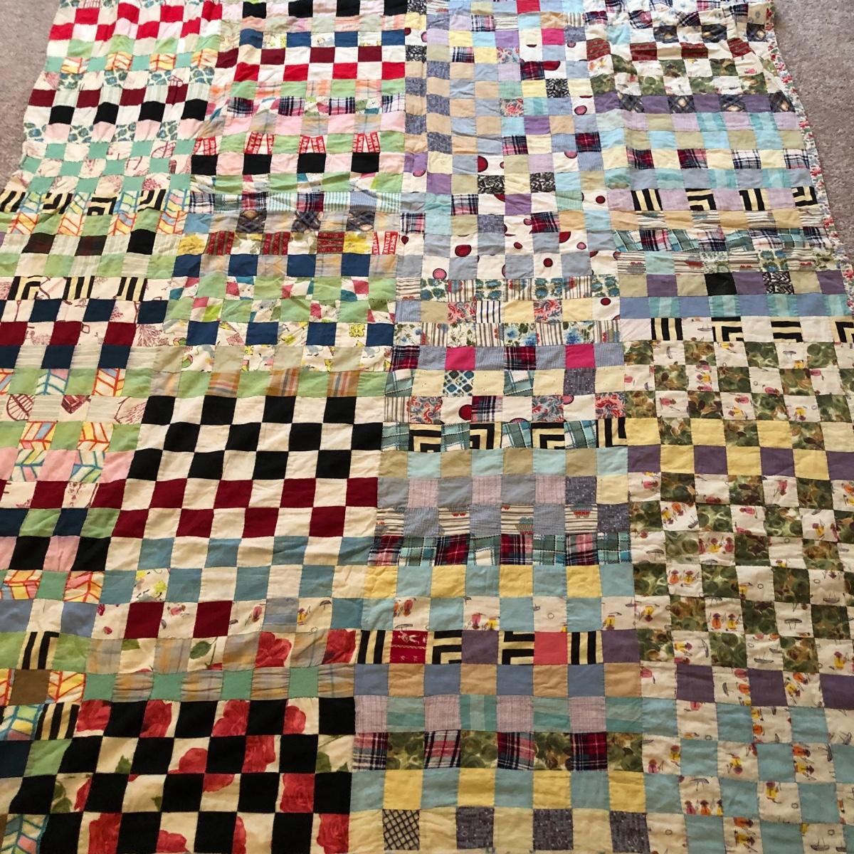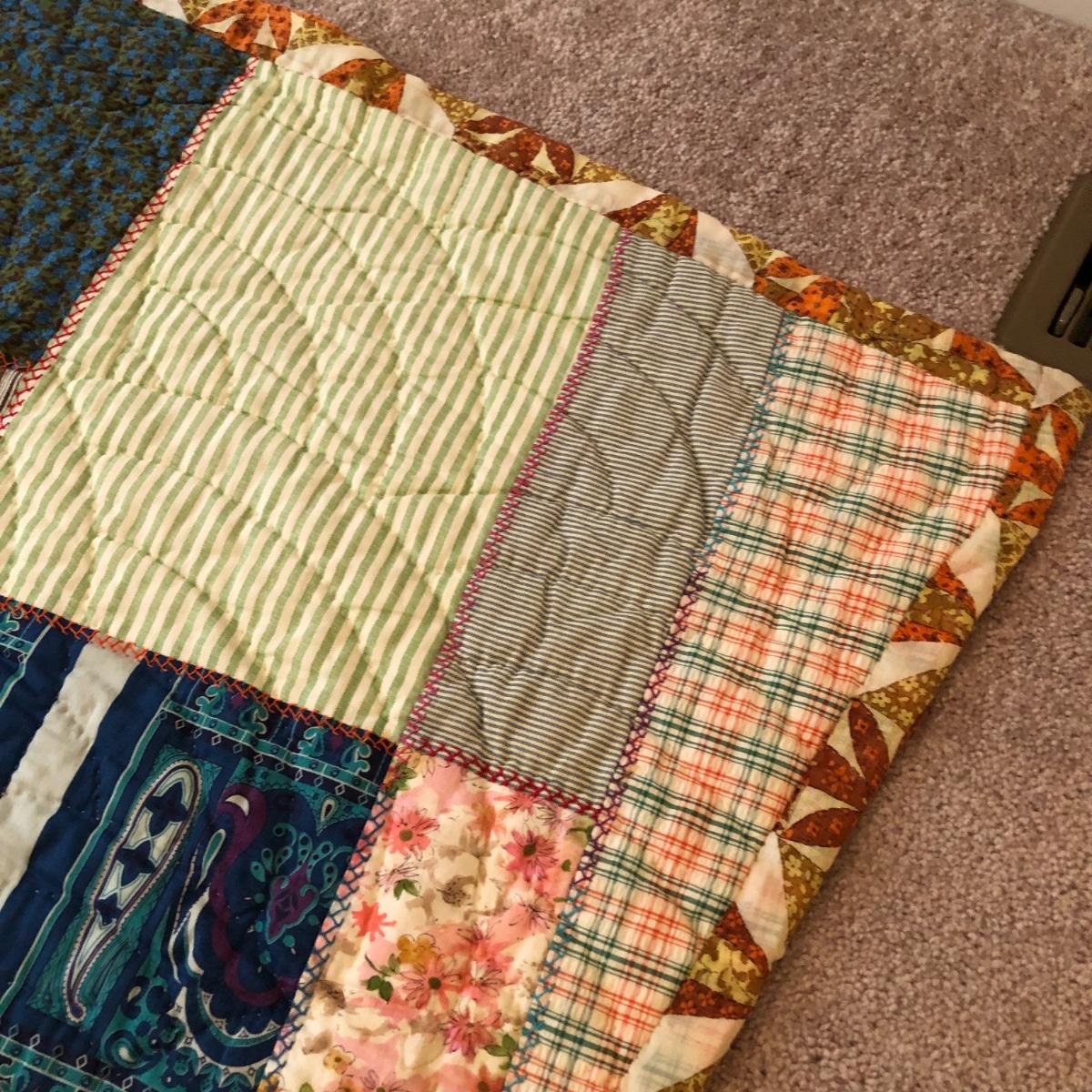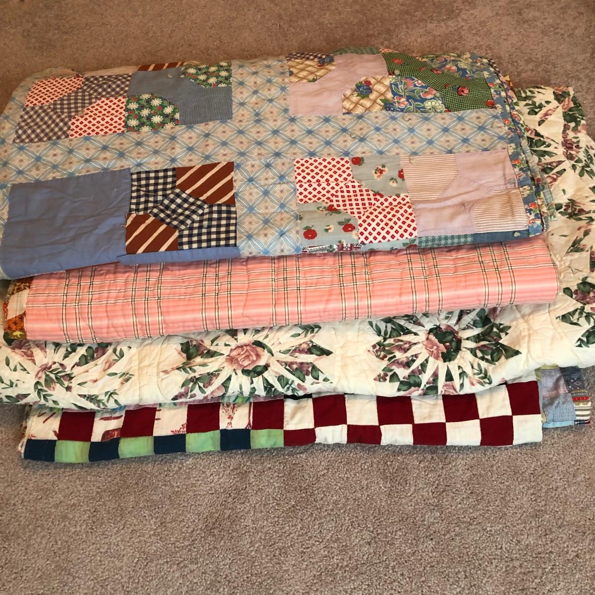 There are 4 handmade quilts in this lot with all of them but one having two different sides. The first quilt has long pieces of colorful fabric pieces on one side and brown and orange stars on the other side. It measures 61” x 79”. The second quilt has a blue background with different colored squares on one side and a green background with white flowers on the other. It measures 63.5” x 76”. The third quilt has little mult-colored squares on one side and multi-colored circles on the other side. It measures 60” x 81.5”. The last quilt has a off-white background with pointed flowers on the top side and scalloped edges.This last quilt measures 79” x 81.5”. Each quilt is a work of art. Shipping Available.