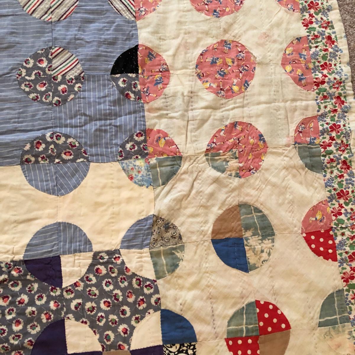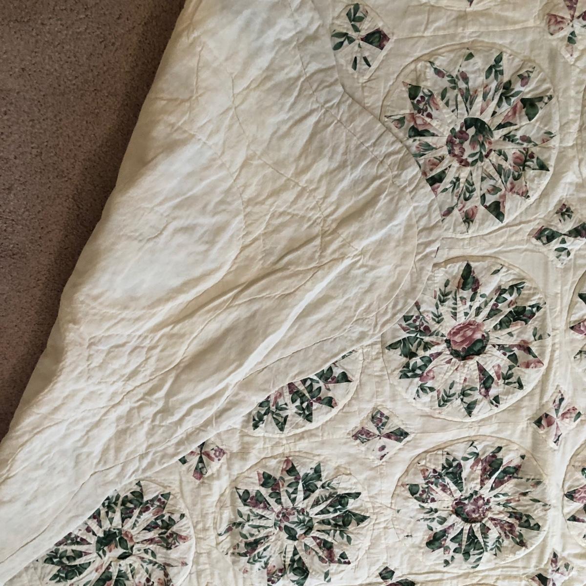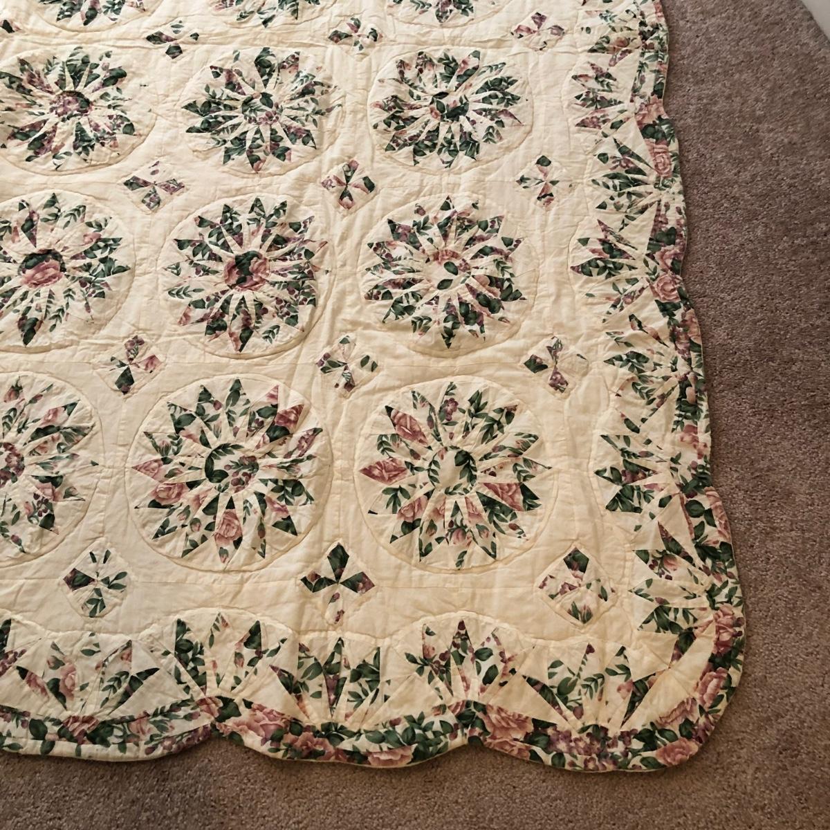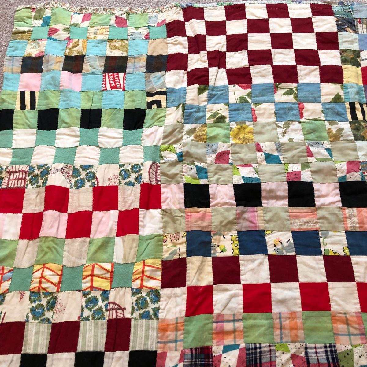 There are 4 handmade quilts in this lot with all of them but one having two different sides. The first quilt has long pieces of colorful fabric pieces on one side and brown and orange stars on the other side. It measures 61” x 79”. The second quilt has a blue background with different colored squares on one side and a green background with white flowers on the other. It measures 63.5” x 76”. The third quilt has little mult-colored squares on one side and multi-colored circles on the other side. It measures 60” x 81.5”. The last quilt has a off-white background with pointed flowers on the top side and scalloped edges.This last quilt measures 79” x 81.5”. Each quilt is a work of art. Shipping Available.