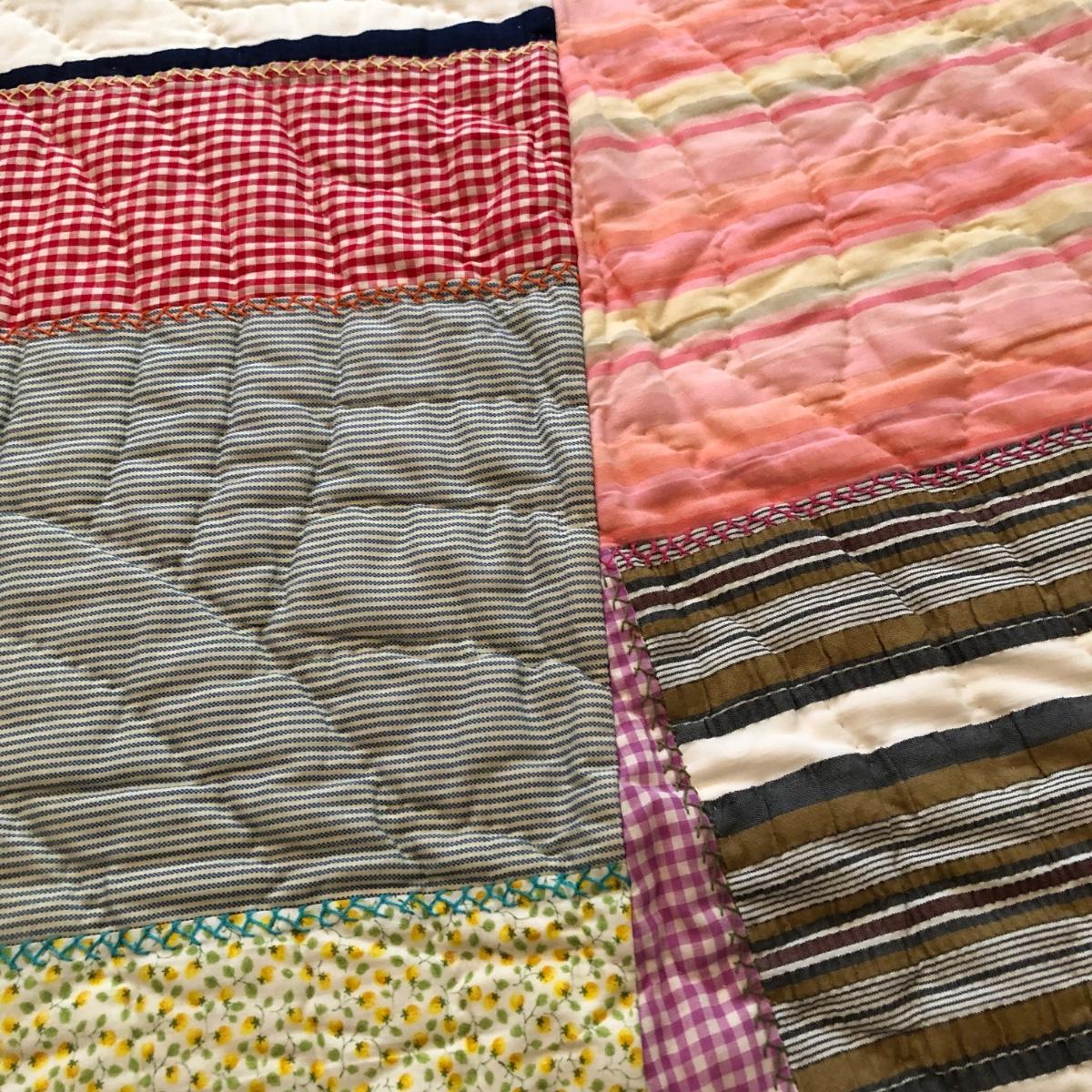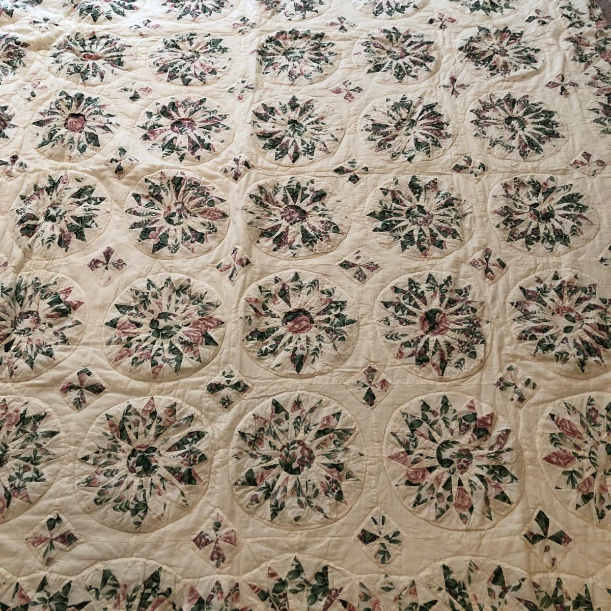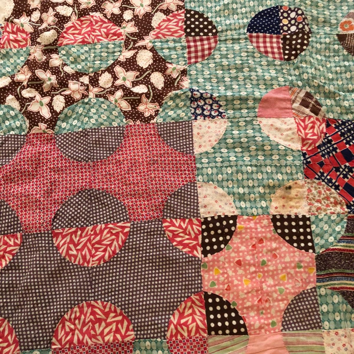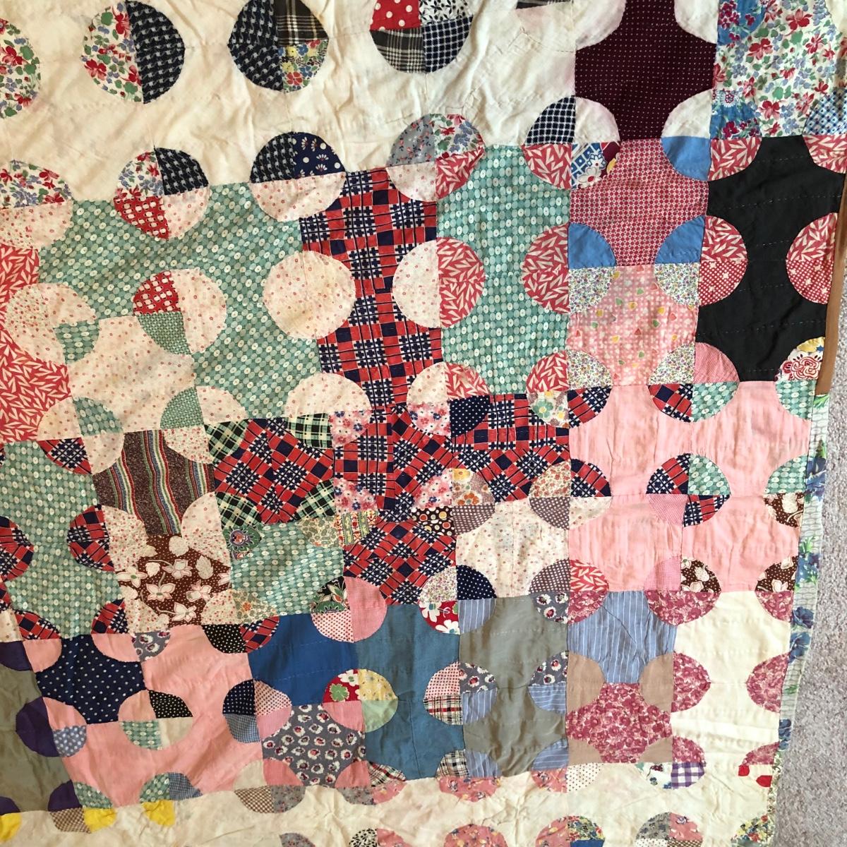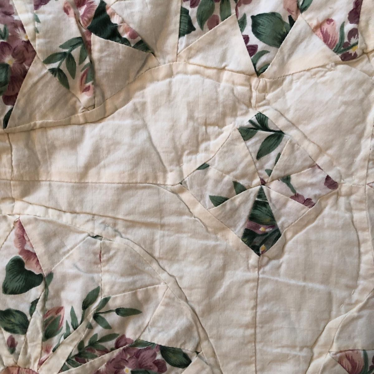 There are 4 handmade quilts in this lot with all of them but one having two different sides. The first quilt has long pieces of colorful fabric pieces on one side and brown and orange stars on the other side. It measures 61” x 79”. The second quilt has a blue background with different colored squares on one side and a green background with white flowers on the other. It measures 63.5” x 76”. The third quilt has little mult-colored squares on one side and multi-colored circles on the other side. It measures 60” x 81.5”. The last quilt has a off-white background with pointed flowers on the top side and scalloped edges.This last quilt measures 79” x 81.5”. Each quilt is a work of art. Shipping Available.
