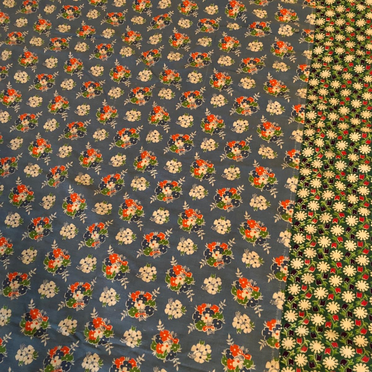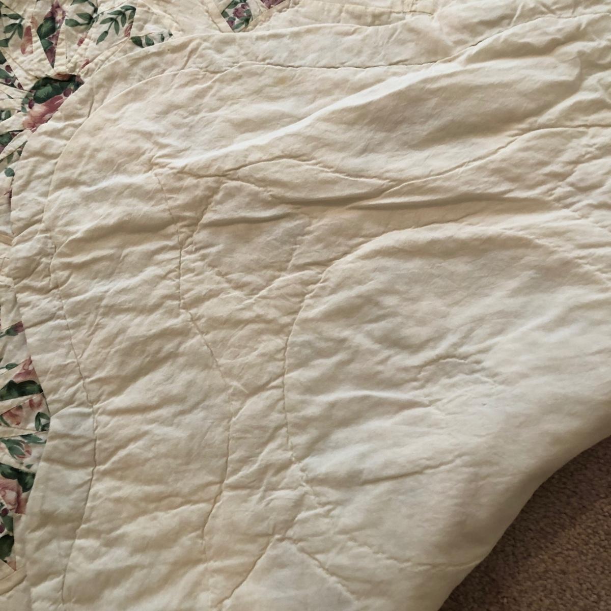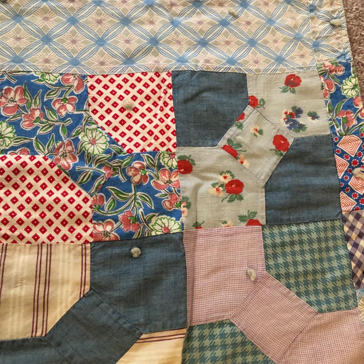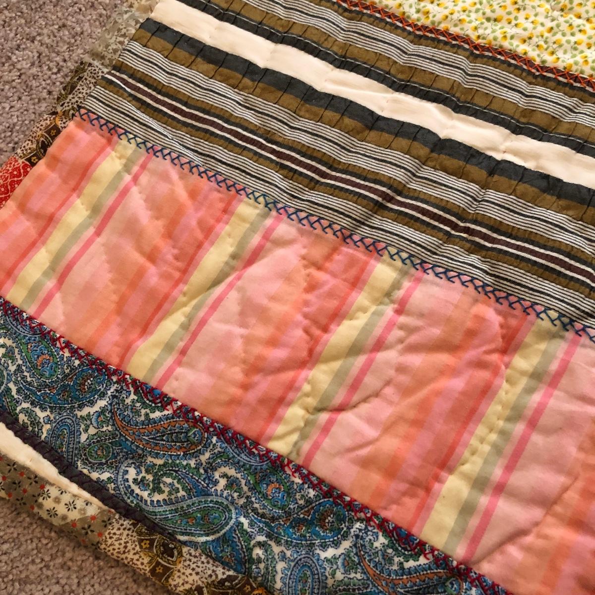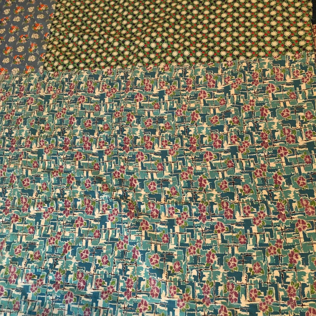 There are 4 handmade quilts in this lot with all of them but one having two different sides. The first quilt has long pieces of colorful fabric pieces on one side and brown and orange stars on the other side. It measures 61” x 79”. The second quilt has a blue background with different colored squares on one side and a green background with white flowers on the other. It measures 63.5” x 76”. The third quilt has little mult-colored squares on one side and multi-colored circles on the other side. It measures 60” x 81.5”. The last quilt has a off-white background with pointed flowers on the top side and scalloped edges.This last quilt measures 79” x 81.5”. Each quilt is a work of art. Shipping Available.
