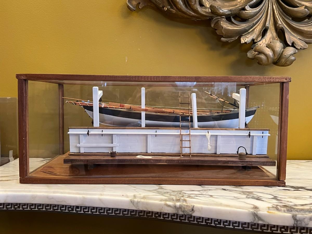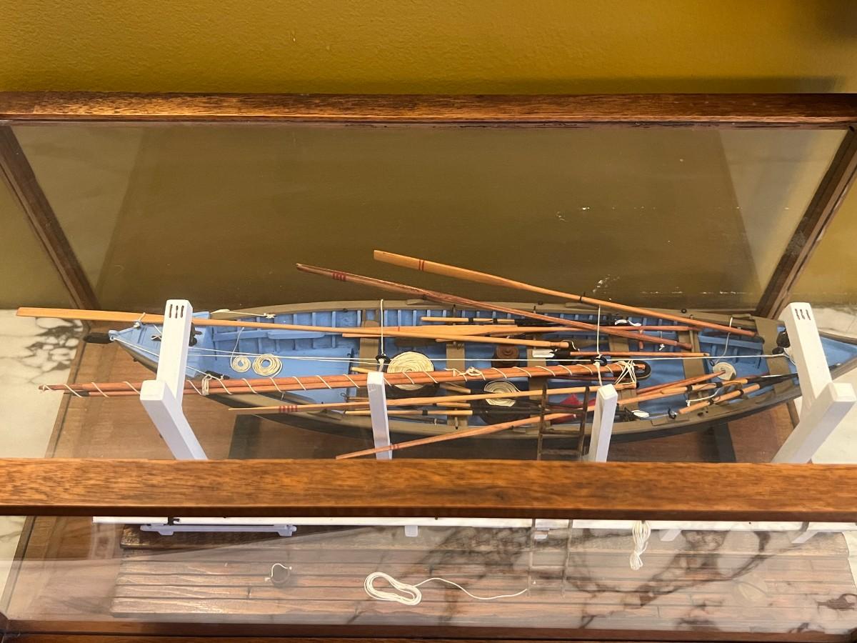 Handmade and Painted Wooden Ship Model with Glass Display Case