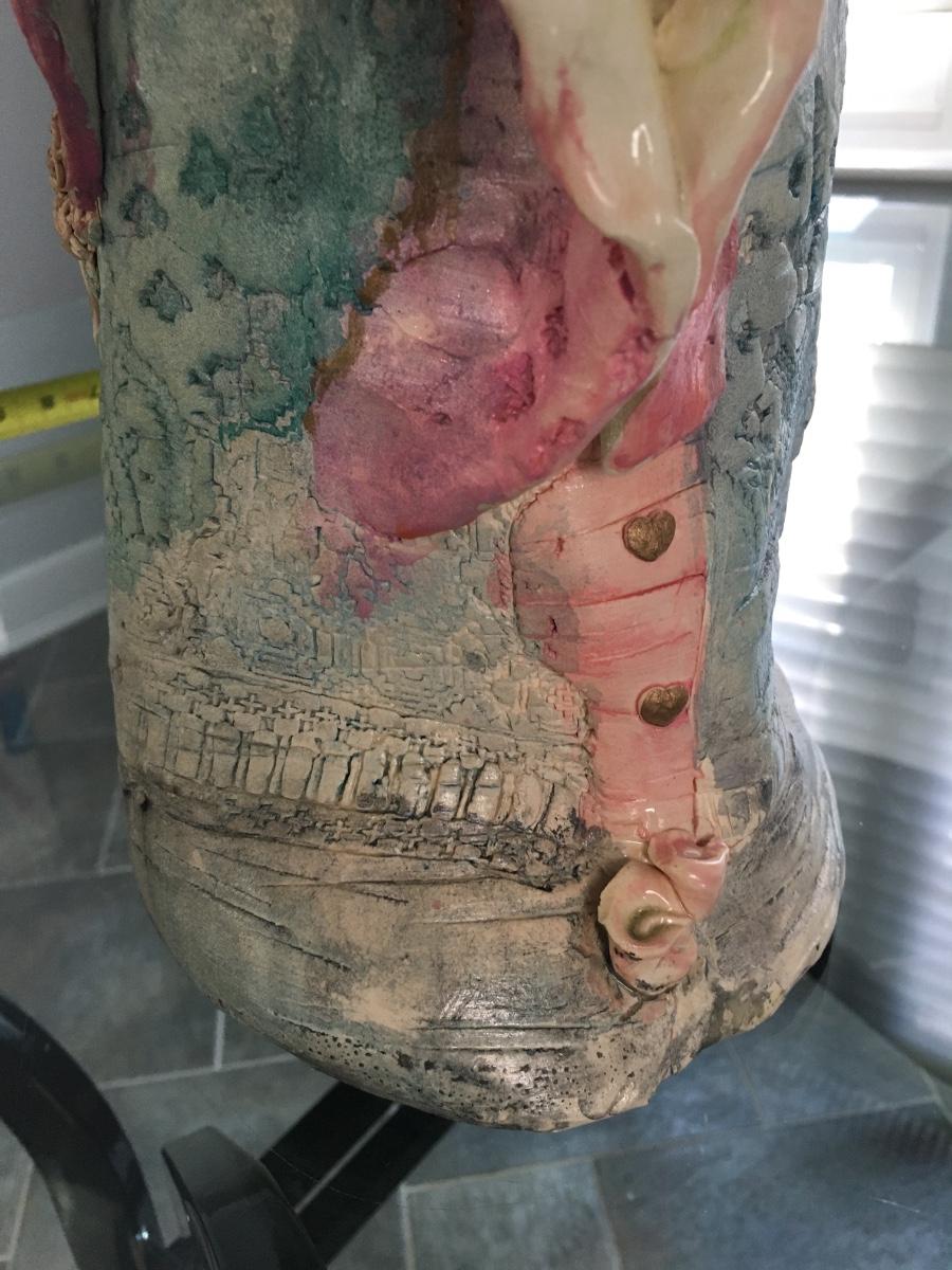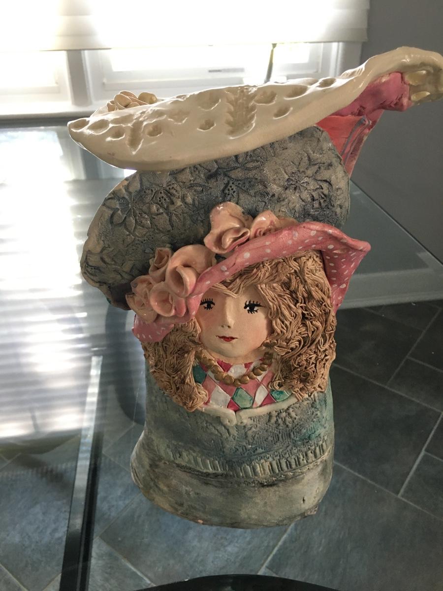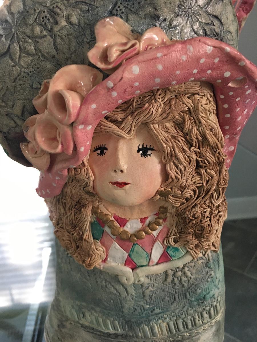 Ceramic art vase with young girl in hat featered as well as other flourishes . No signature.