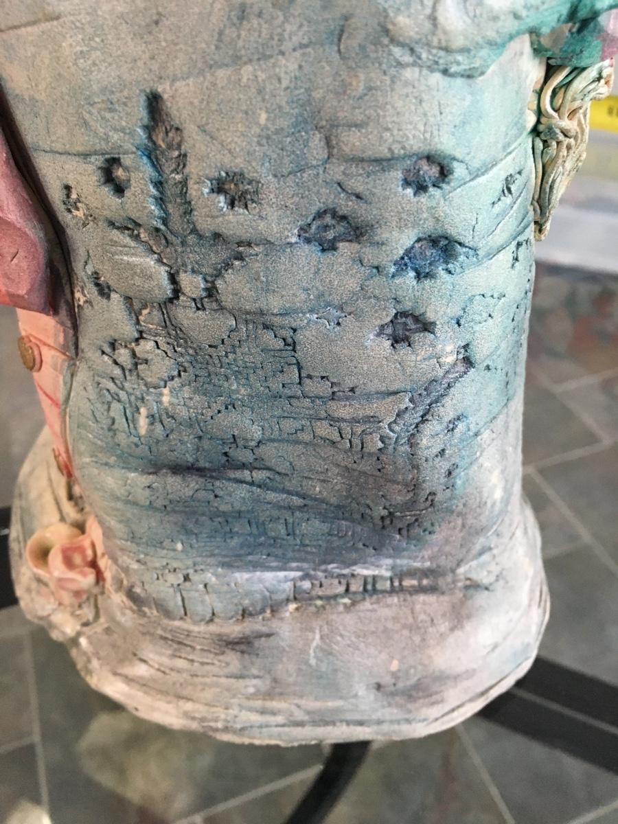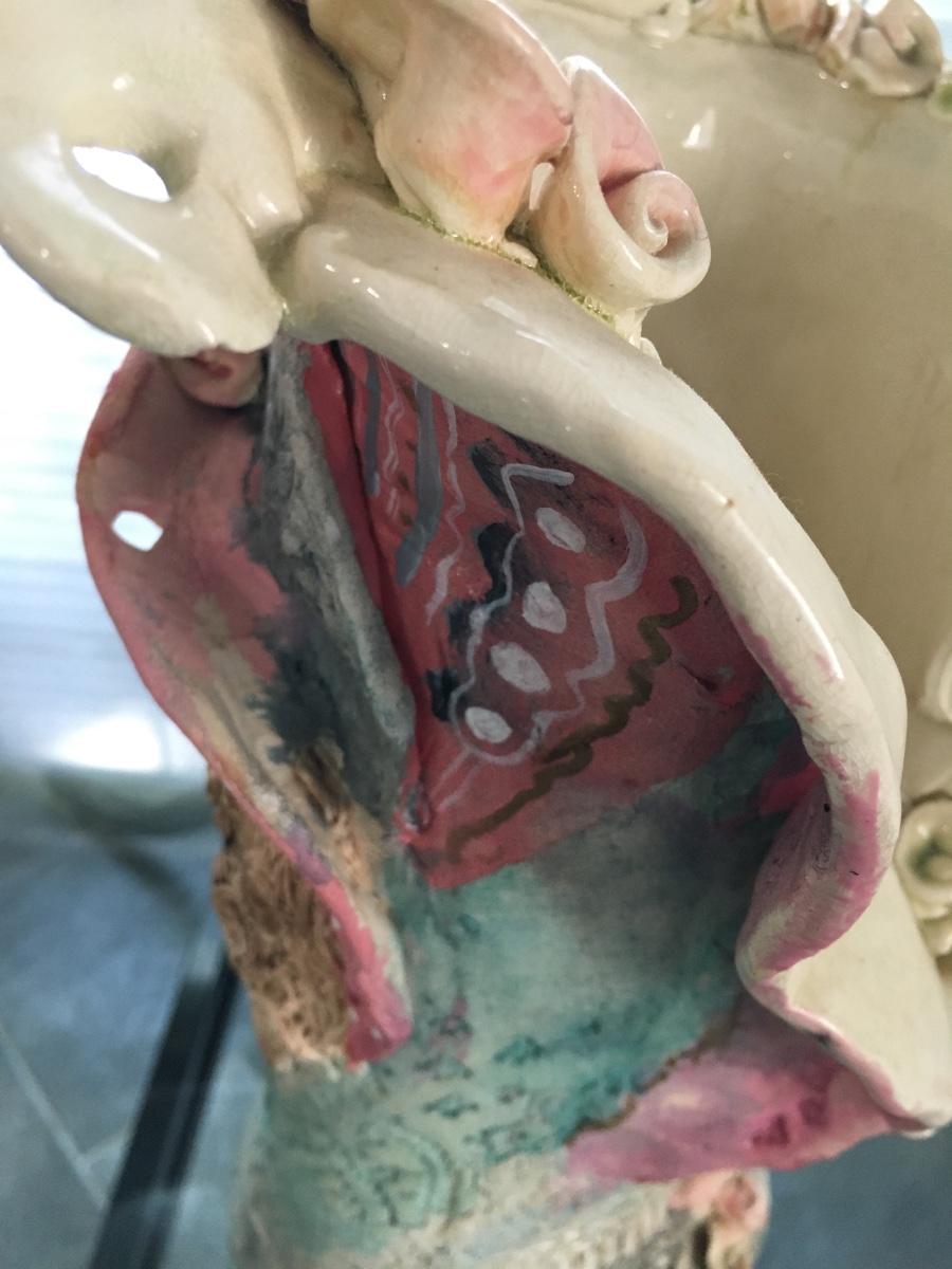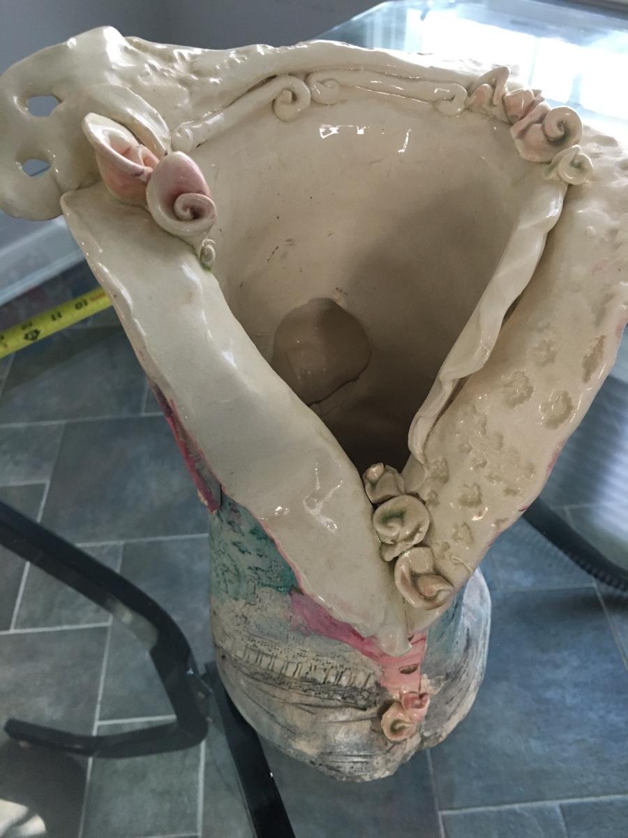 Ceramic art vase with young girl in hat featered as well as other flourishes . No signature.