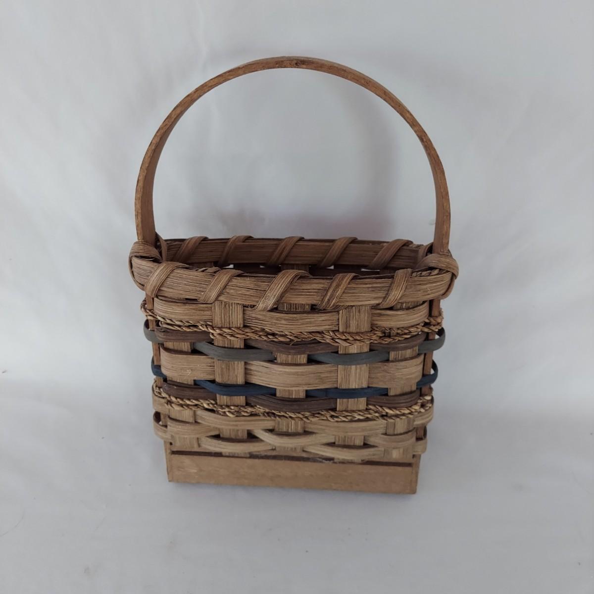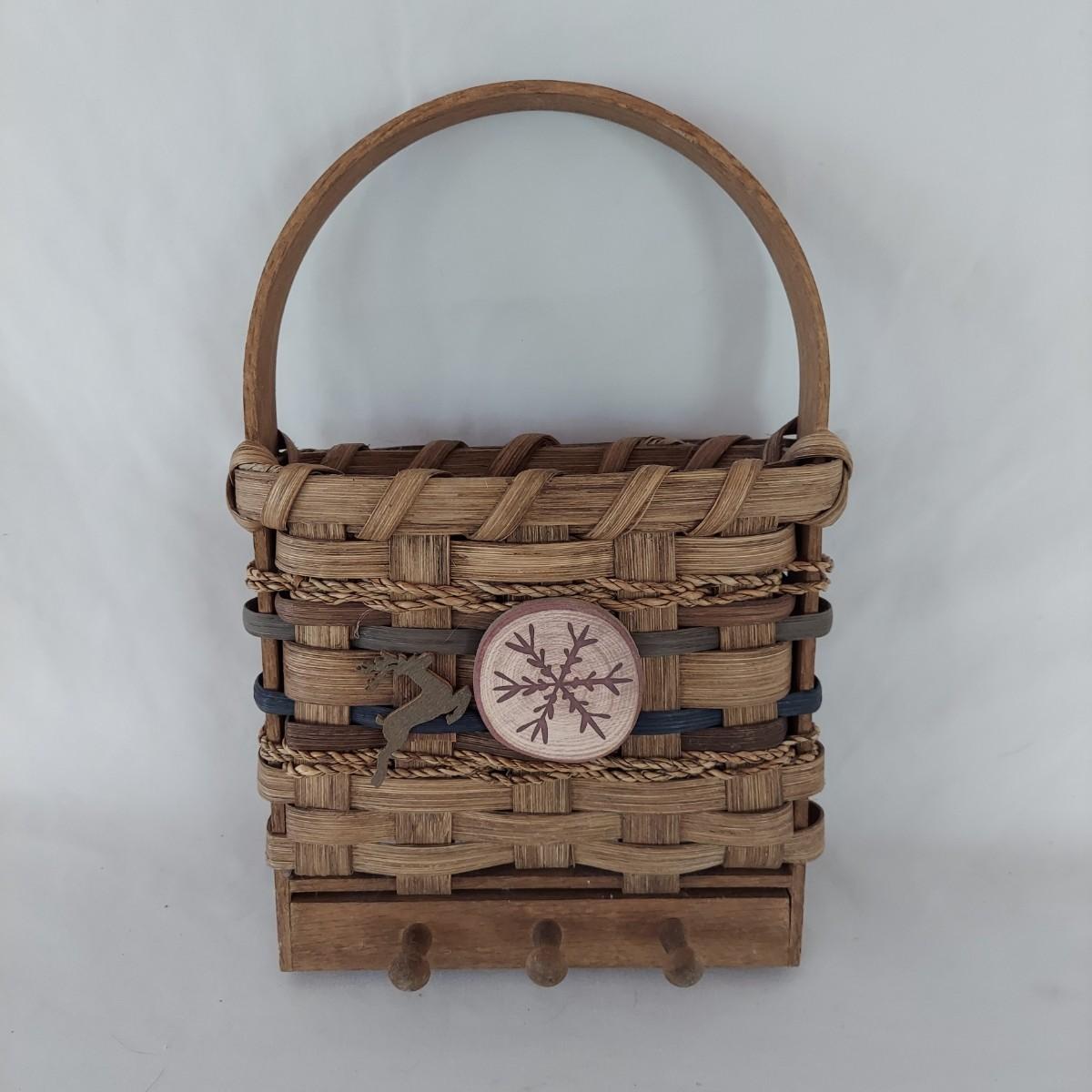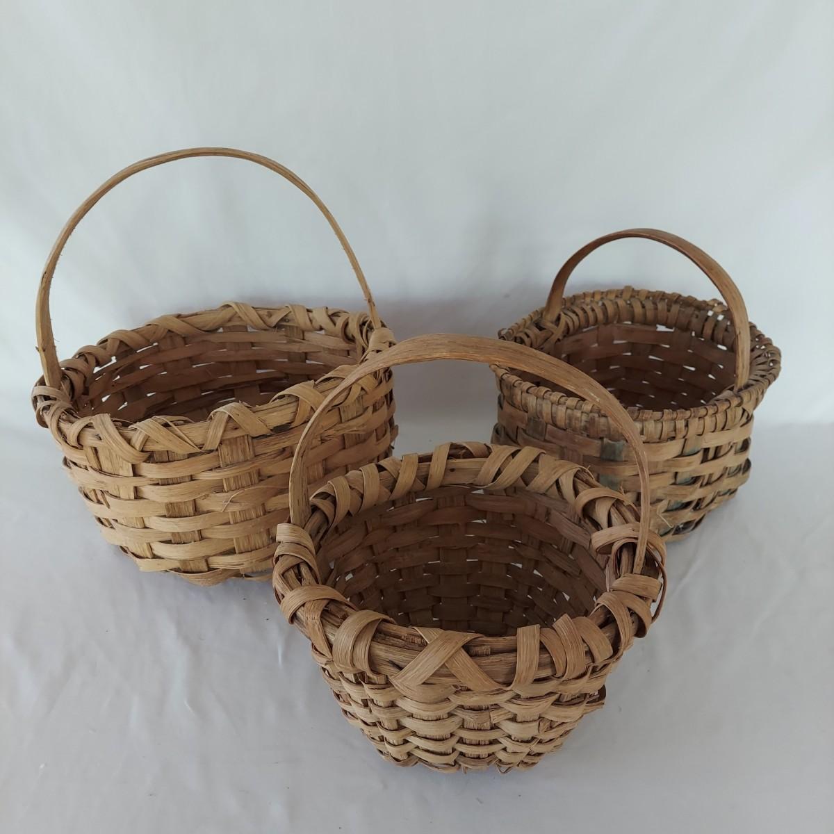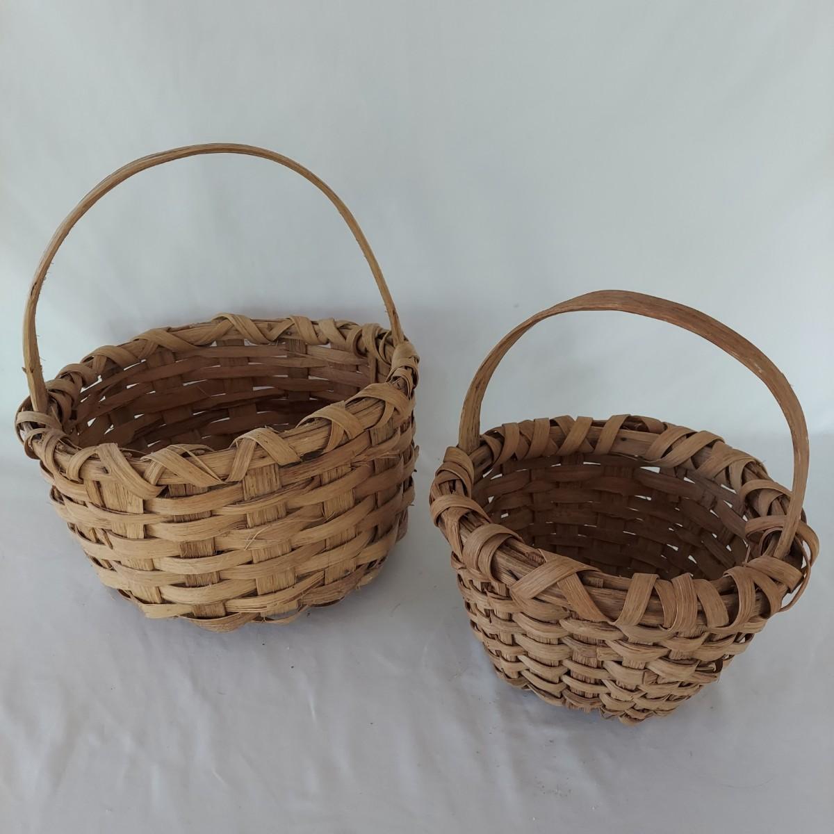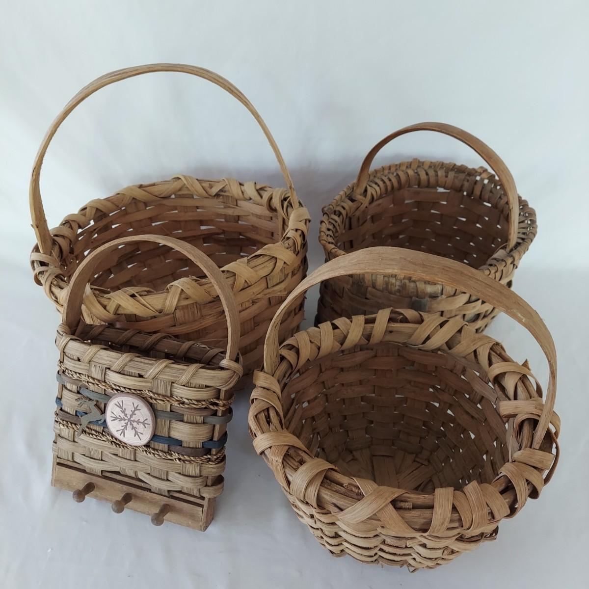 Four small to medium handmade baskets. The larger of the two matching baskets is 11" across and 7" deep. The small wall hanging holiday themed basket is 6" x 2.5" x 11"H. Shipping available.