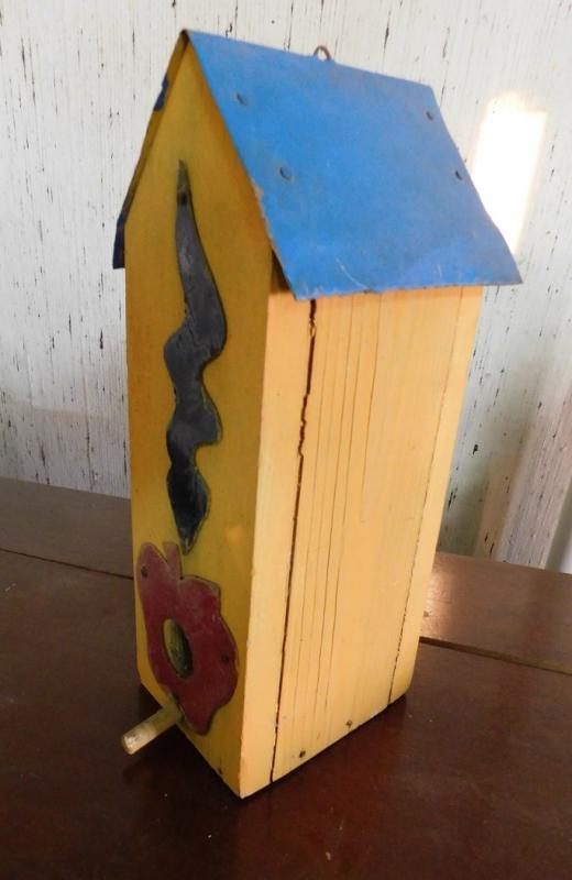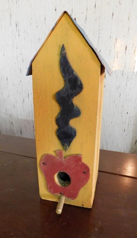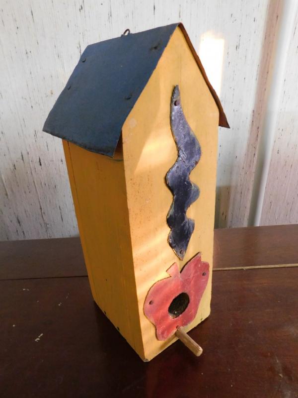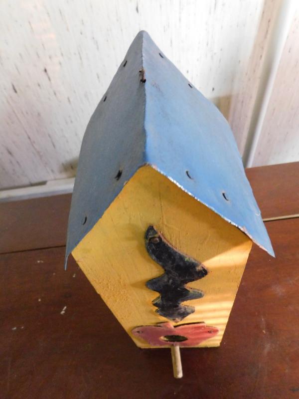 Handmade Birthhouse from Wood and Metal Cutouts has some drying cracks.