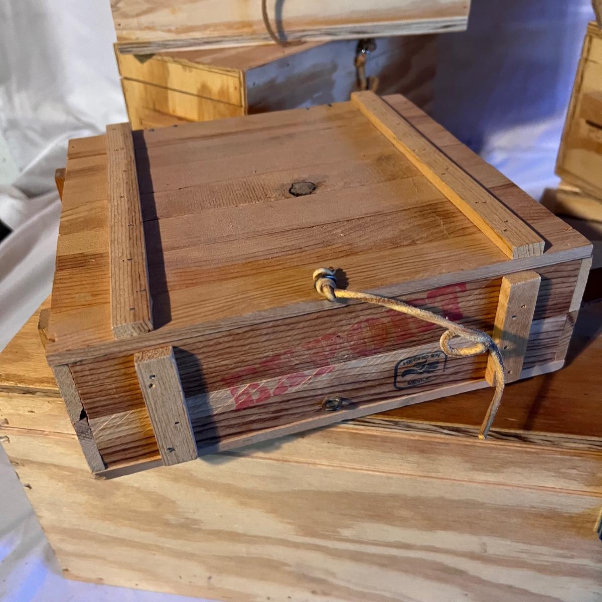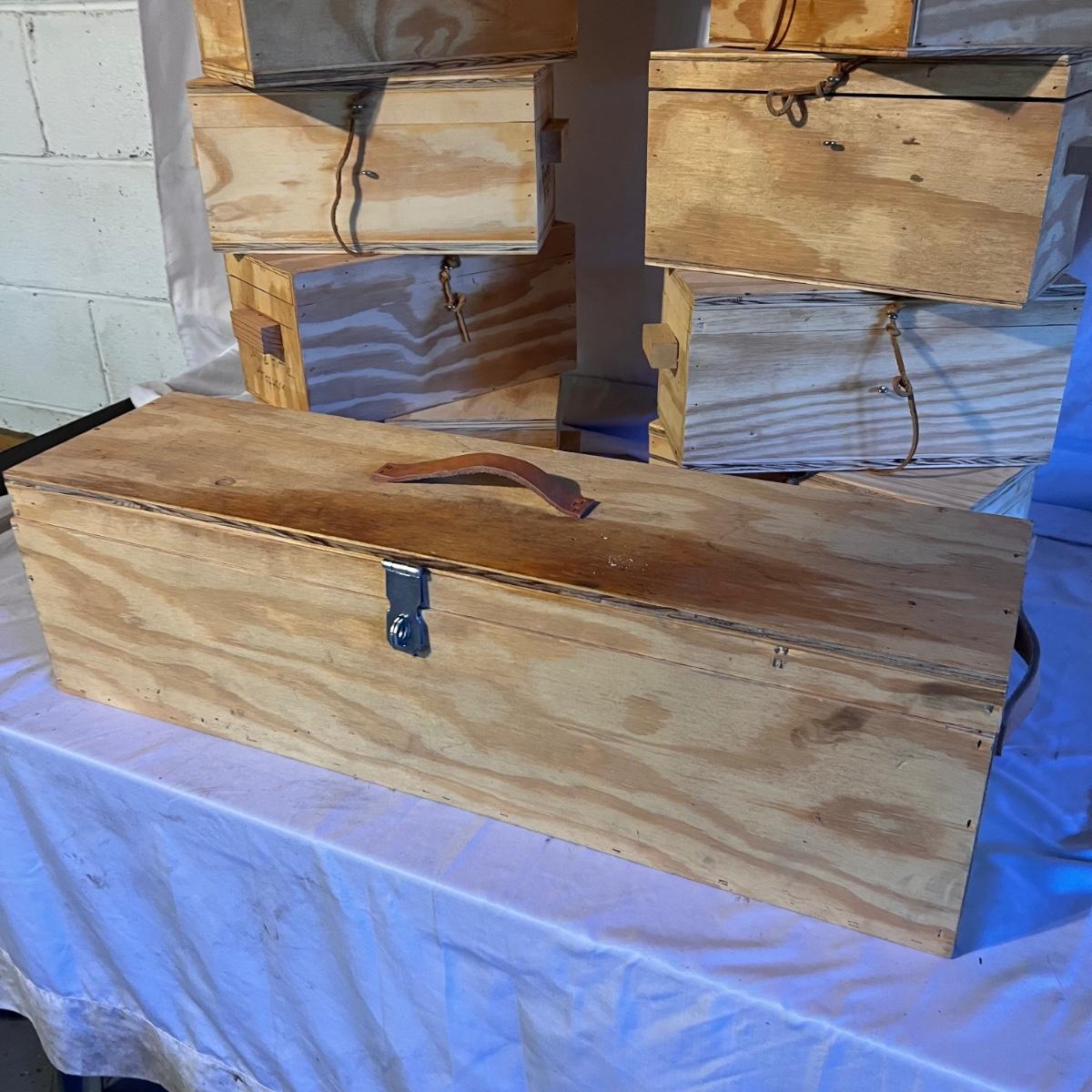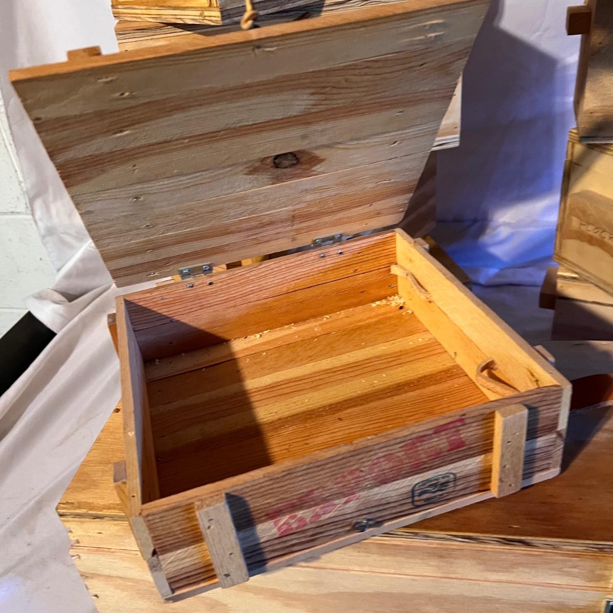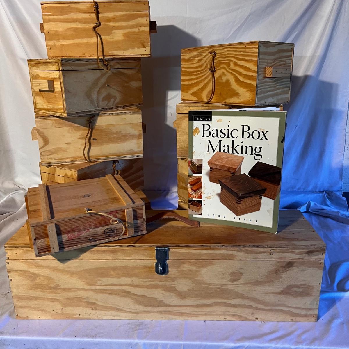 Eleven handmade boxes that all have hinged lids and leather cords to latch. Nine are all the same, plus a smaller square box and a larger box that would make a great tool box which measures 28” x 7” x 8”H.