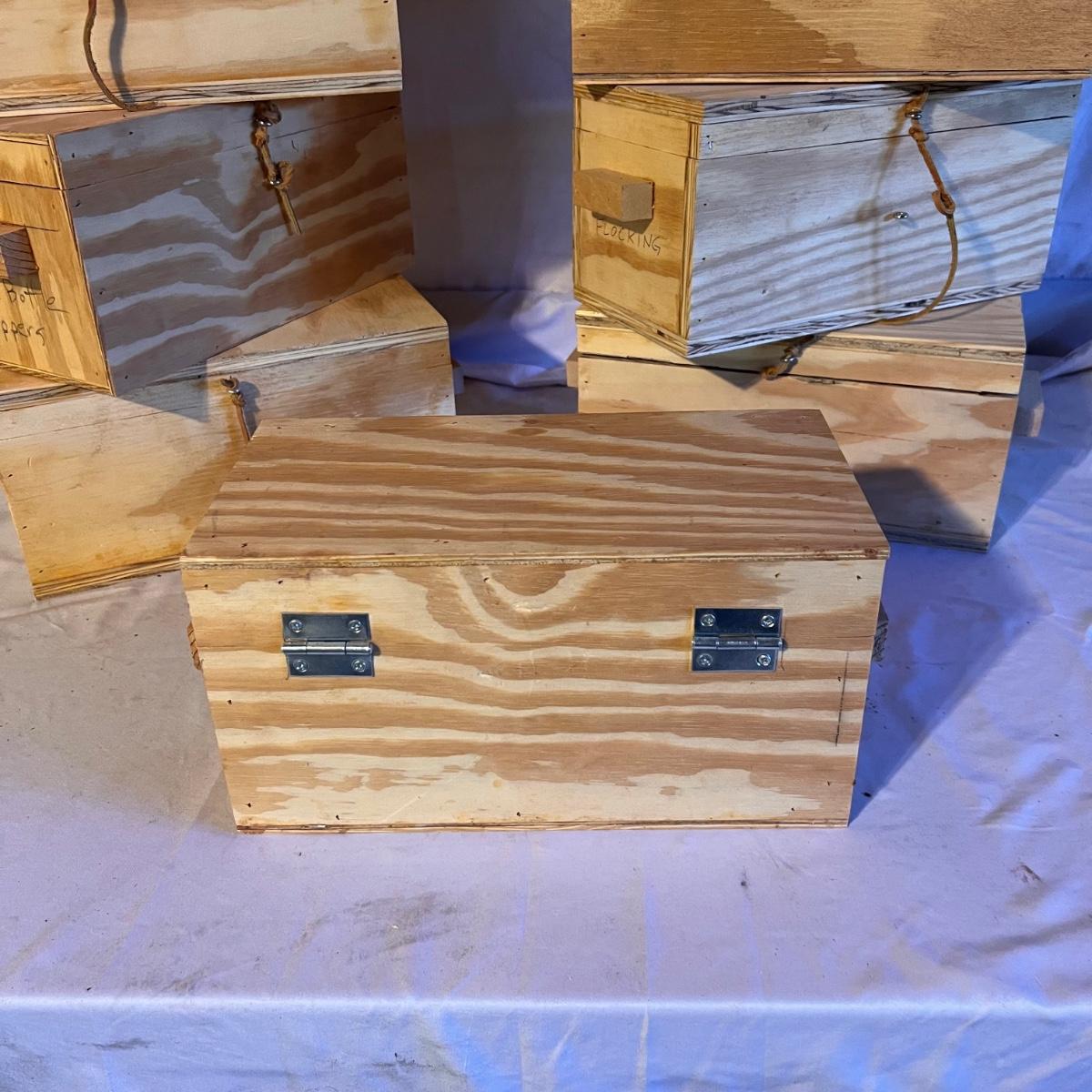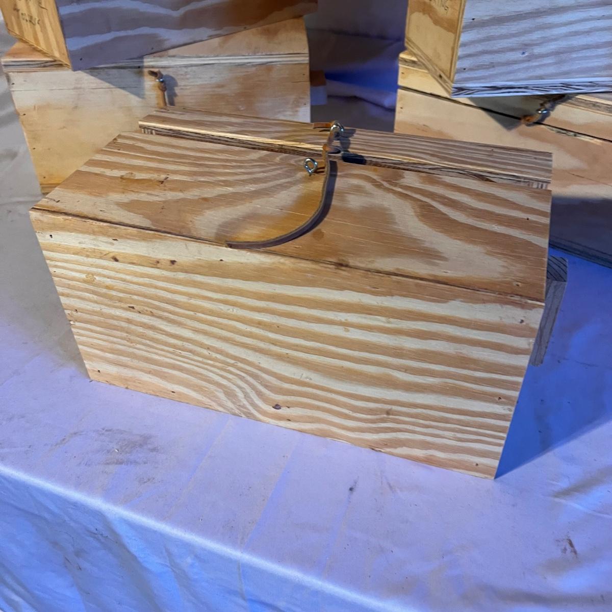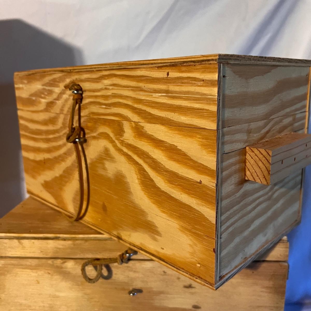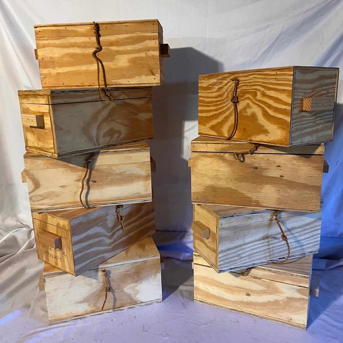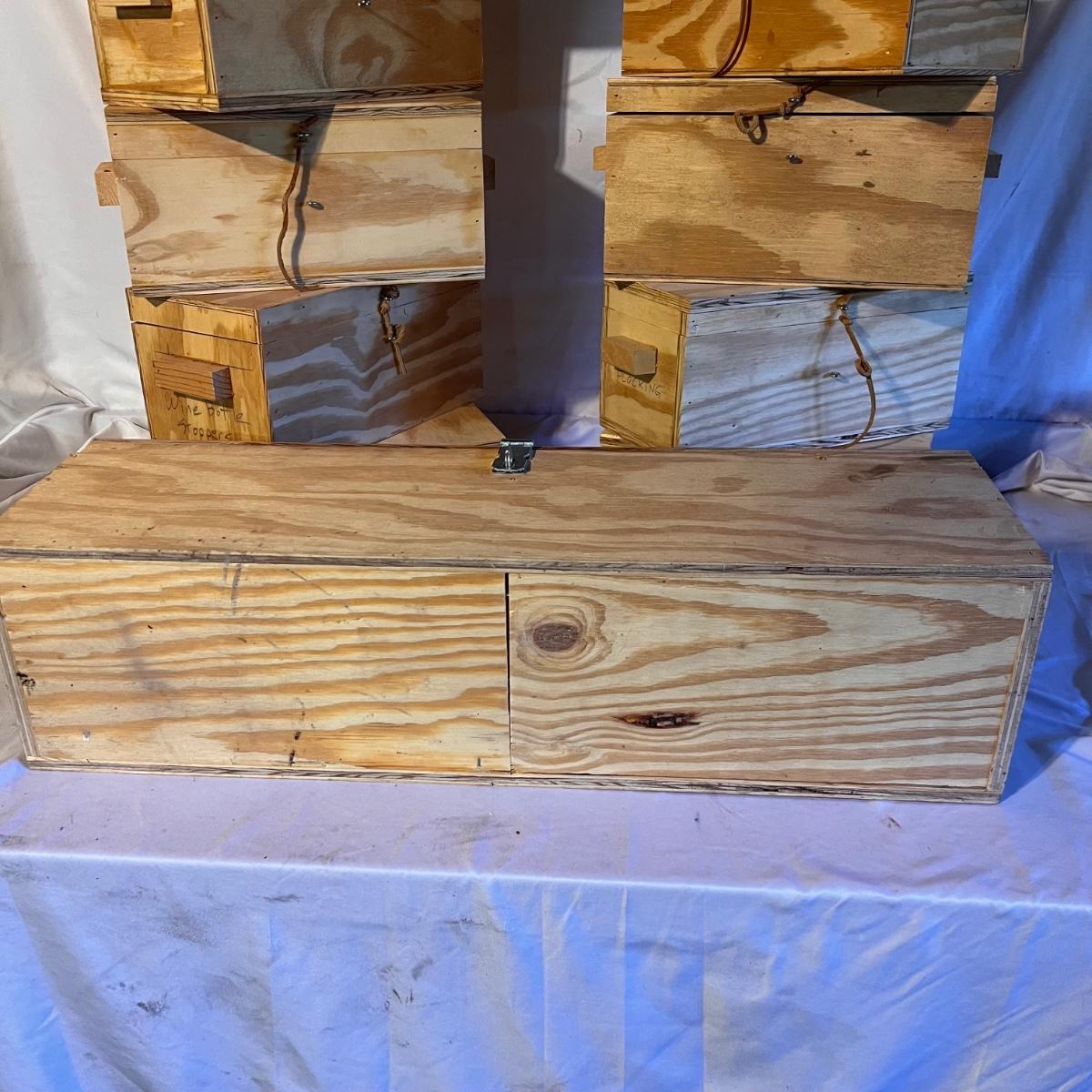 Eleven handmade boxes that all have hinged lids and leather cords to latch. Nine are all the same, plus a smaller square box and a larger box that would make a great tool box which measures 28” x 7” x 8”H.