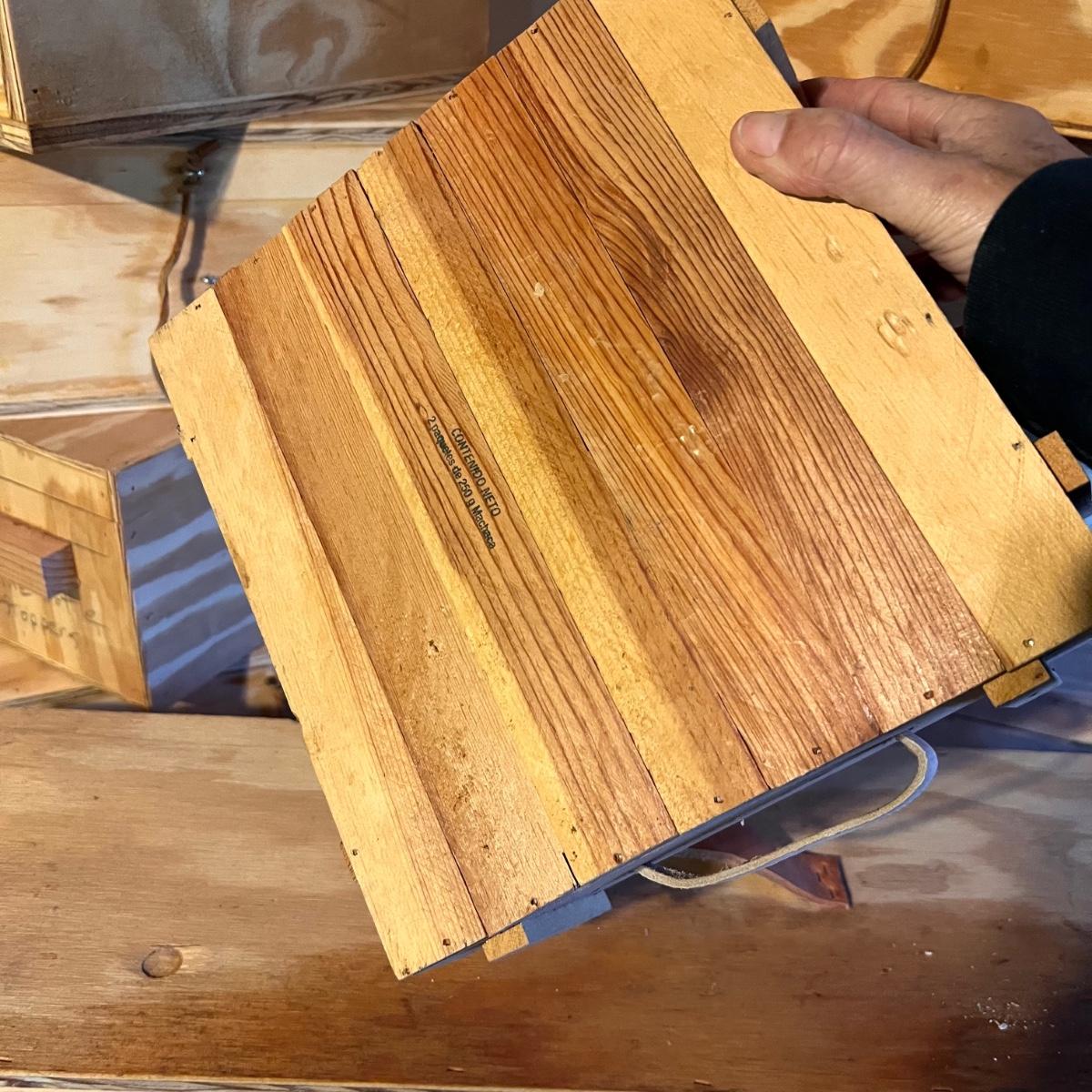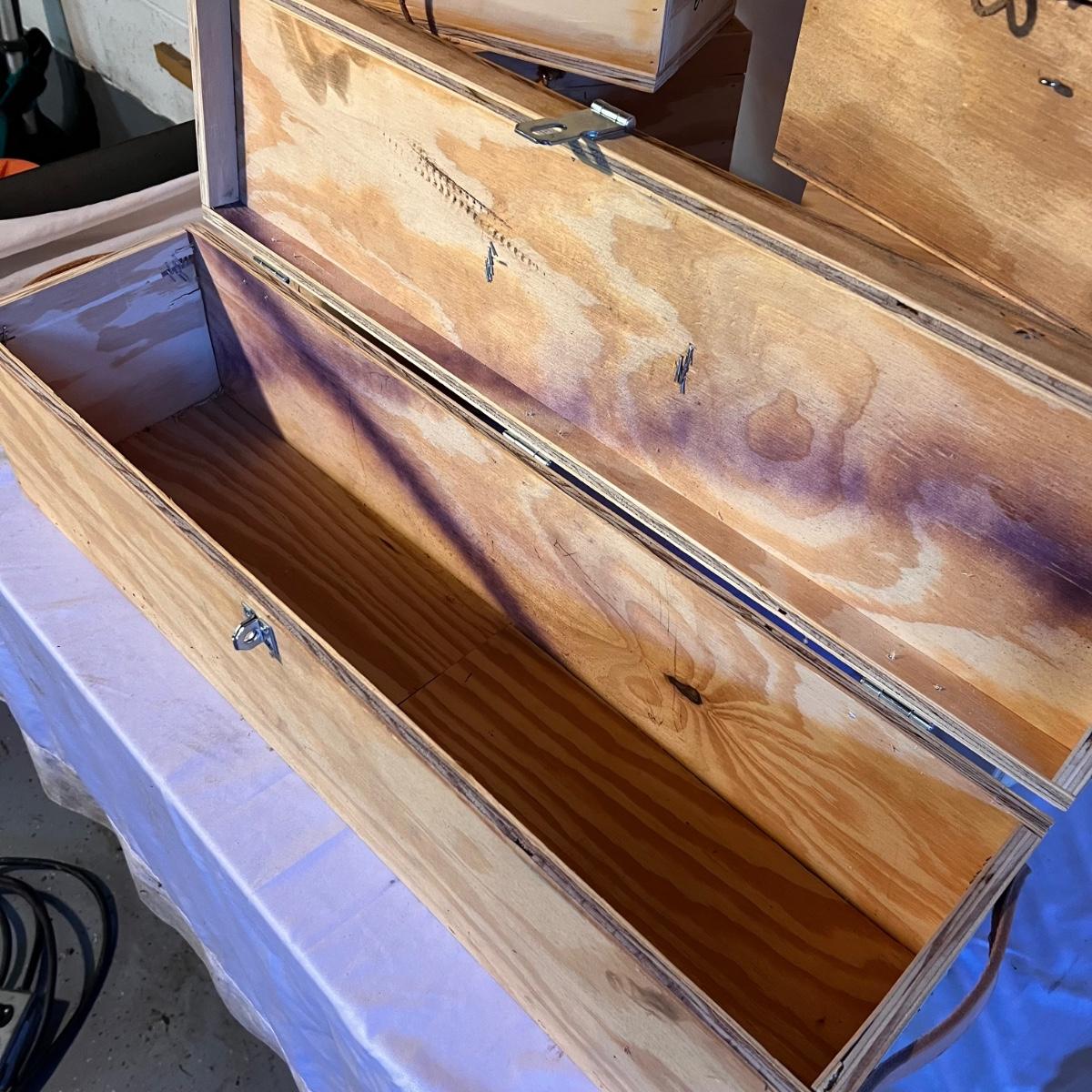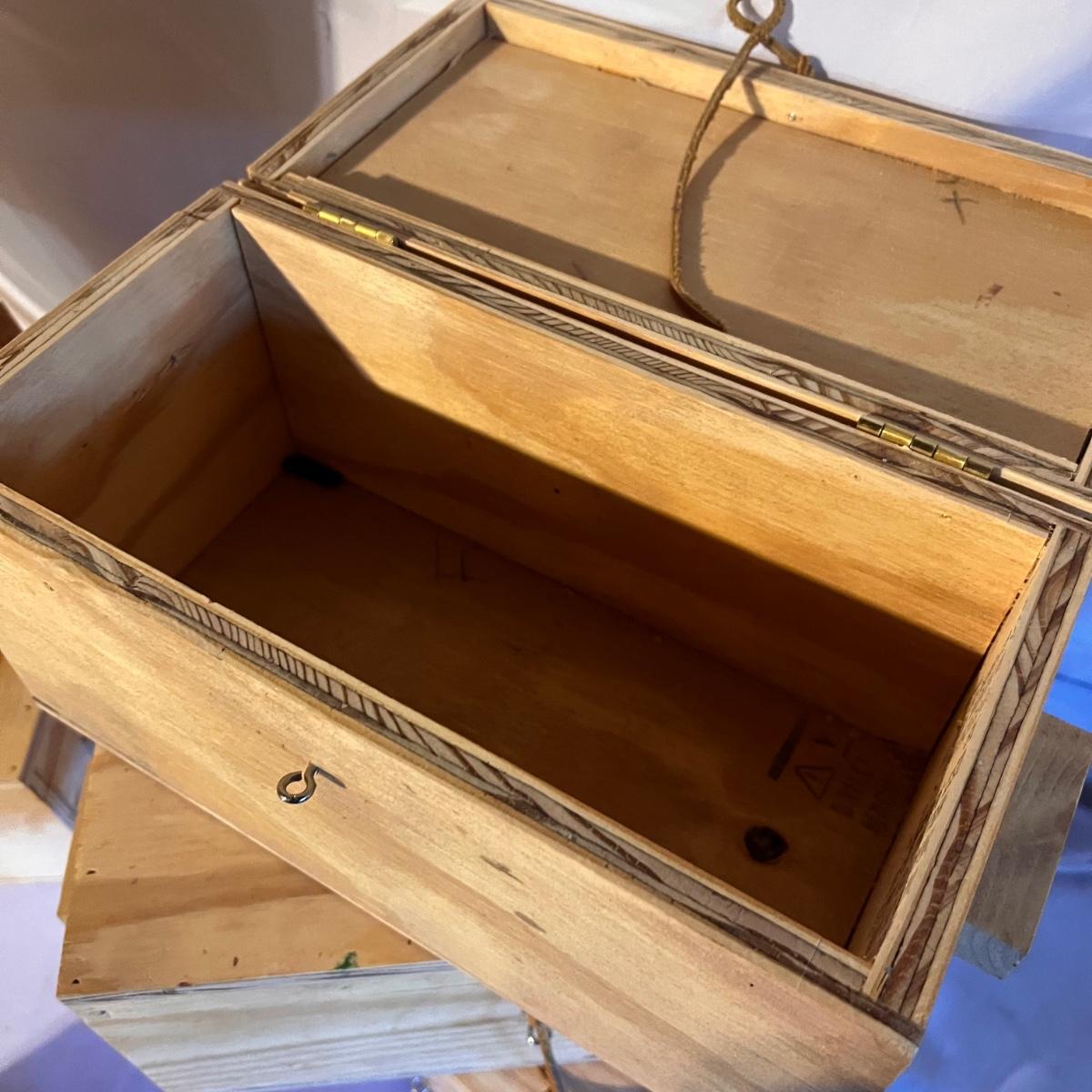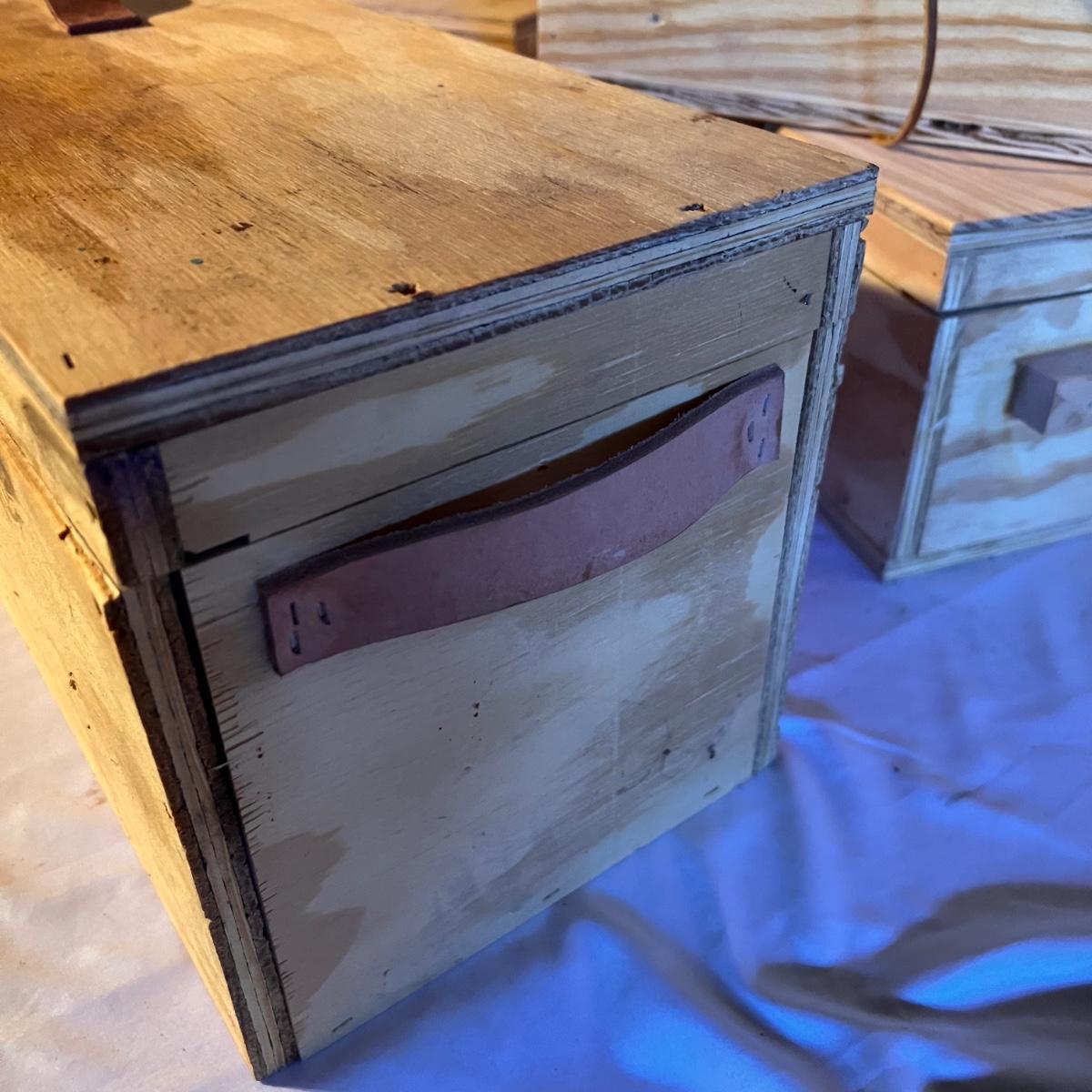 Eleven handmade boxes that all have hinged lids and leather cords to latch. Nine are all the same, plus a smaller square box and a larger box that would make a great tool box which measures 28” x 7” x 8”H.