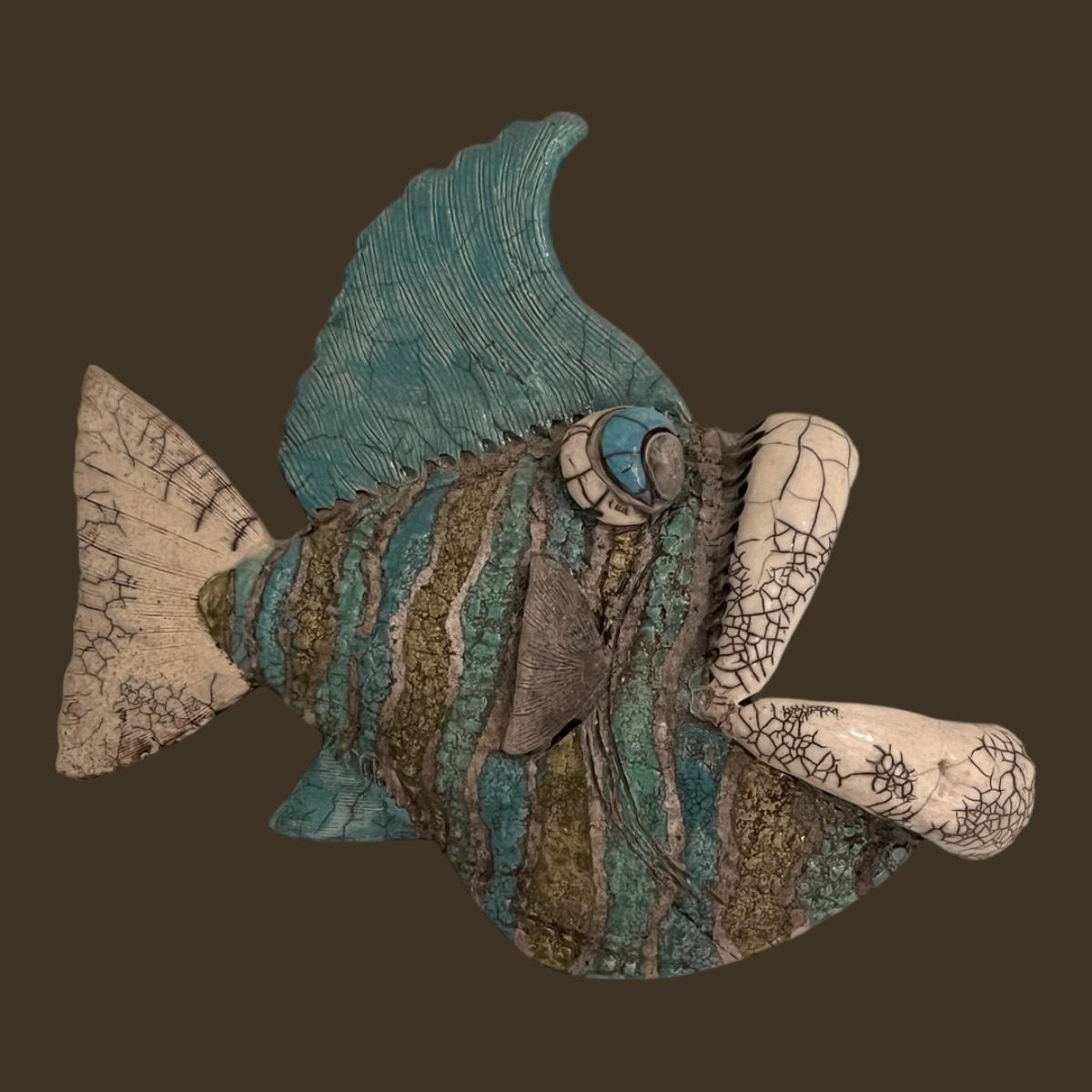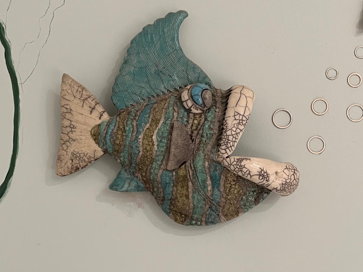 15.5"w x 14"h"--creative and whimsical handmade ceramic fish. This is a wall hanging and mounts easily. Perfect decor for a bathroom, powder room, Florida room, porch or patio.