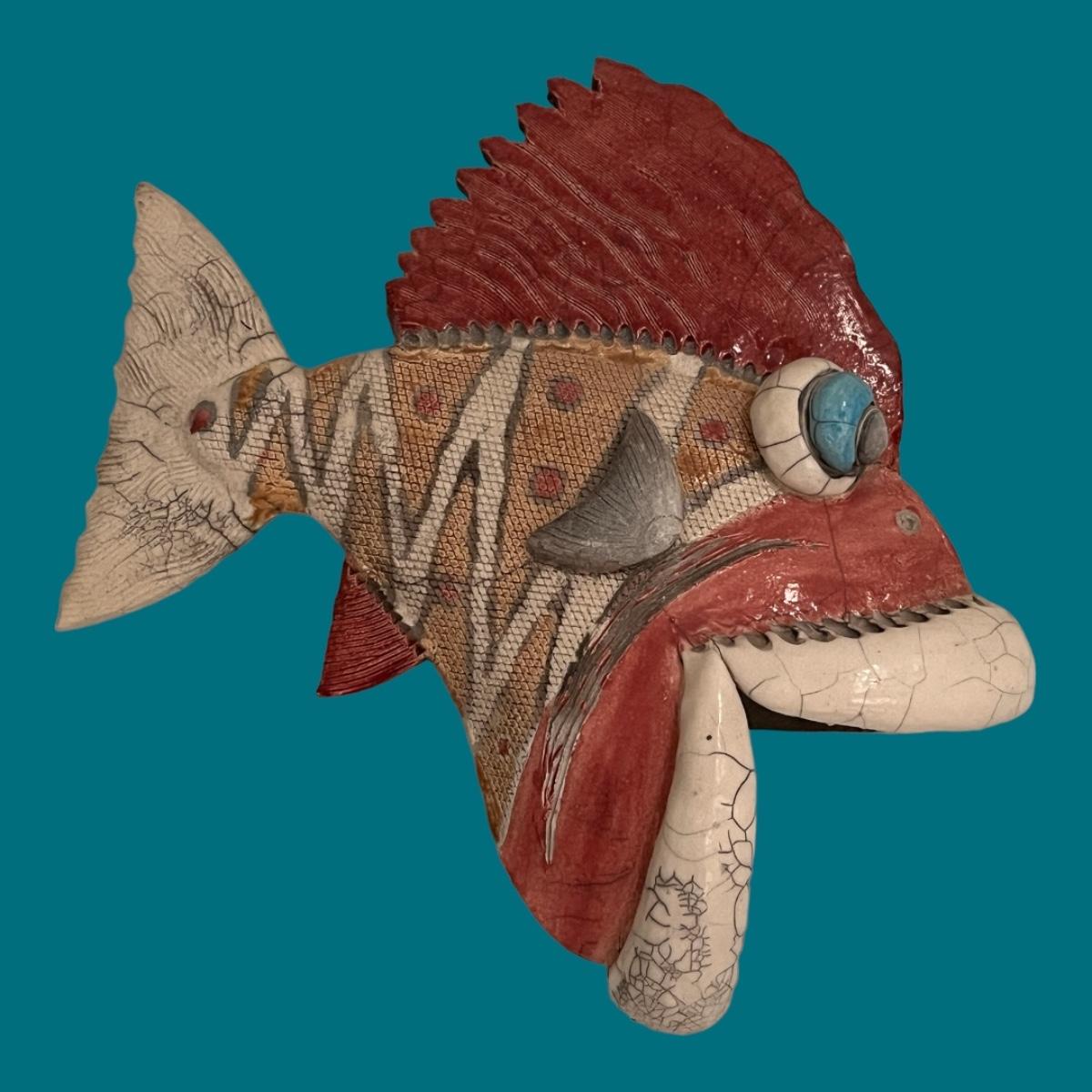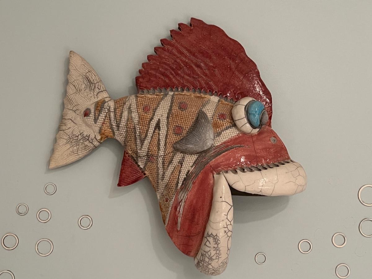 17"w x 18"h"--creative and whimsical handmade ceramic fish. This is a wall hanging and mounts easily. Perfect decor for a bathroom, powder room, Florida room, porch or patio.