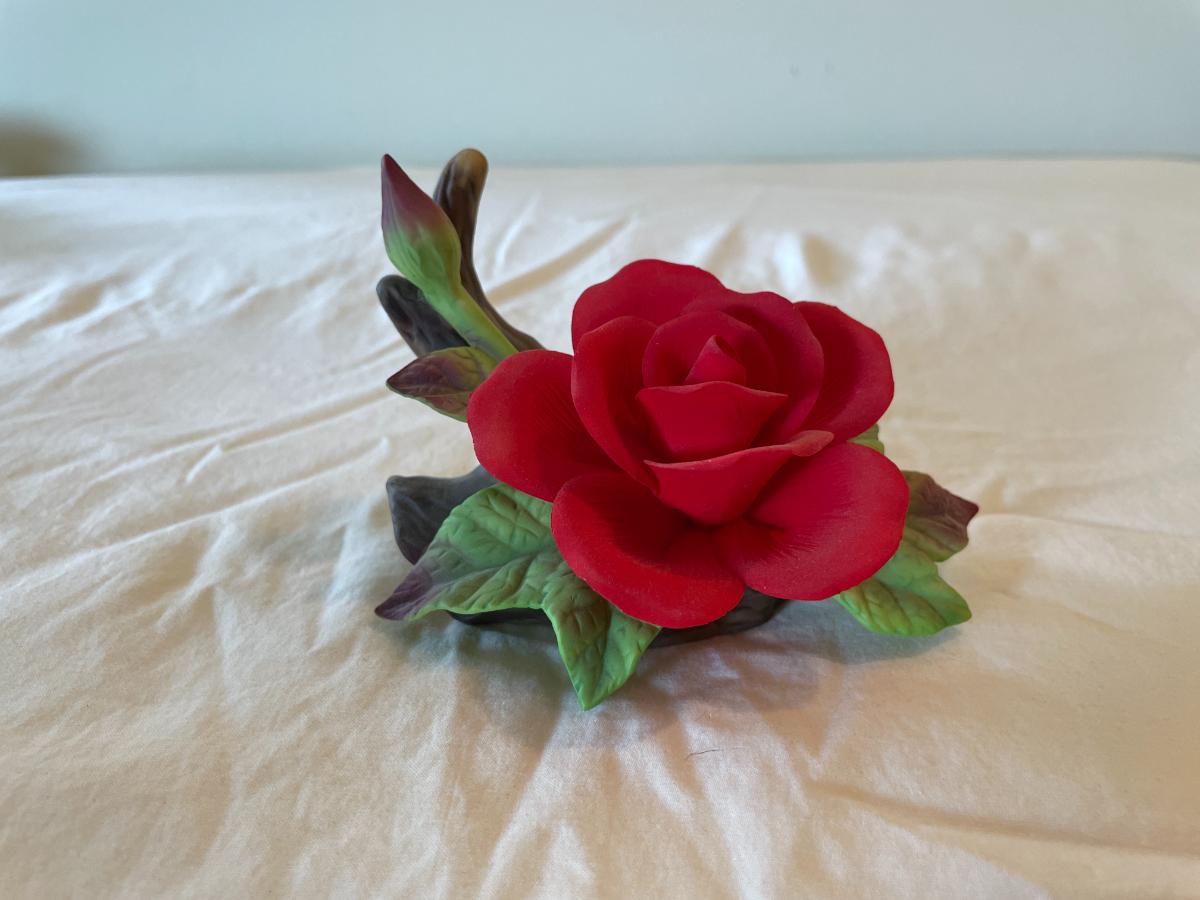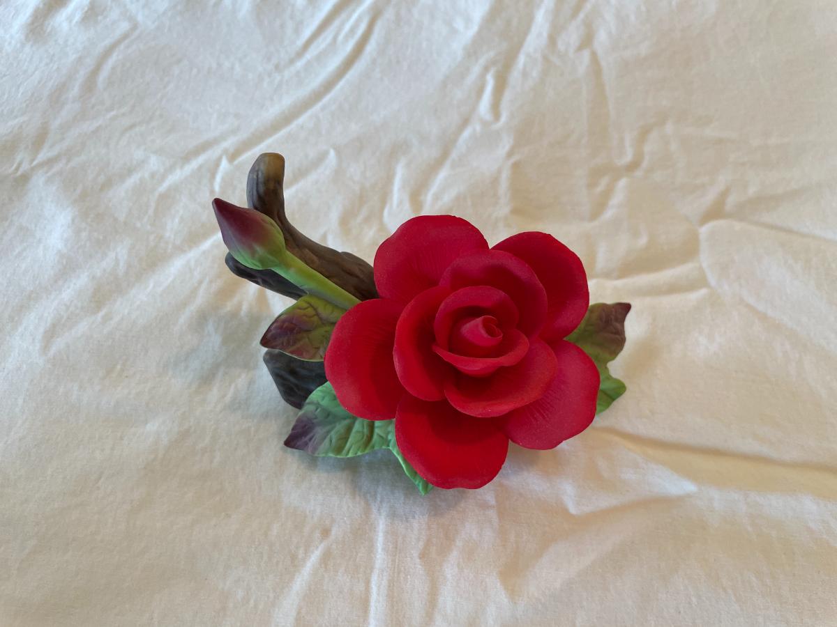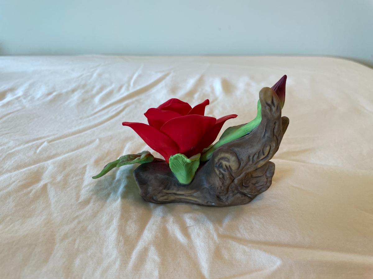 Handcrafted ceramic red rose figurine resting on a detailed log-style base, adorned with green leaves and a rosebud. Has felt pads for surface protection. Measures approximately 5 inches in length.