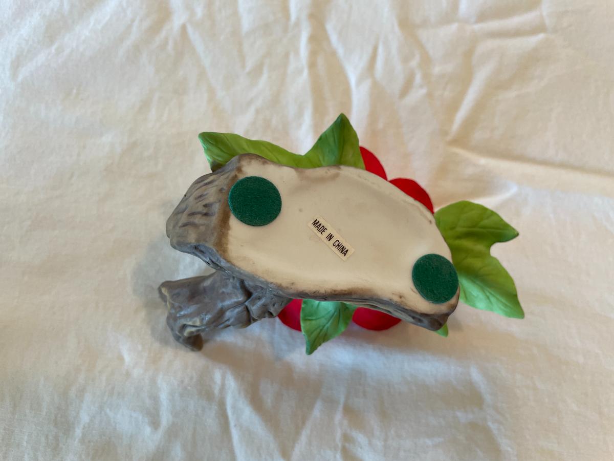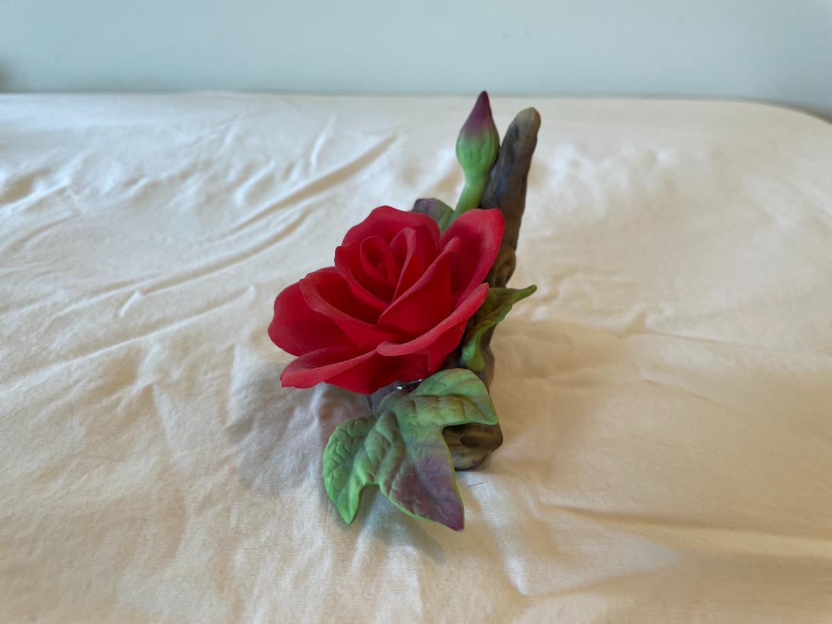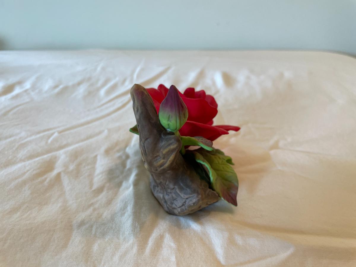 Handcrafted ceramic red rose figurine resting on a detailed log-style base, adorned with green leaves and a rosebud. Has felt pads for surface protection. Measures approximately 5 inches in length.