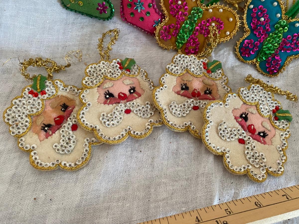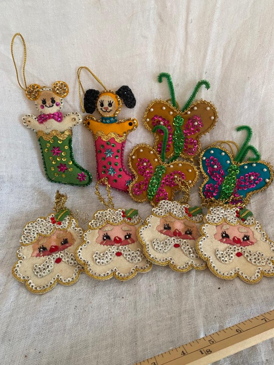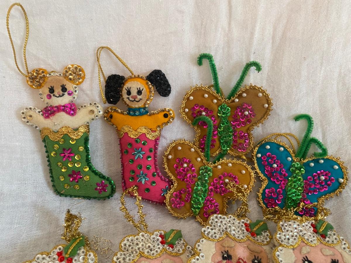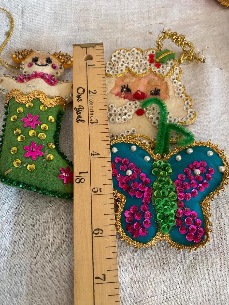 Handmade Christmas Felt/Sequin Ornaments including puppy in stocking, Santa, and butterflies. Between 2.5" and 5" long.