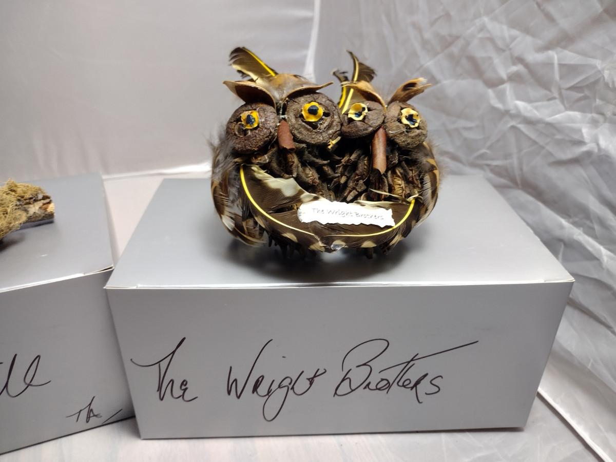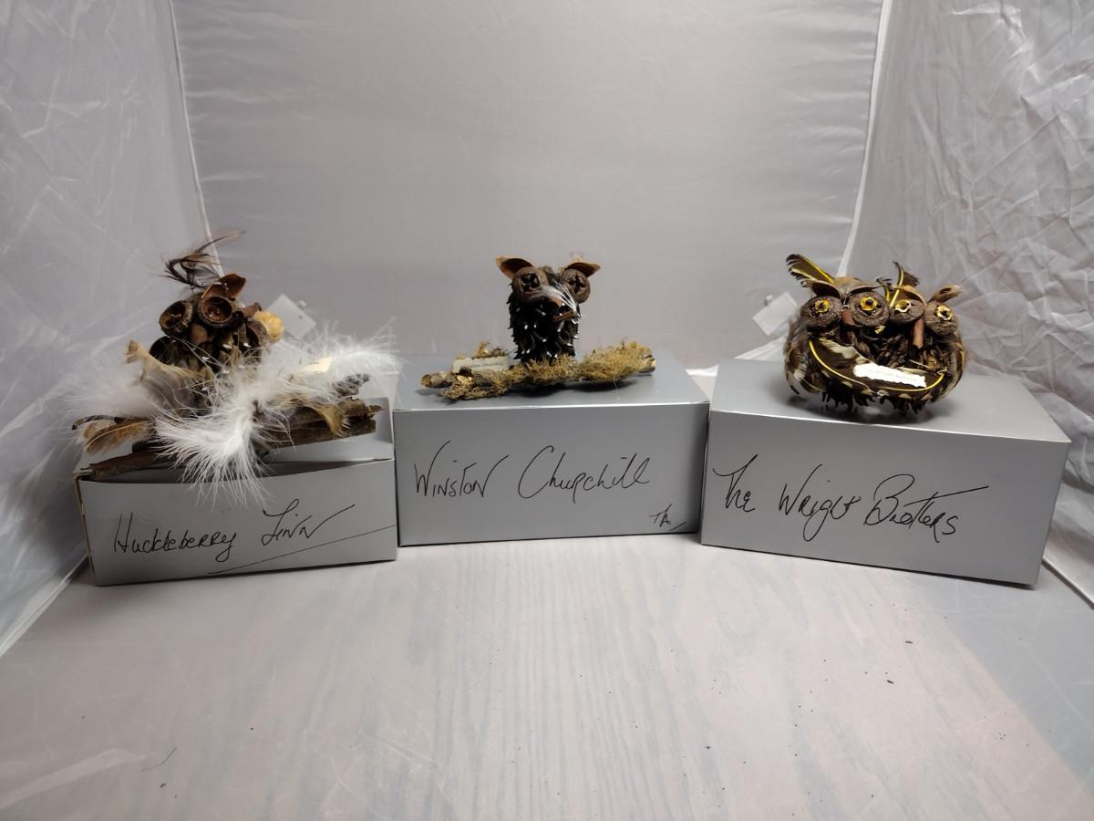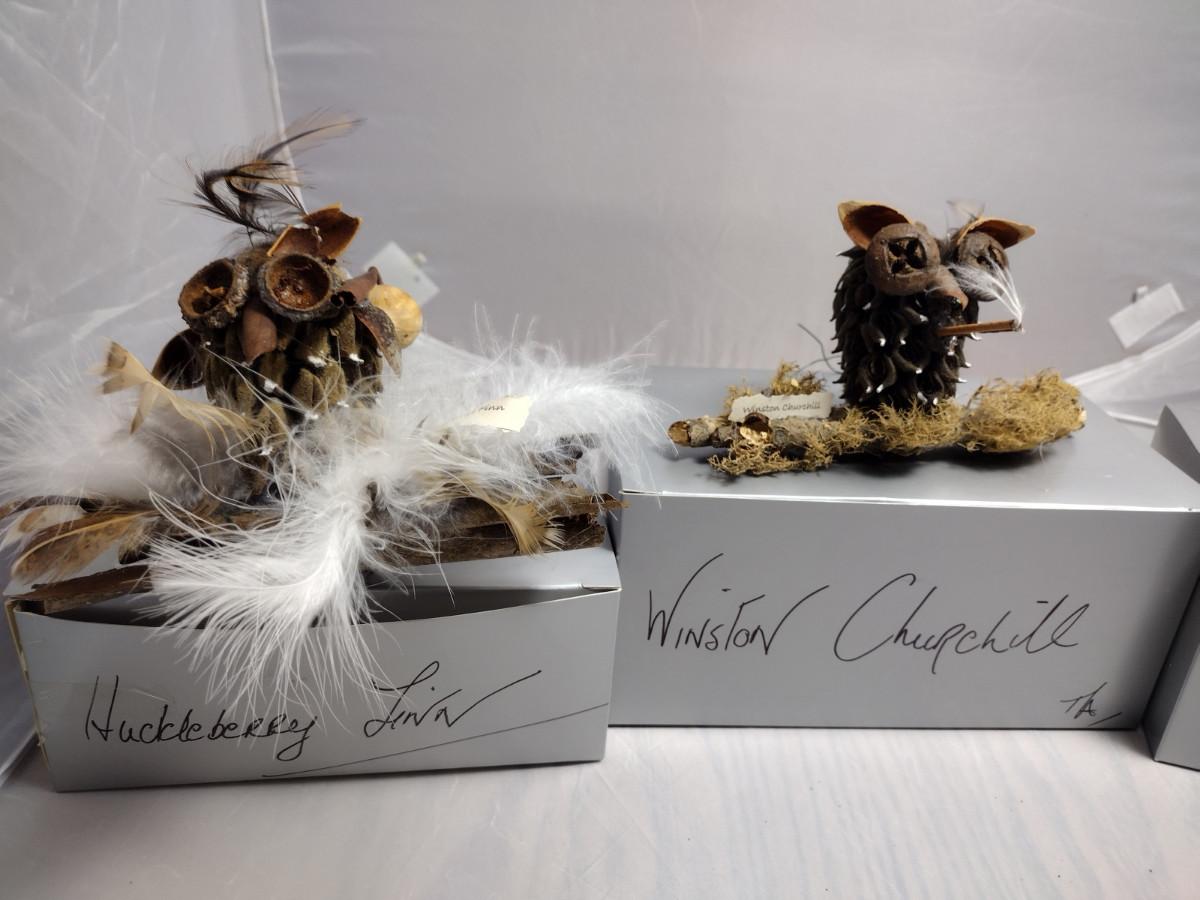 These ornaments were made by a crafting group in Henderson County, NC. Except for the wire hanger, everything is handmade. These ornaments are fragile and there are a couple that might need a little TLC with some fresh adhesive. Please see the boxes for the names of the people or characters represented by these beautiful handmade pieces!
