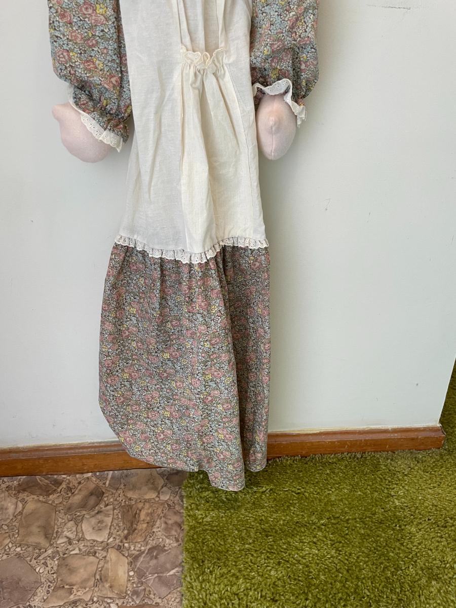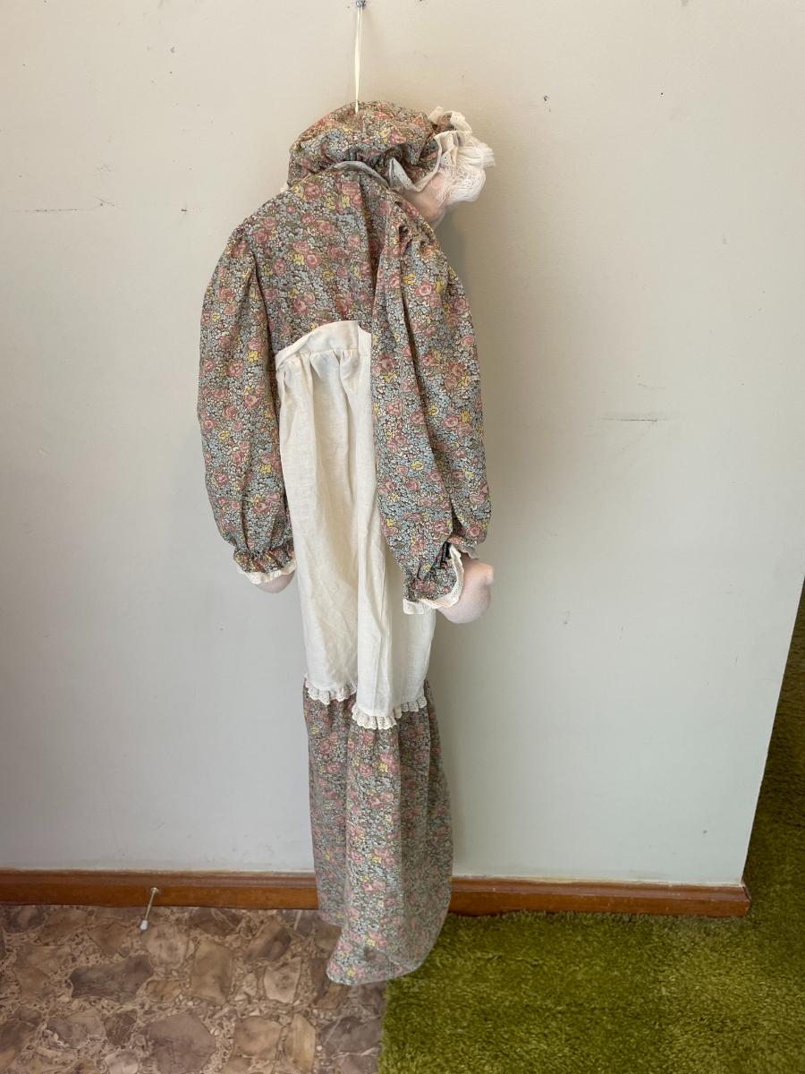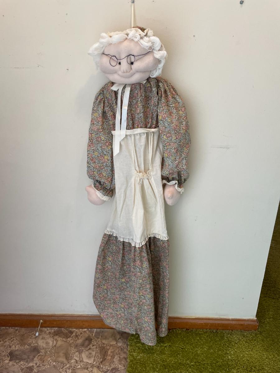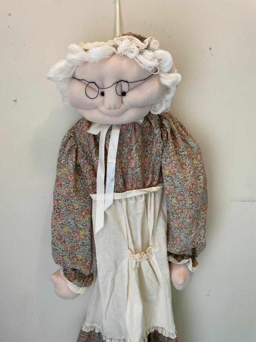 Vintage vacuum cover in the shape of a grandmother figure. Features a soft head with glasses, curly white hair, a floral long-sleeve dress, and a white apron. Designed to fit over a vacuum cleaner, providing a decorative element.
