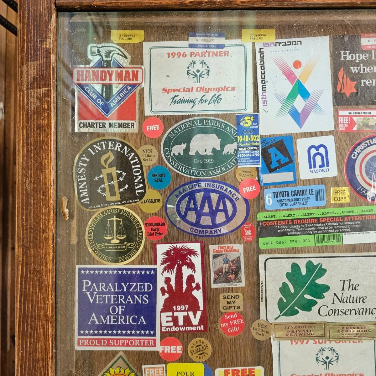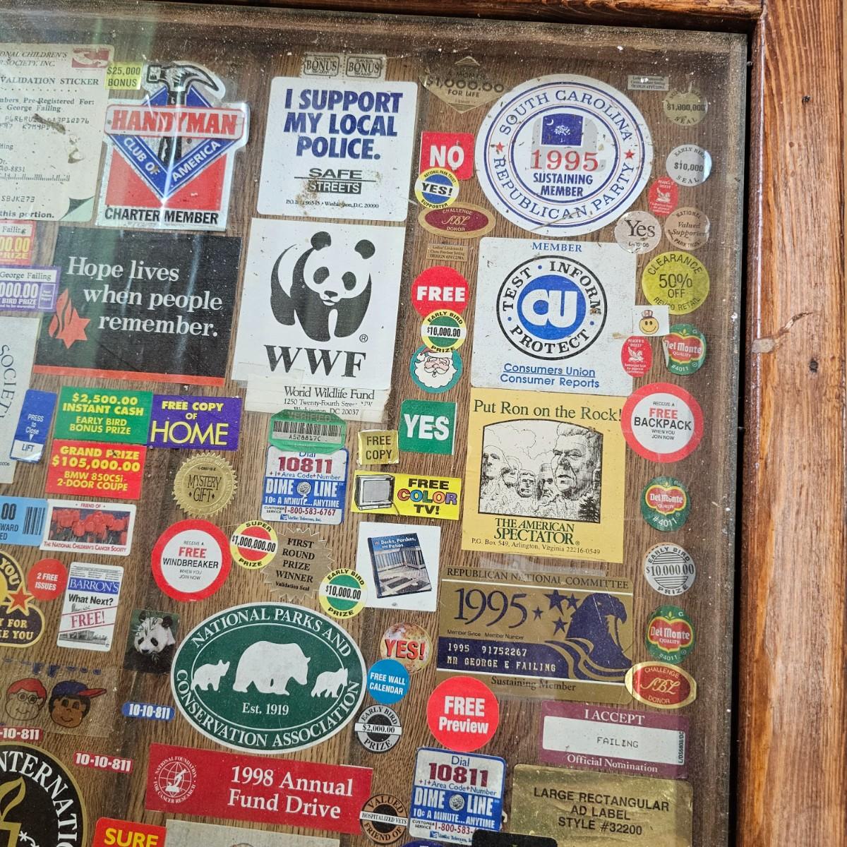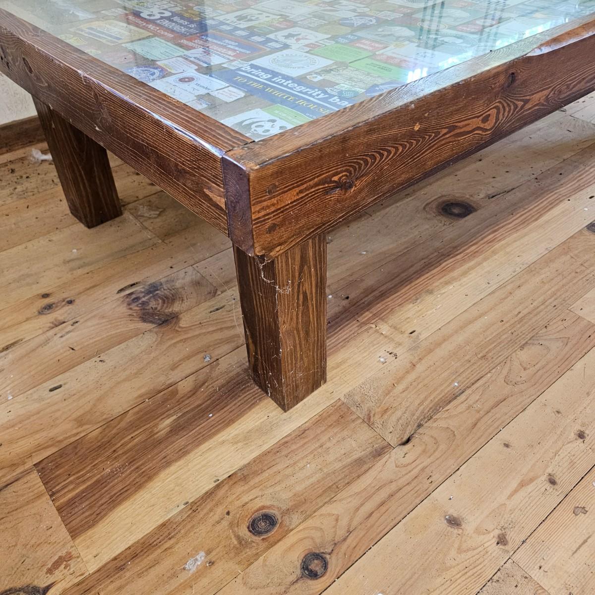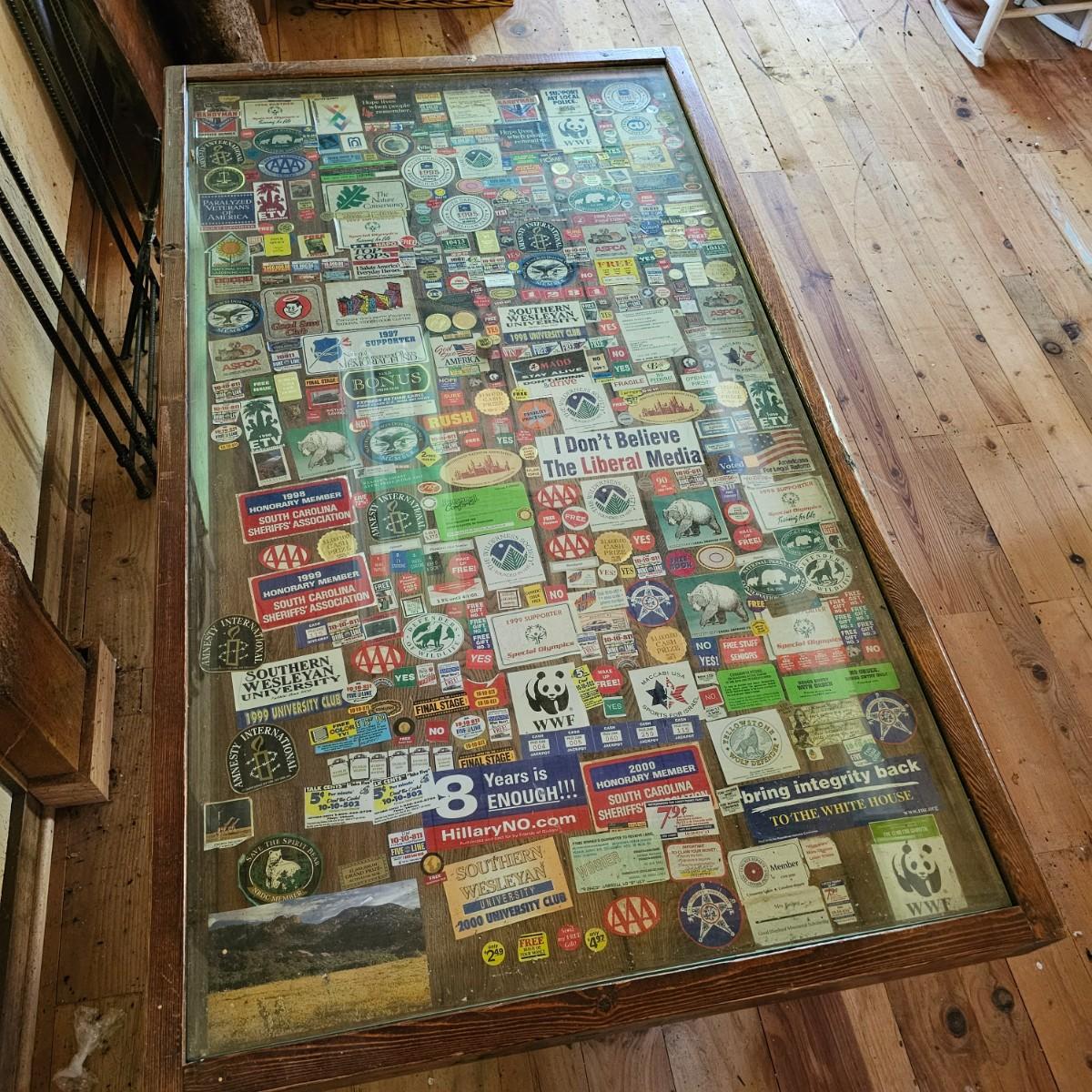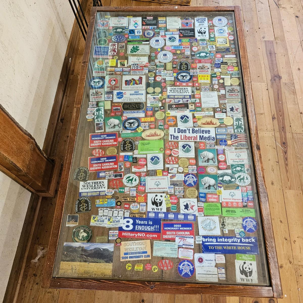 A most unusual furniture item, this handmade shadowbox table is full of stickers, tags, political memorabilia and more. Items and advertising from organizations, membership acknowledgements, etc. Table has tempered glass top, is 36" x 62" x 18"H and removable. Stickers are all placed in bottom of table, not on glass. See photos for details. Local pickup only. Winning bidder must bring assistance to help move and load this item due to its weight and/or size.