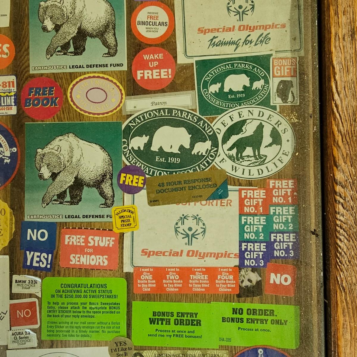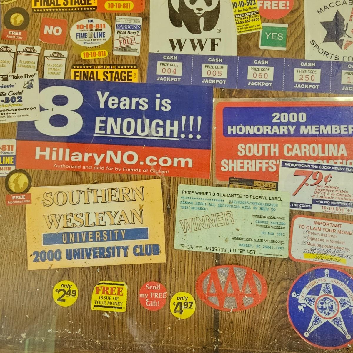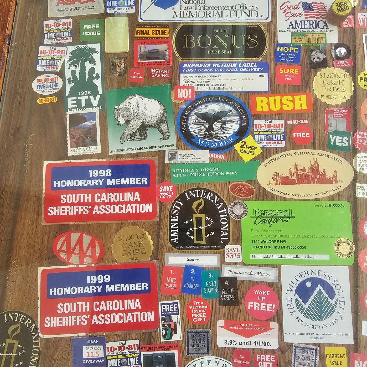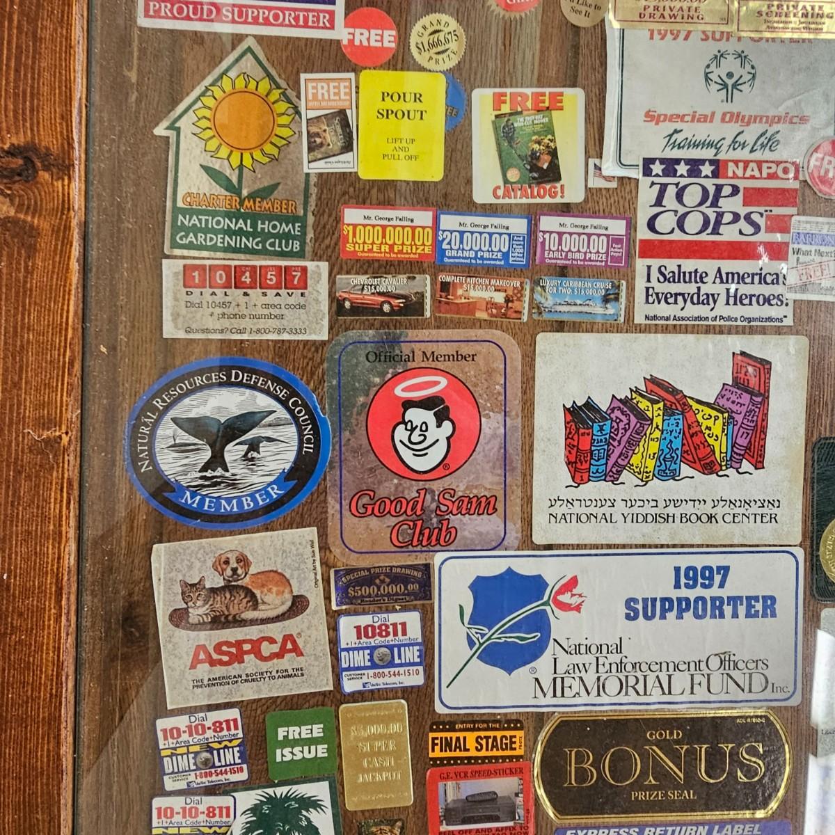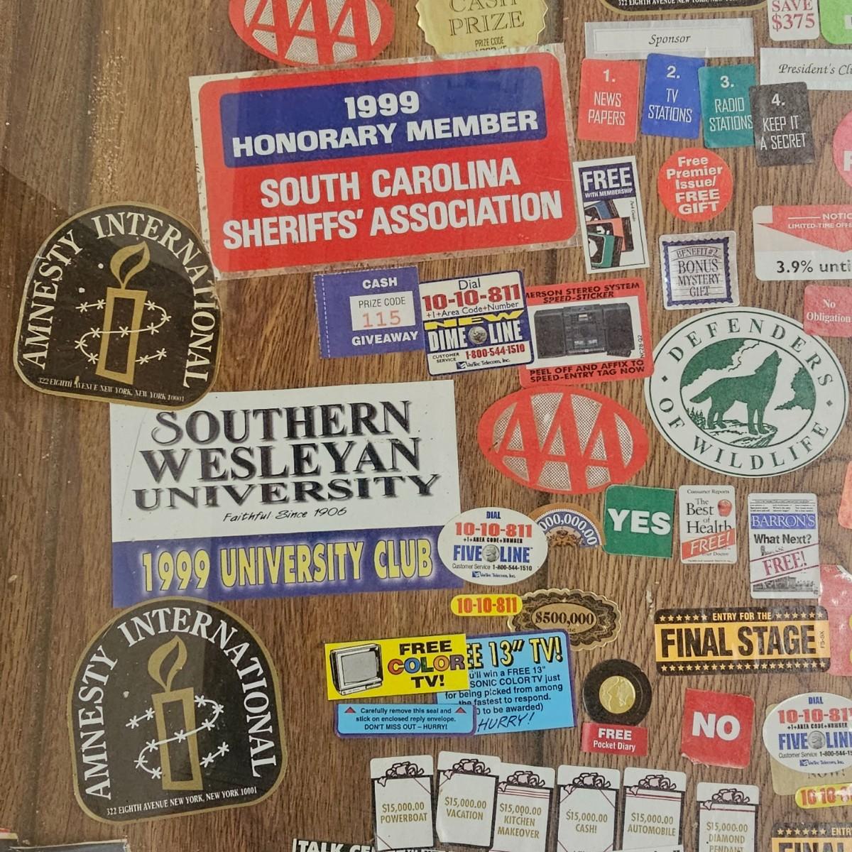 A most unusual furniture item, this handmade shadowbox table is full of stickers, tags, political memorabilia and more. Items and advertising from organizations, membership acknowledgements, etc. Table has tempered glass top, is 36" x 62" x 18"H and removable. Stickers are all placed in bottom of table, not on glass. See photos for details. Local pickup only. Winning bidder must bring assistance to help move and load this item due to its weight and/or size.