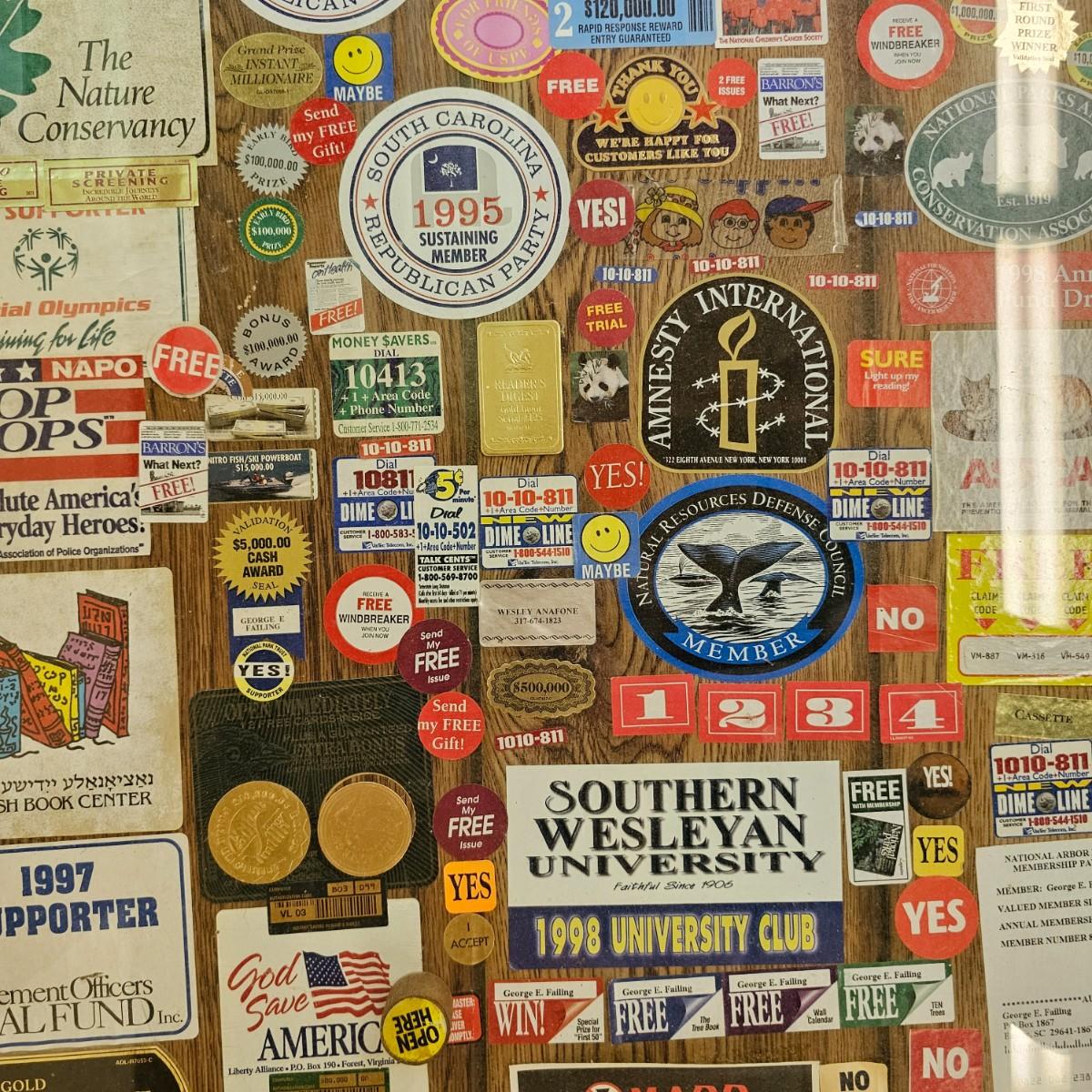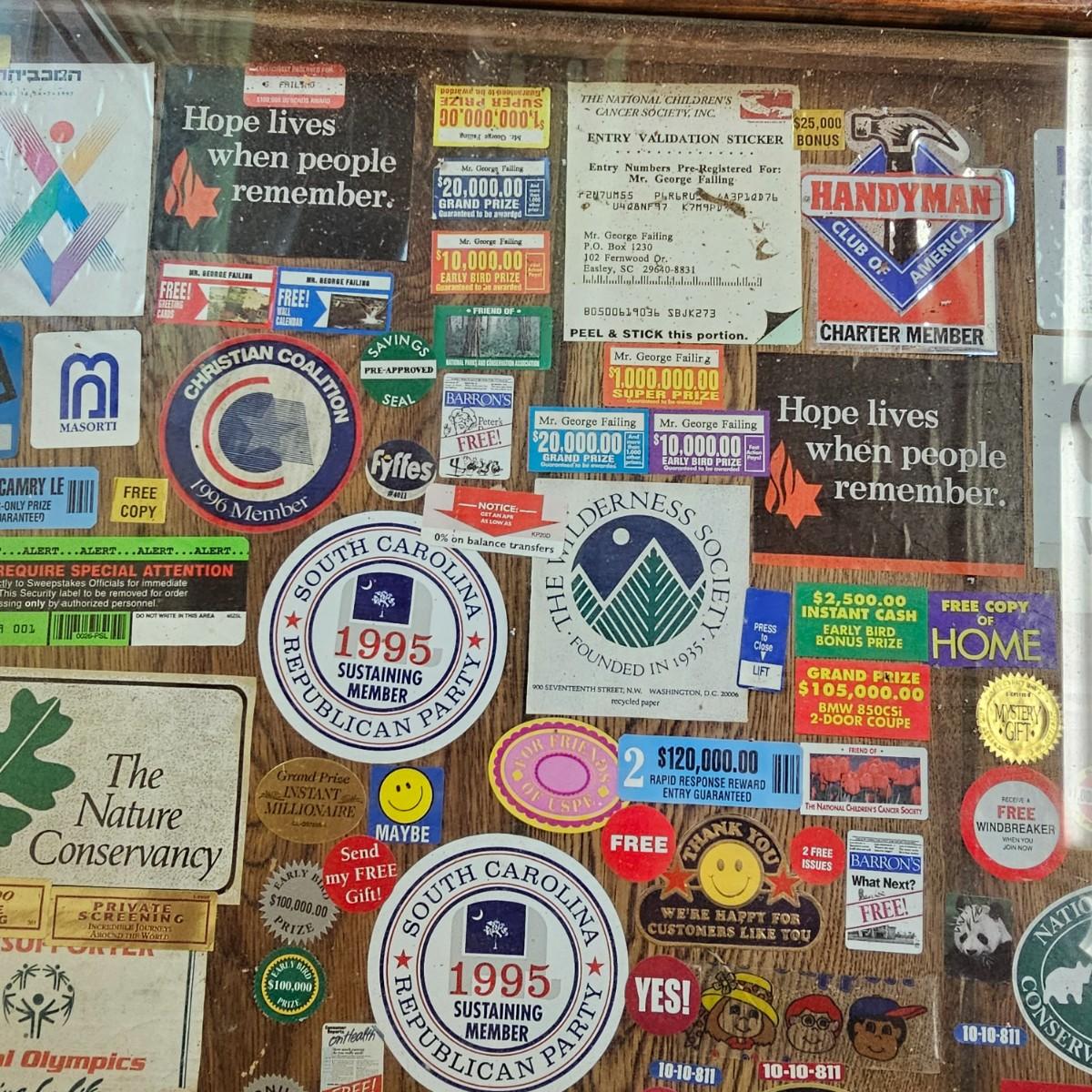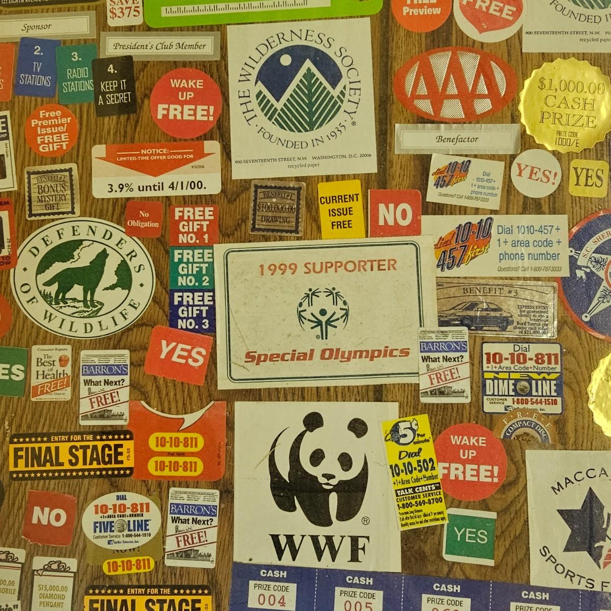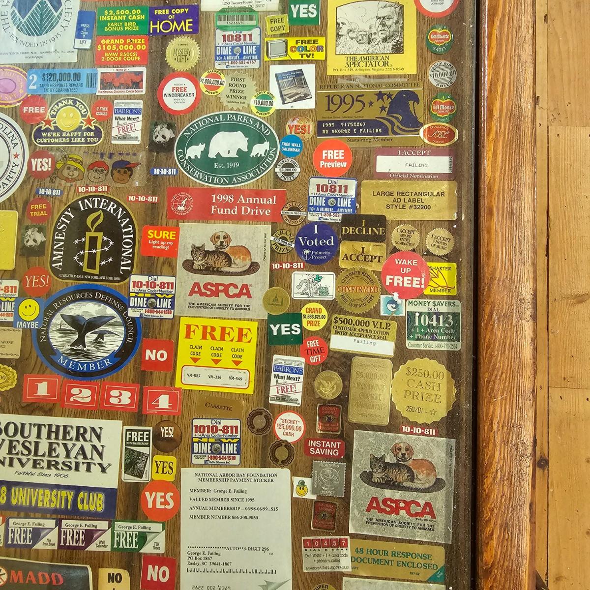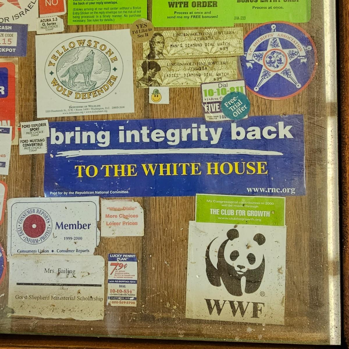 A most unusual furniture item, this handmade shadowbox table is full of stickers, tags, political memorabilia and more. Items and advertising from organizations, membership acknowledgements, etc. Table has tempered glass top, is 36" x 62" x 18"H and removable. Stickers are all placed in bottom of table, not on glass. See photos for details. Local pickup only. Winning bidder must bring assistance to help move and load this item due to its weight and/or size.