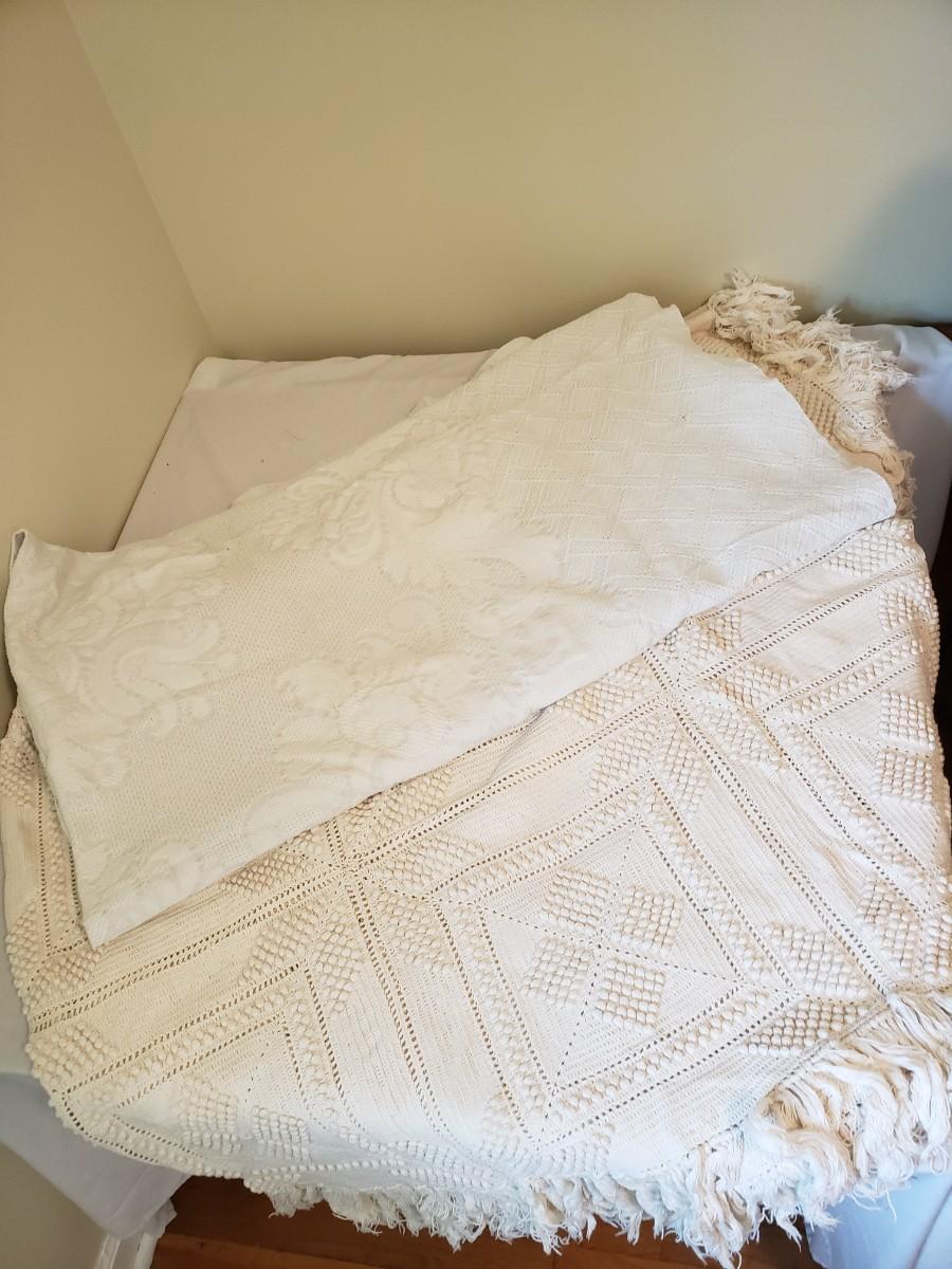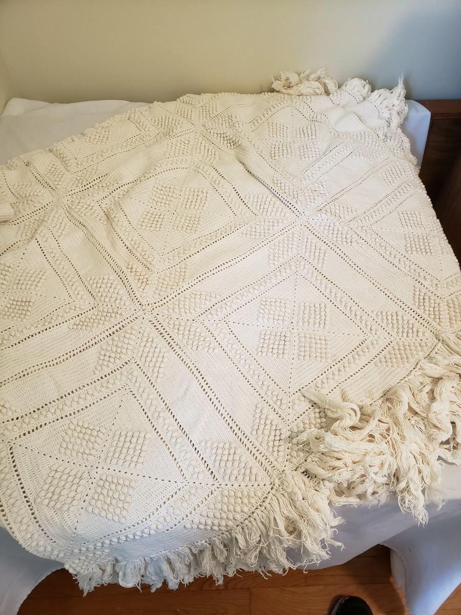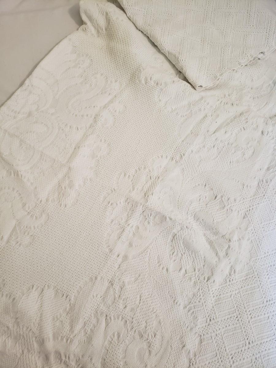The cotton twin sized off white bedspread features an ornate design. This bedspread measures 70"x66". and only has 2 frayed corners as seen in the pictures. The handmade crochet bedspread would be a show stopper! This beautiful bedspread measures 86"x72" and appears to be in good condition. Shipping available.