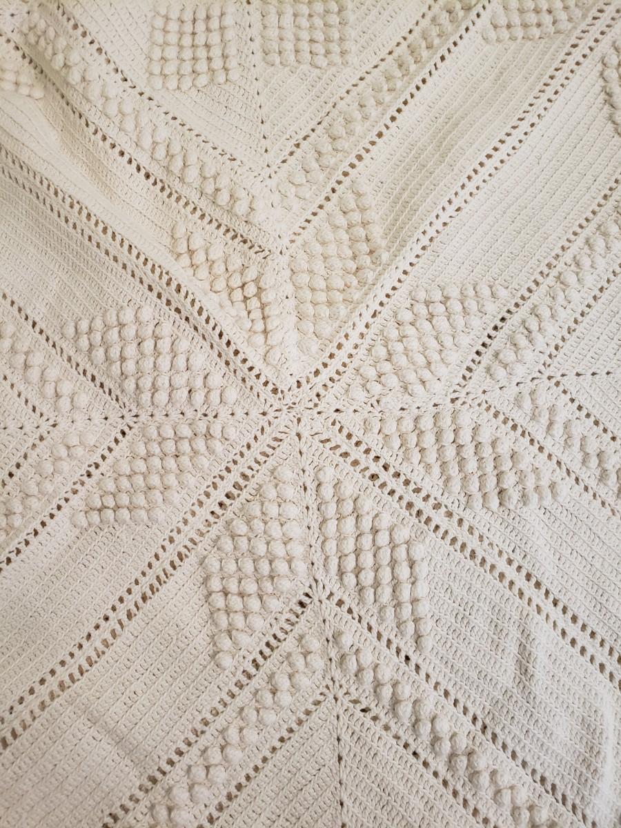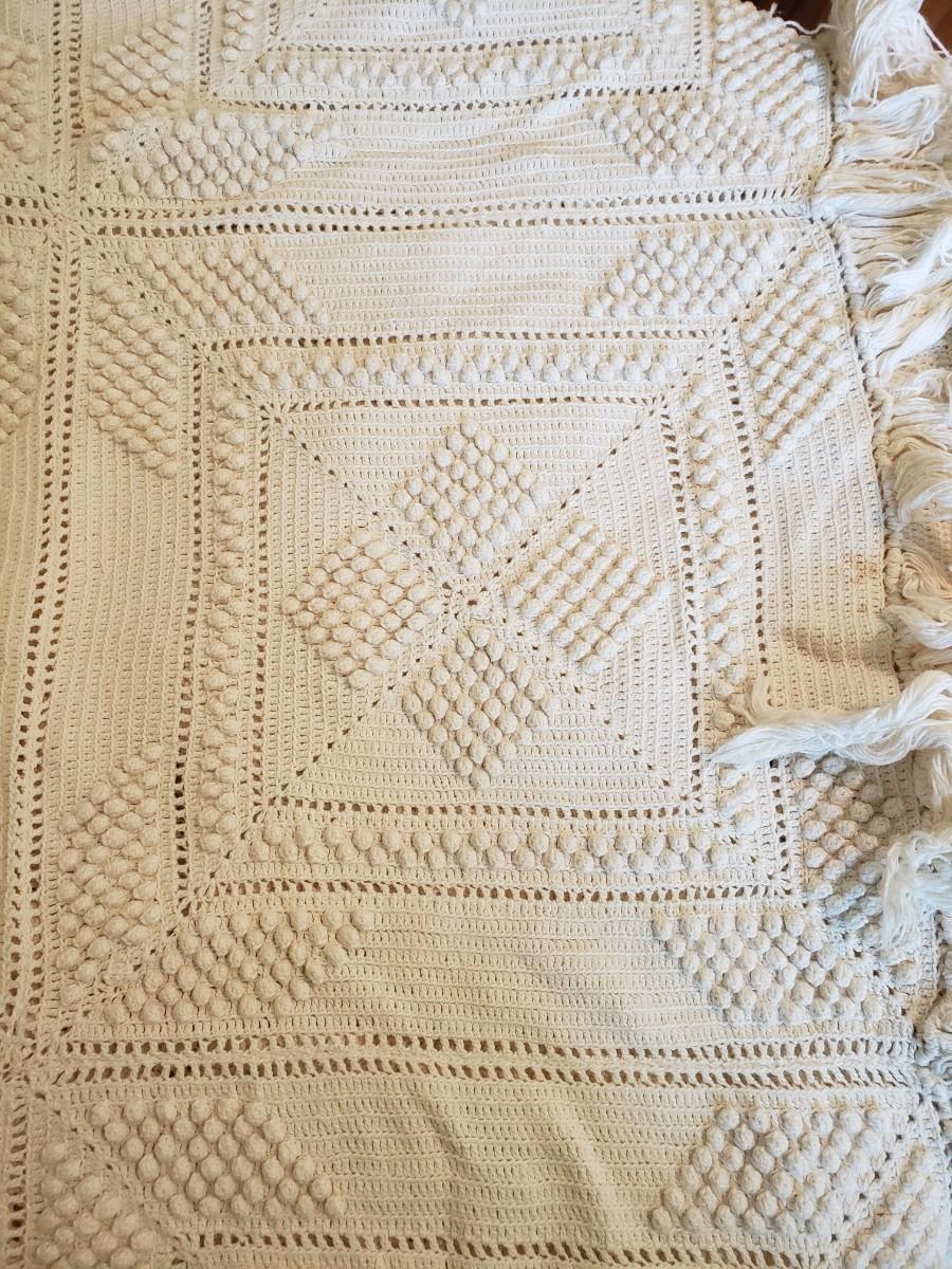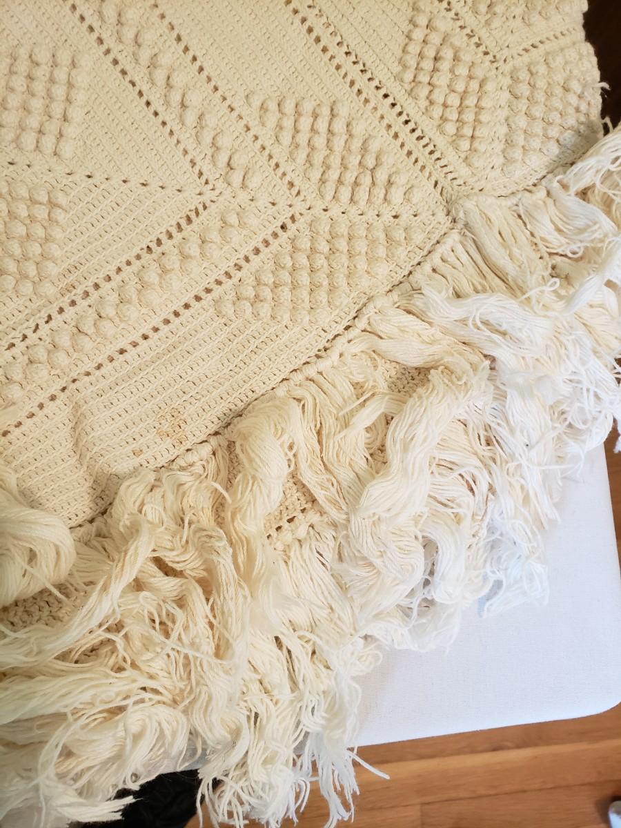 The cotton twin sized off white bedspread features an ornate design. This bedspread measures 70"x66". and only has 2 frayed corners as seen in the pictures. The handmade crochet bedspread would be a show stopper! This beautiful bedspread measures 86"x72" and appears to be in good condition. Shipping available.