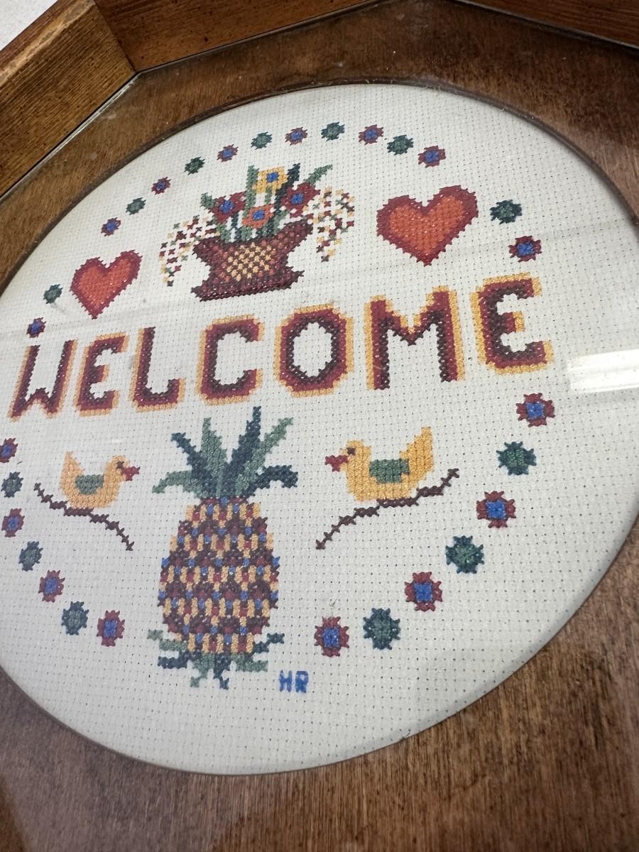 Handmade Crosstitch "Welcome" Art on Wooden Platter with Glass Cover, 12" across
