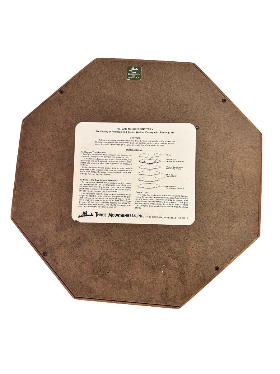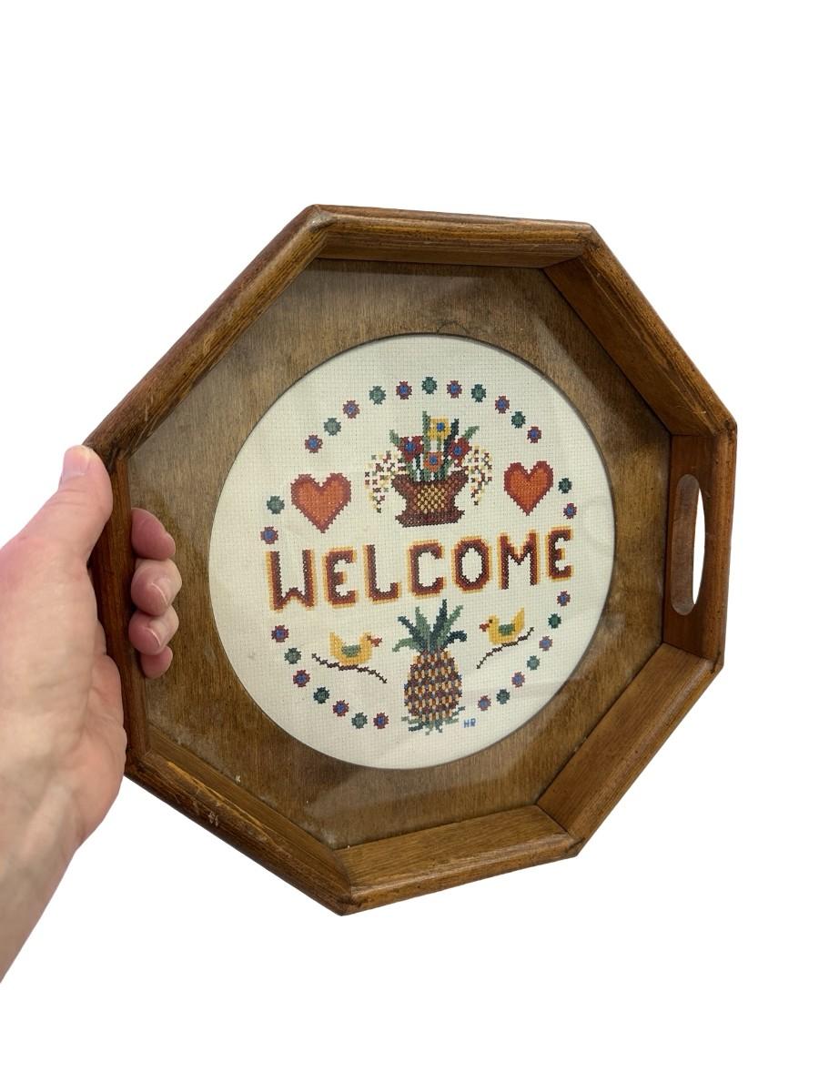 Handmade Crosstitch "Welcome" Art on Wooden Platter with Glass Cover