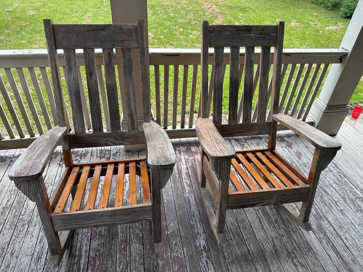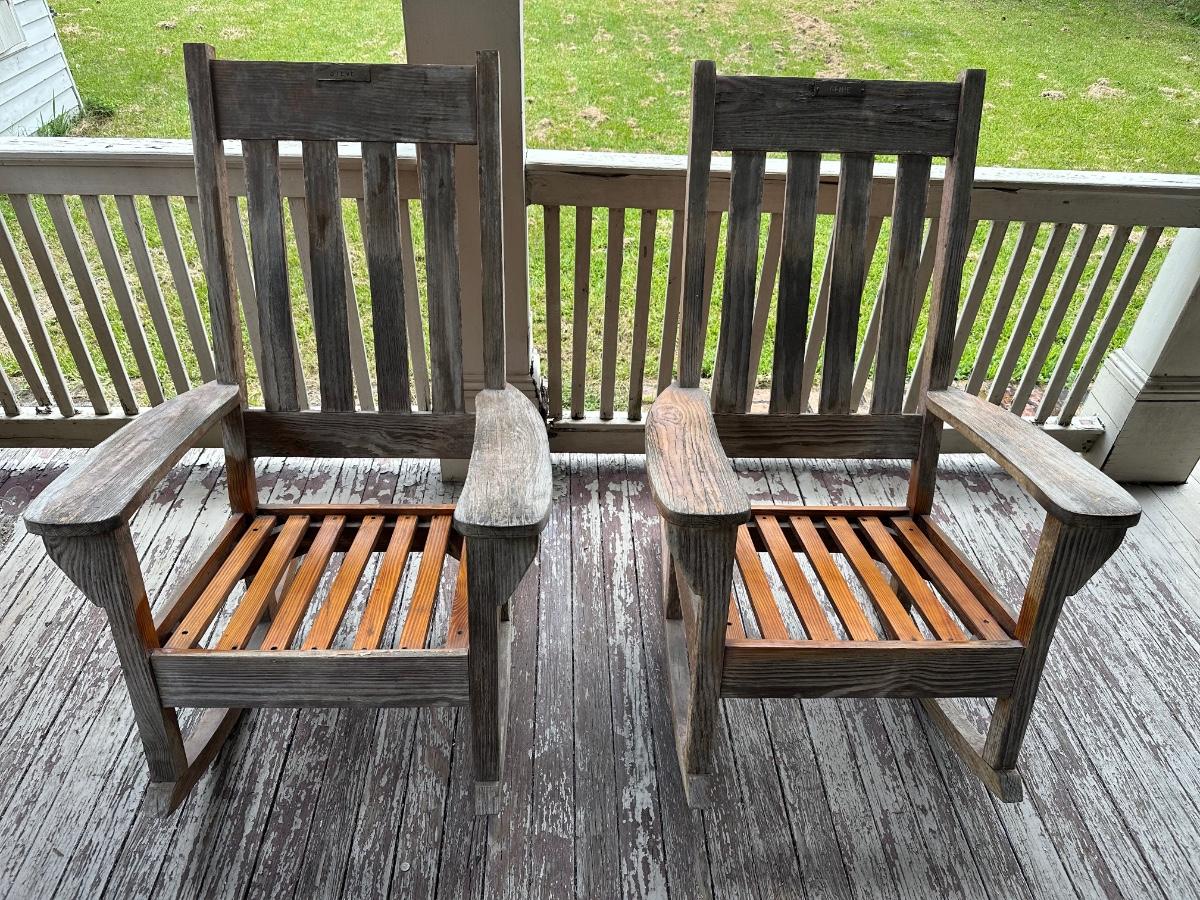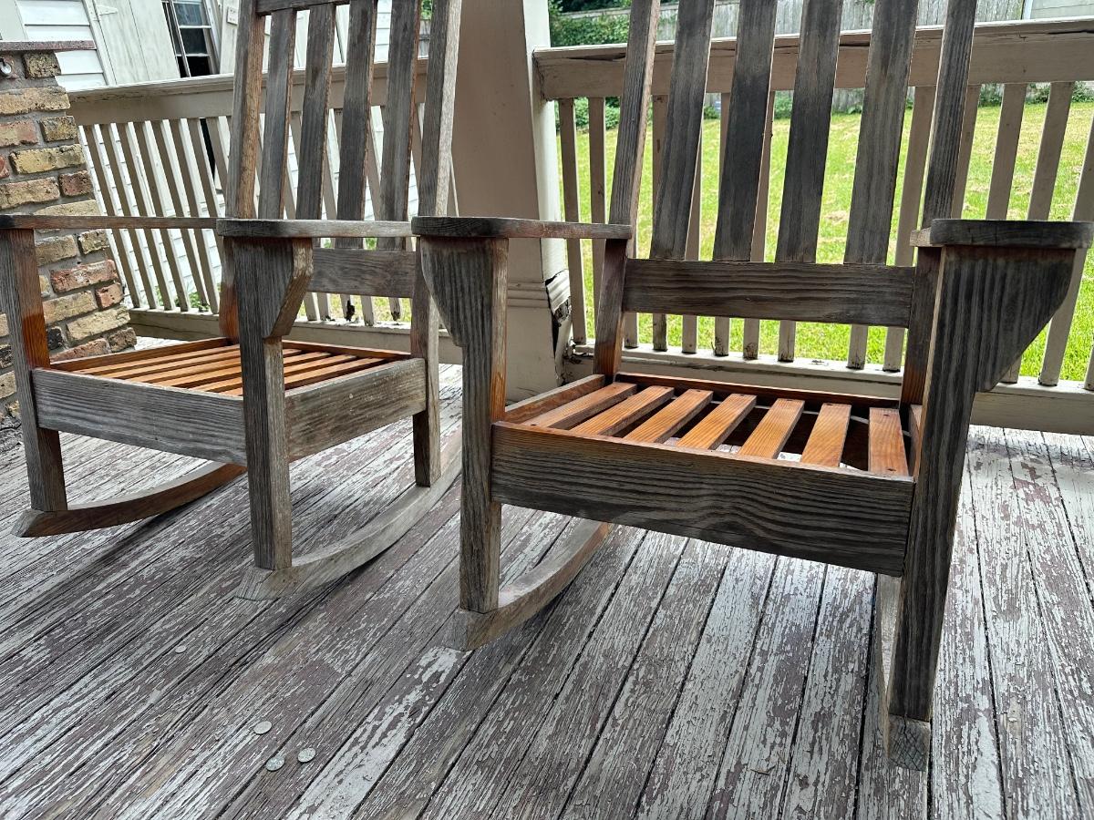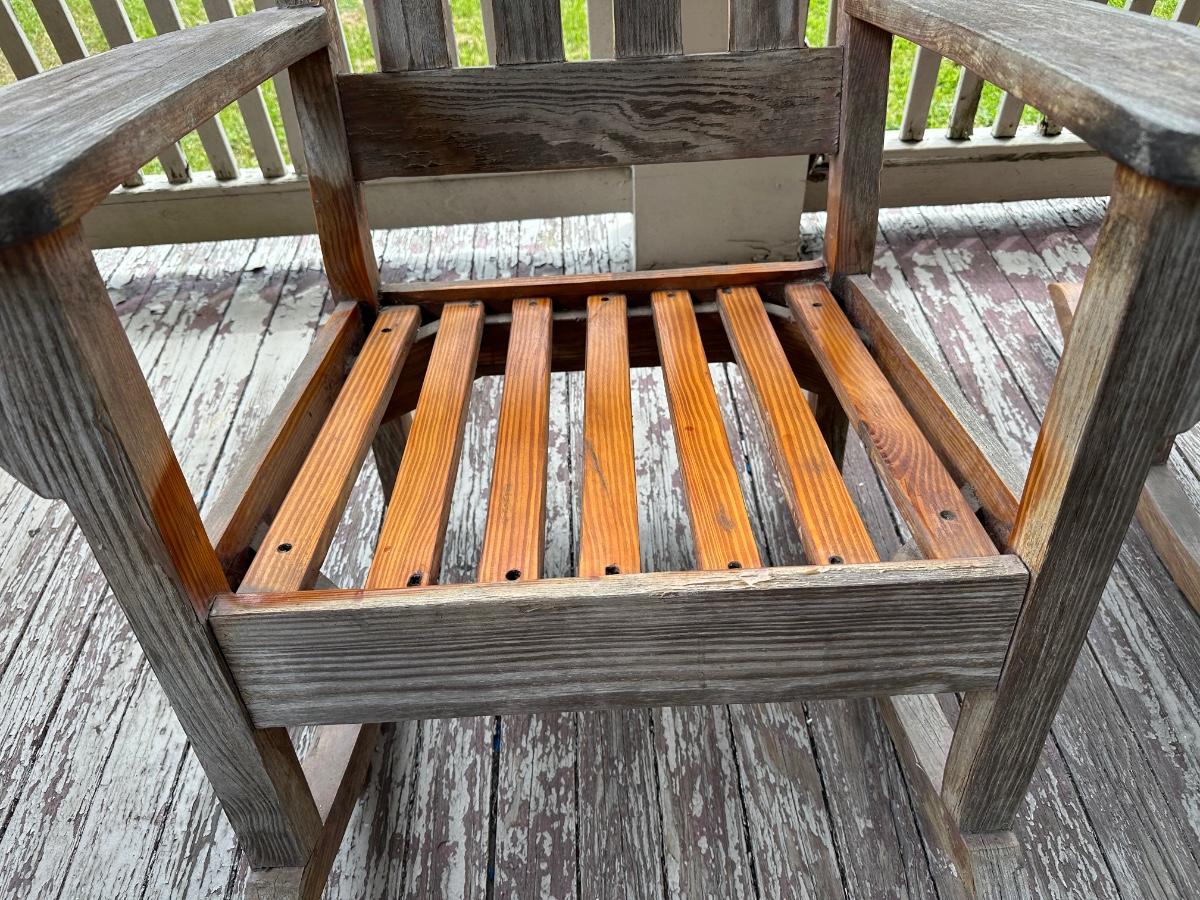 Chairs show sun fading, but areas beneath the cushions and the back side are well preserved. Some refinishing suggested. Please see photos for details.