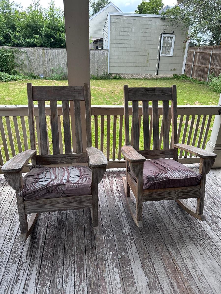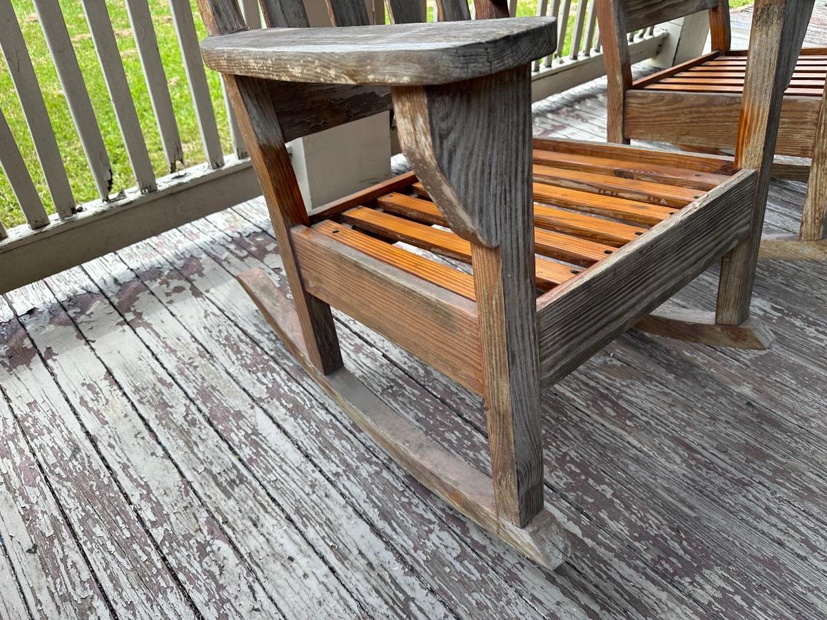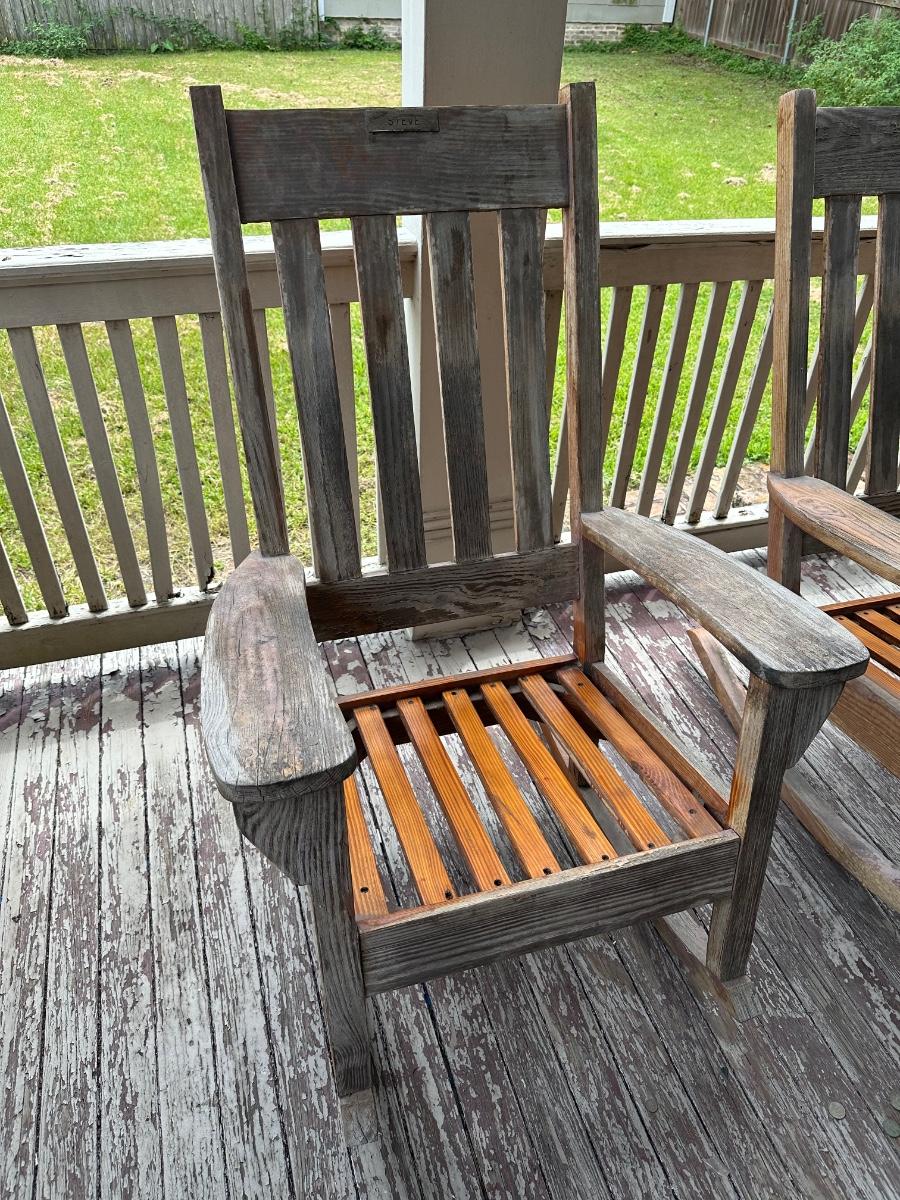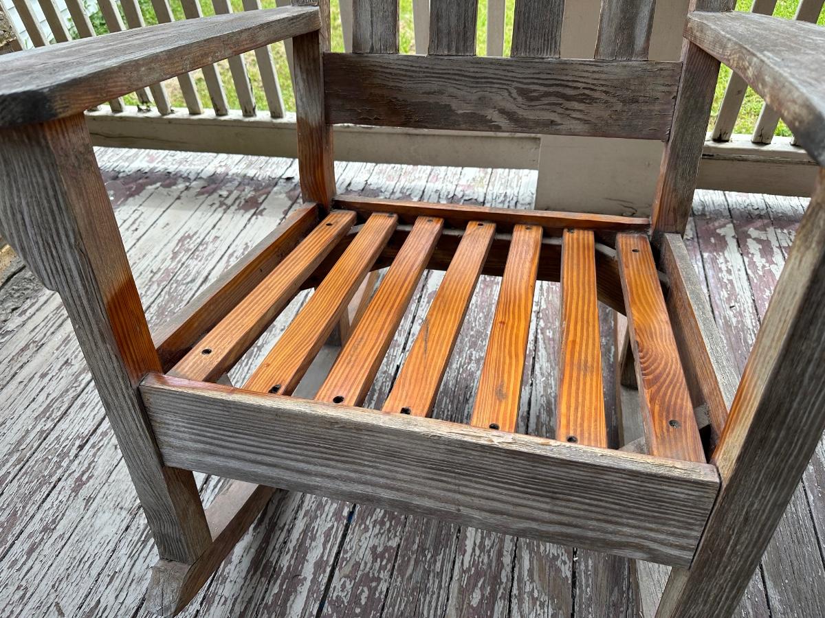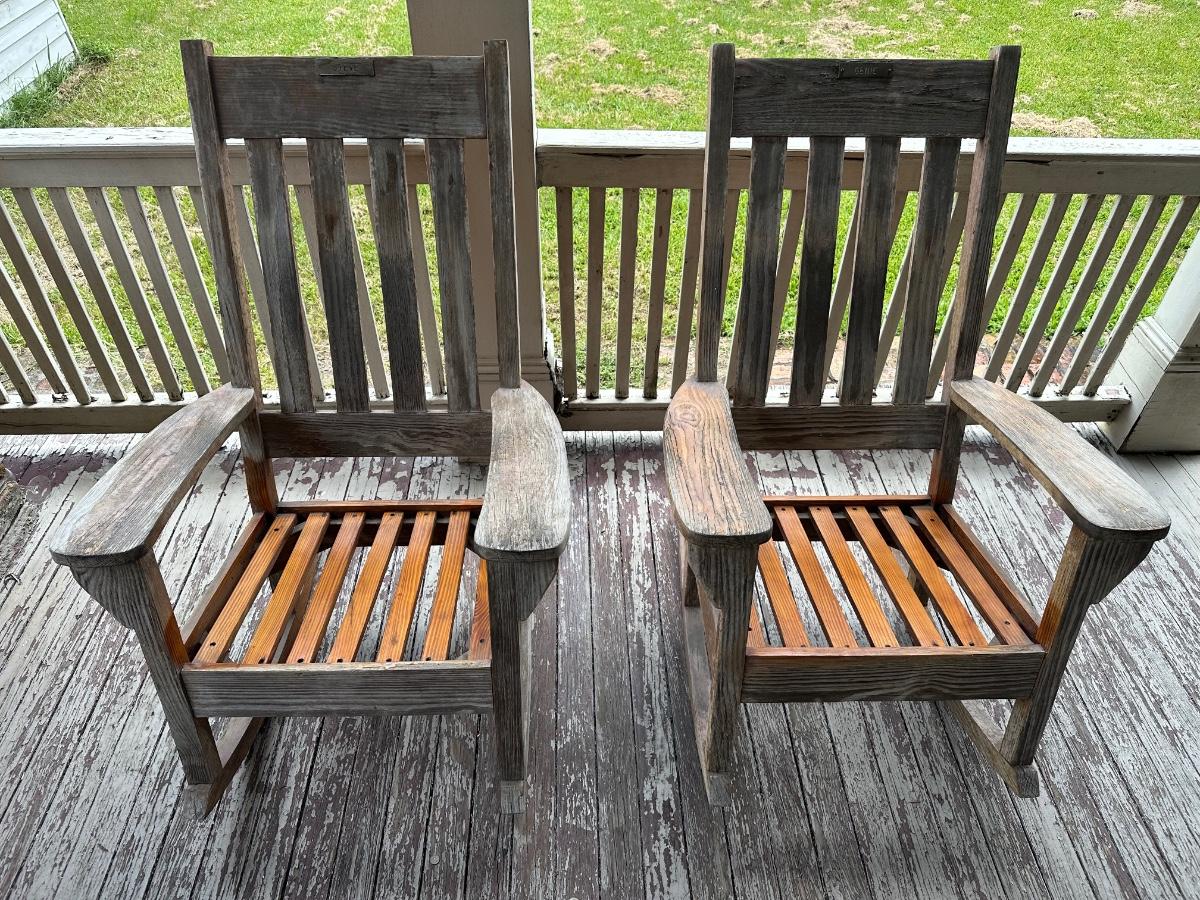 Chairs show sun fading, but areas beneath the cushions and the back side are well preserved. Some refinishing suggested. Please see photos for details.