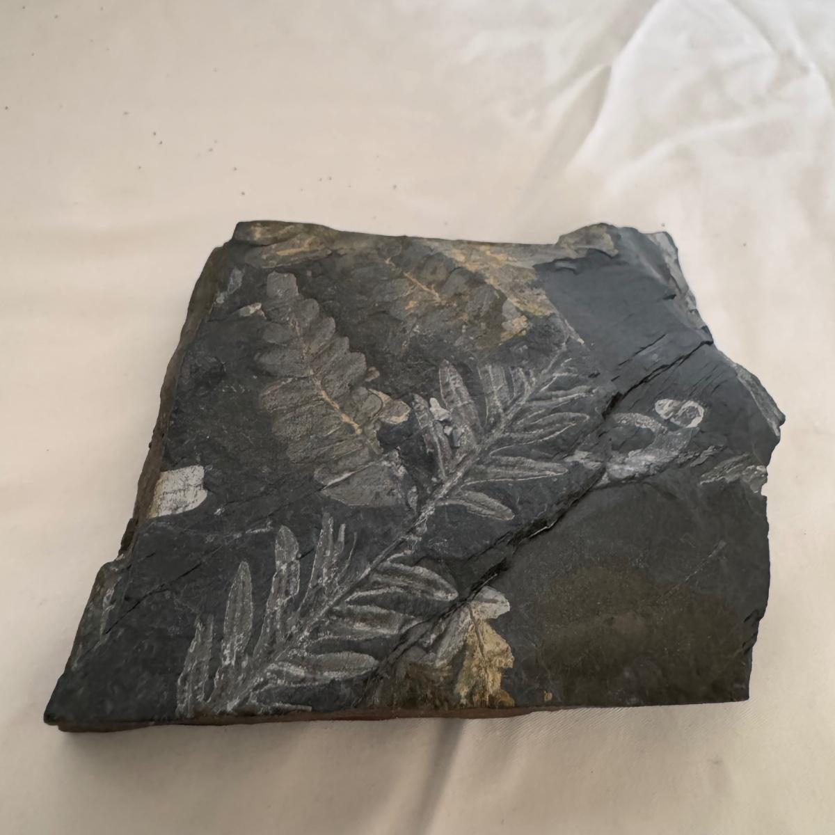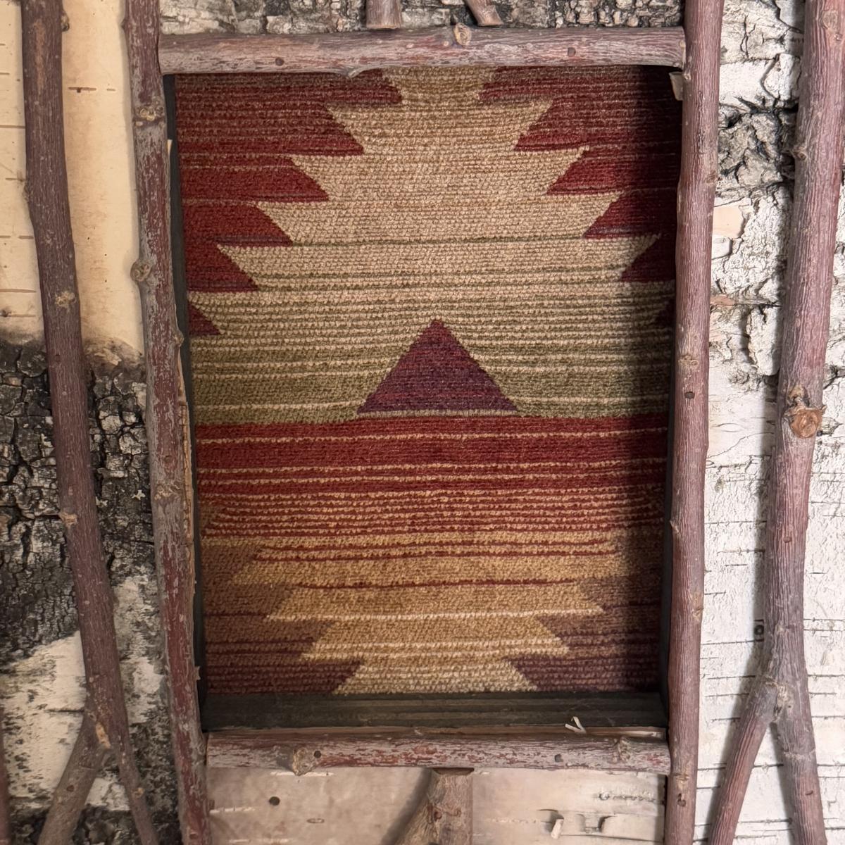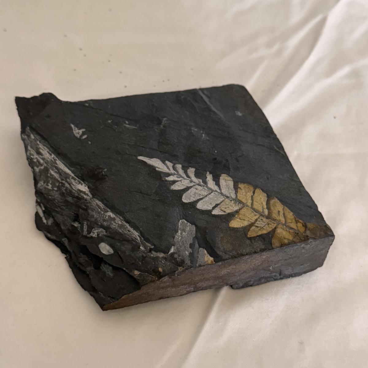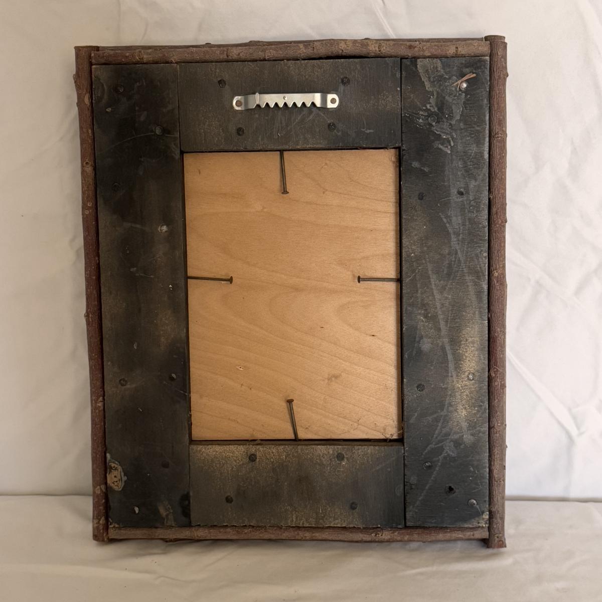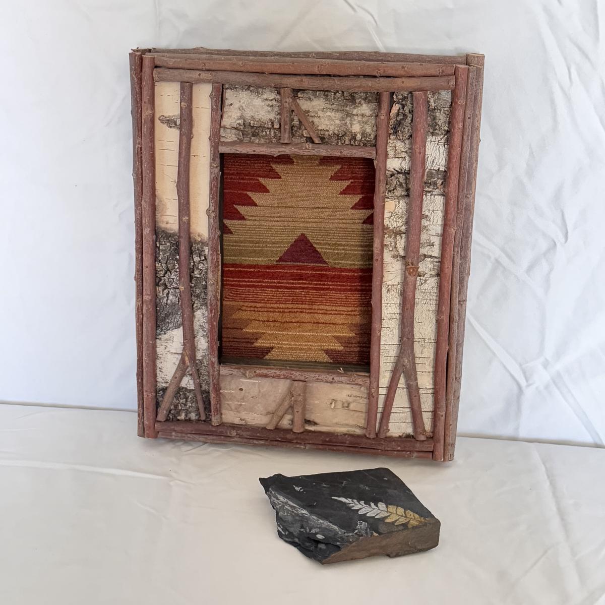 This lot includes one piece of folk art with a handmade wooden frame, along with one rock that appears to be stamped with gold and silver painted leaves. The frame of the art piece measures 10” x 12”H. Shipping available.