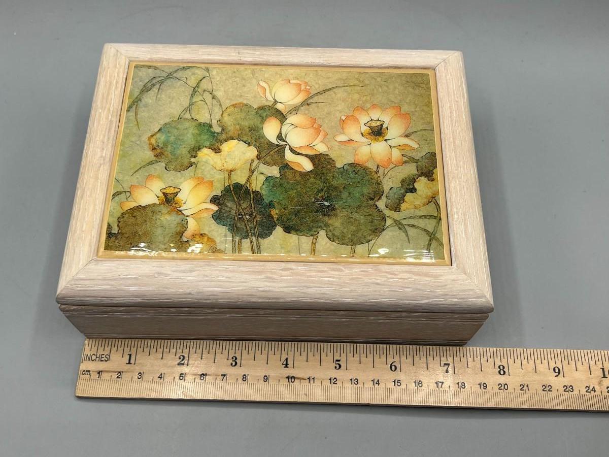 There is no significant damage to the jewlery box and is in overall good collectible or useable condition. Check pictures for more details and for sizing.