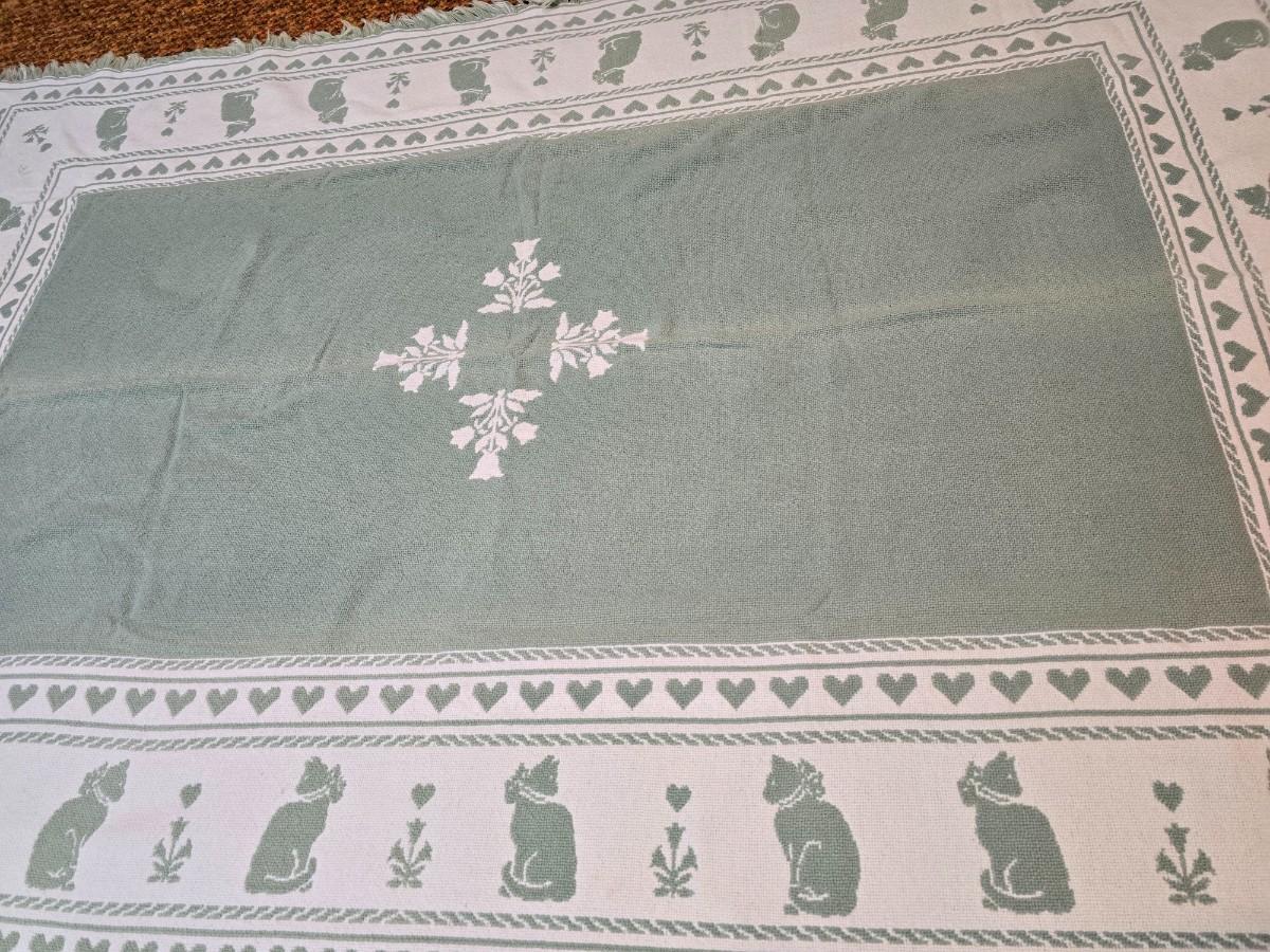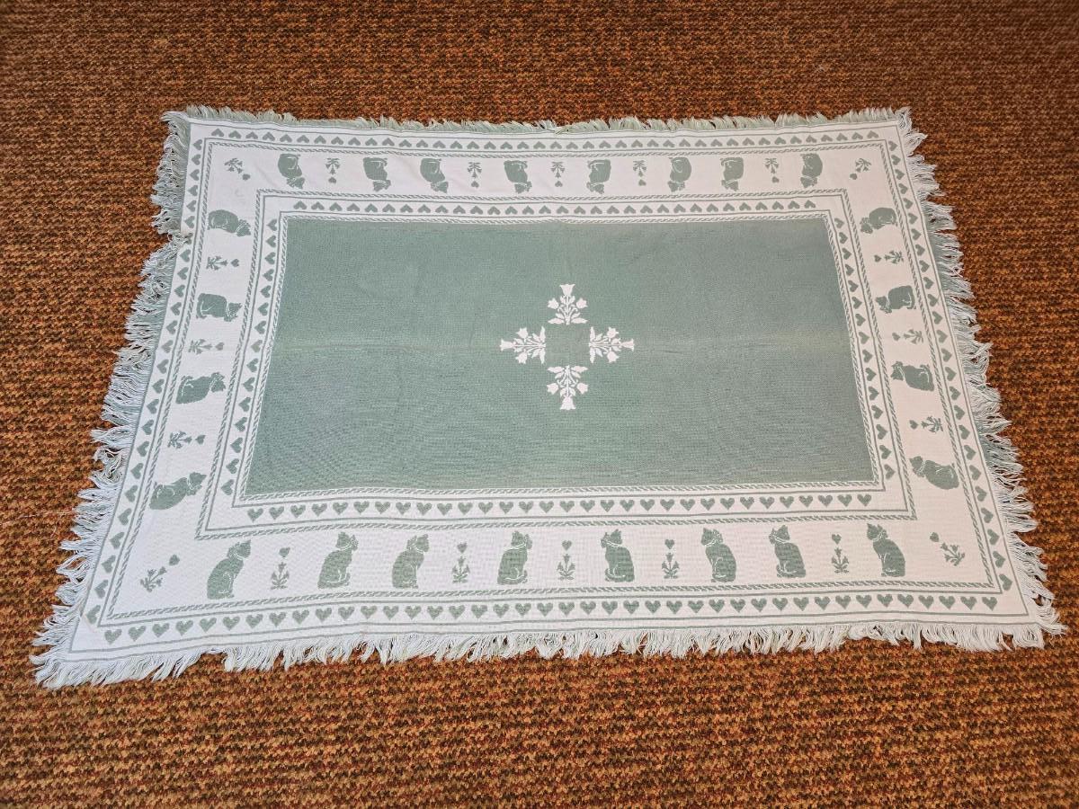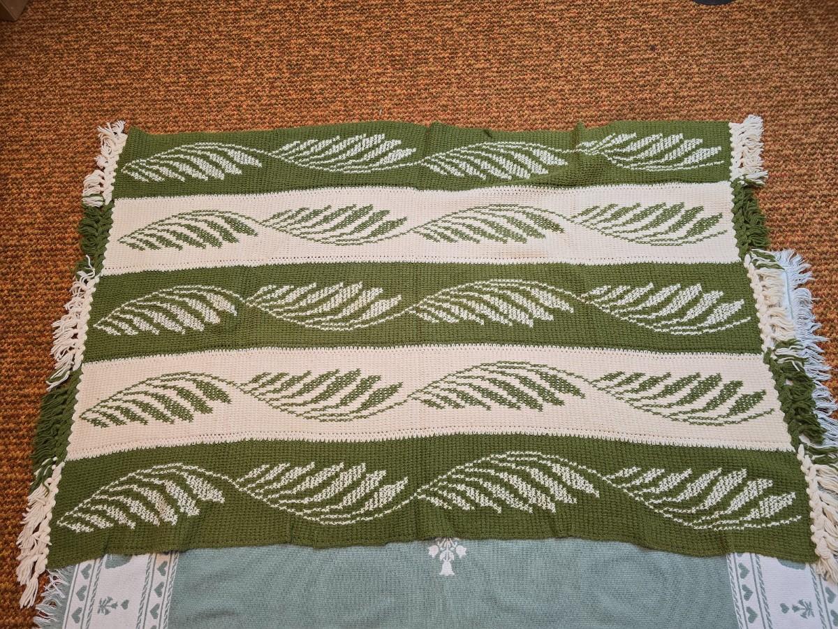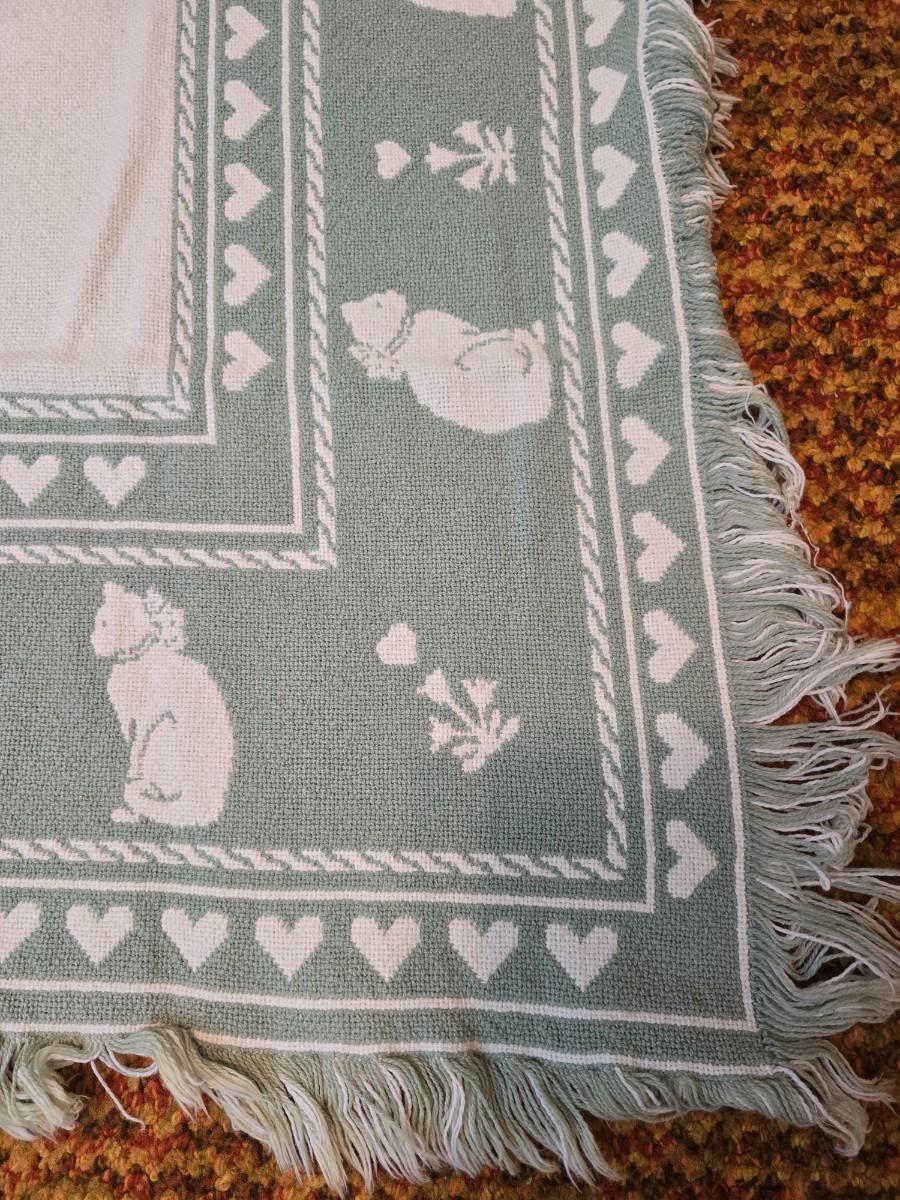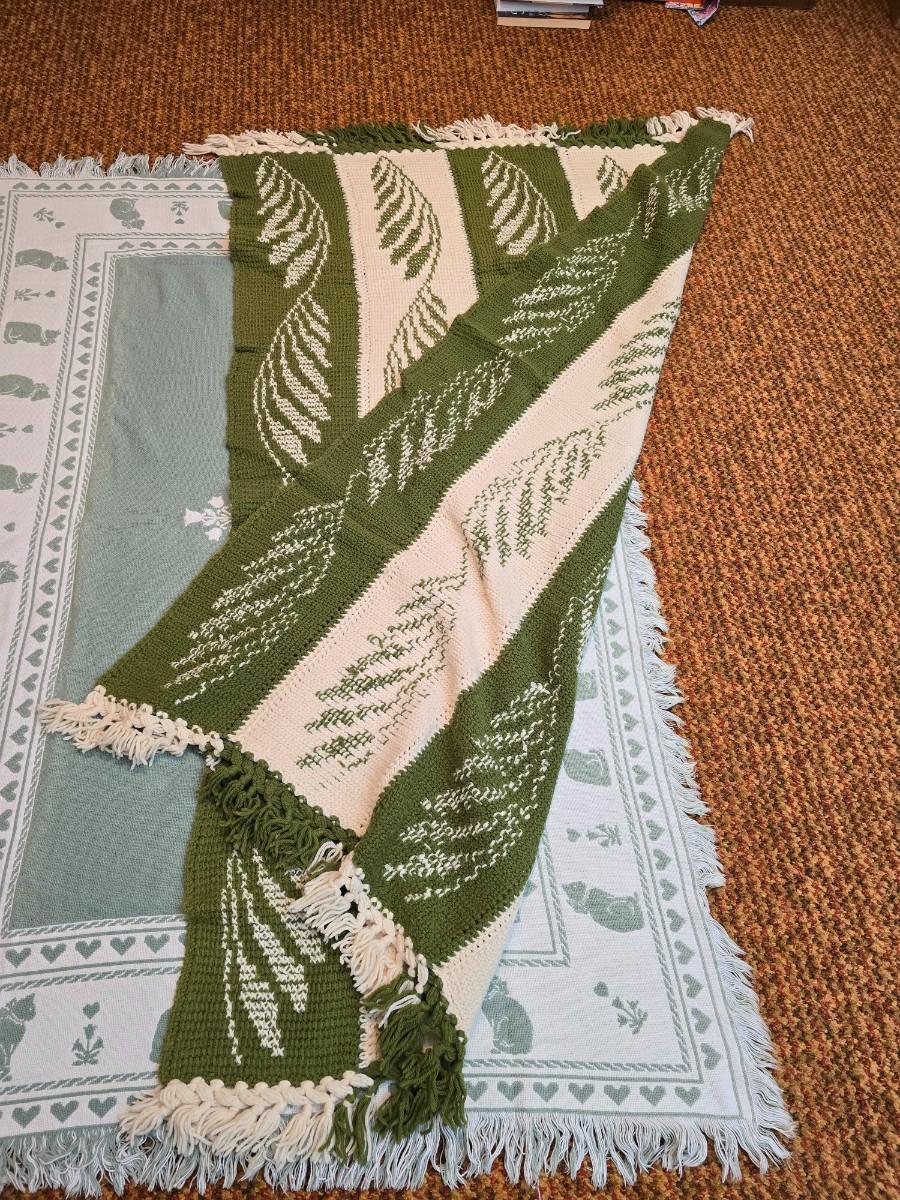 handmade green and white crochet blanket with a leaves pattern and fringed edges with a knitted reverse cat themed throw