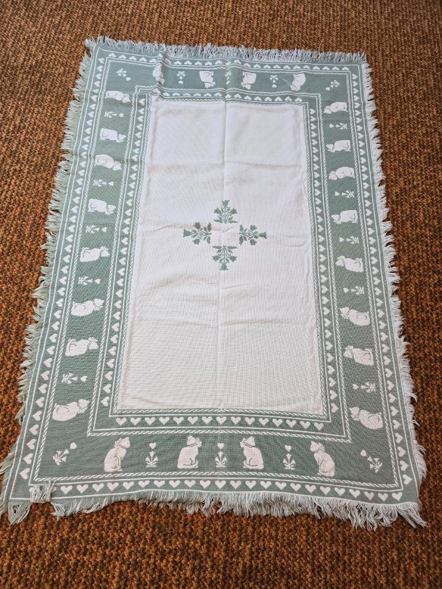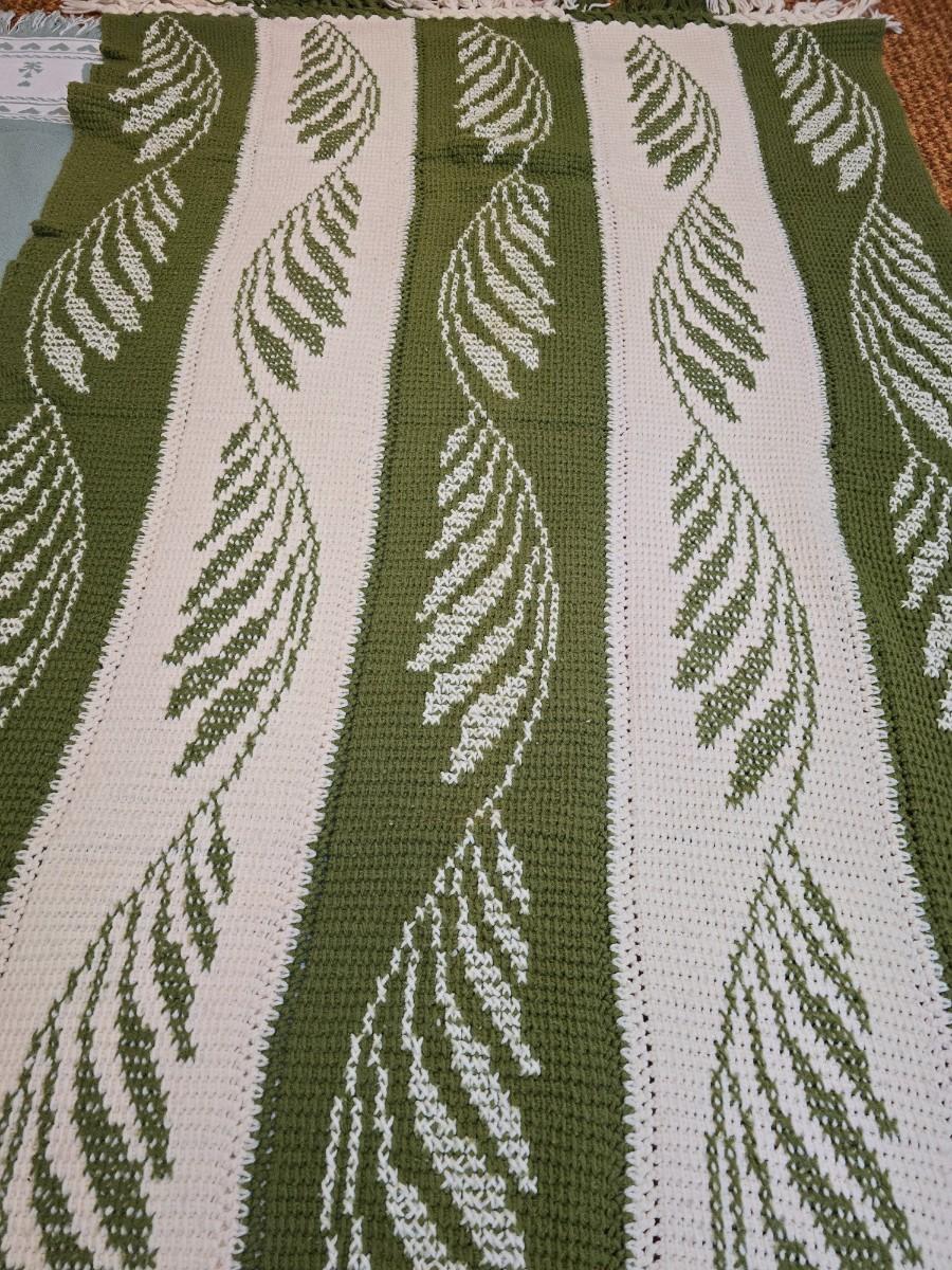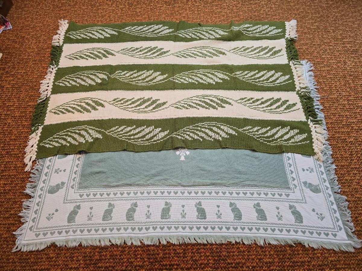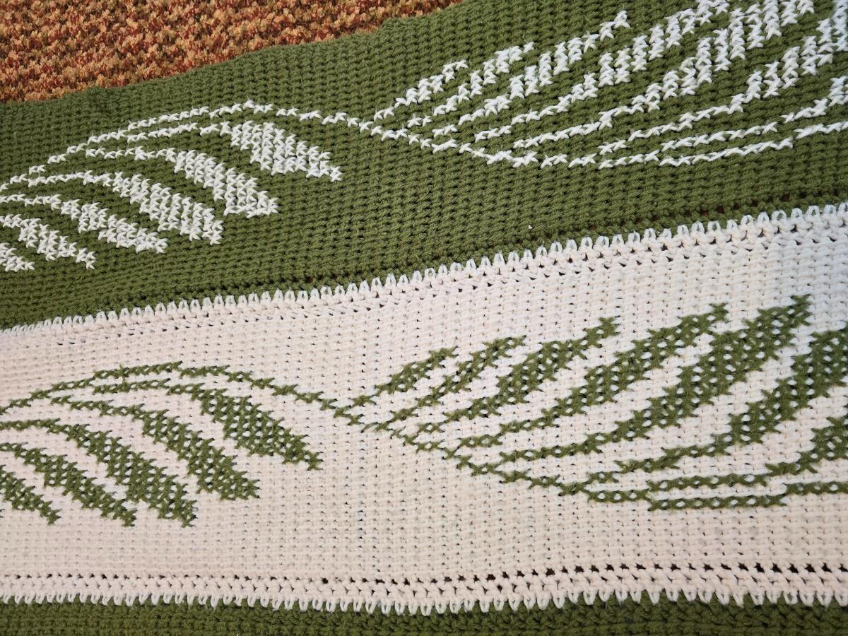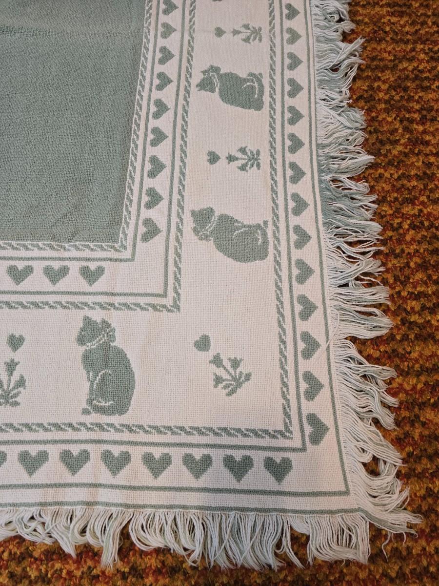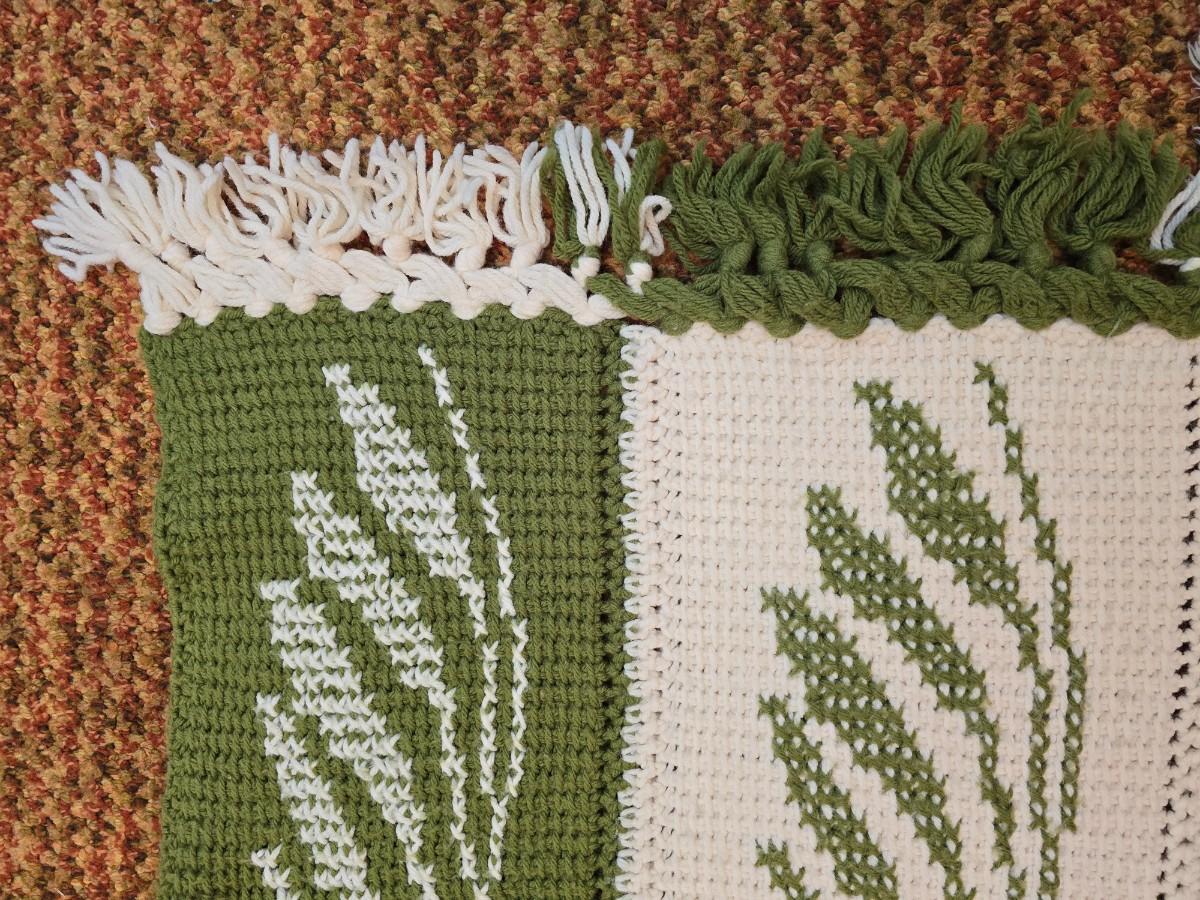 handmade green and white crochet blanket with a leaves pattern and fringed edges with a knitted reverse cat themed throw