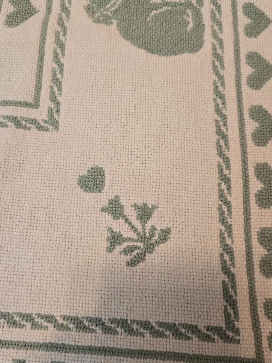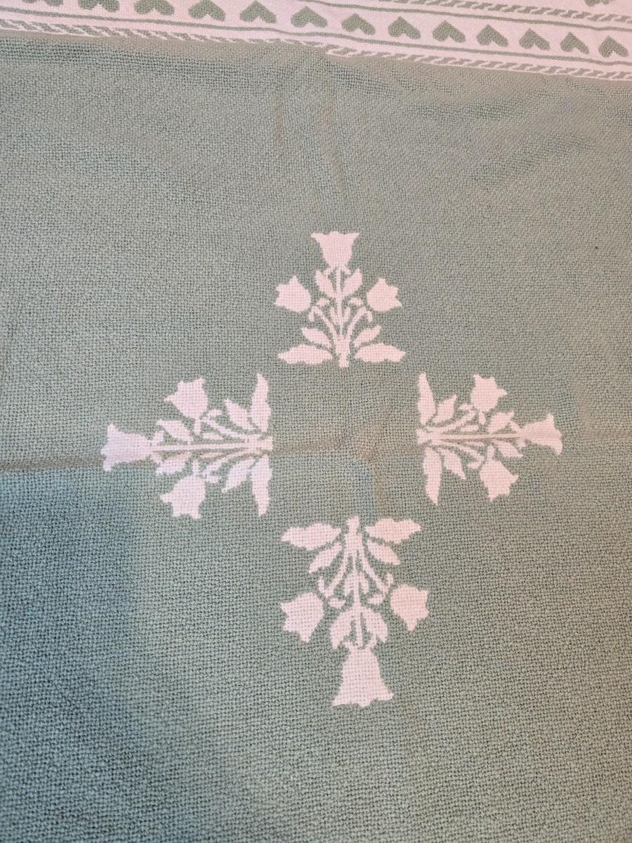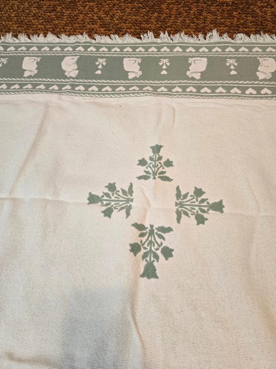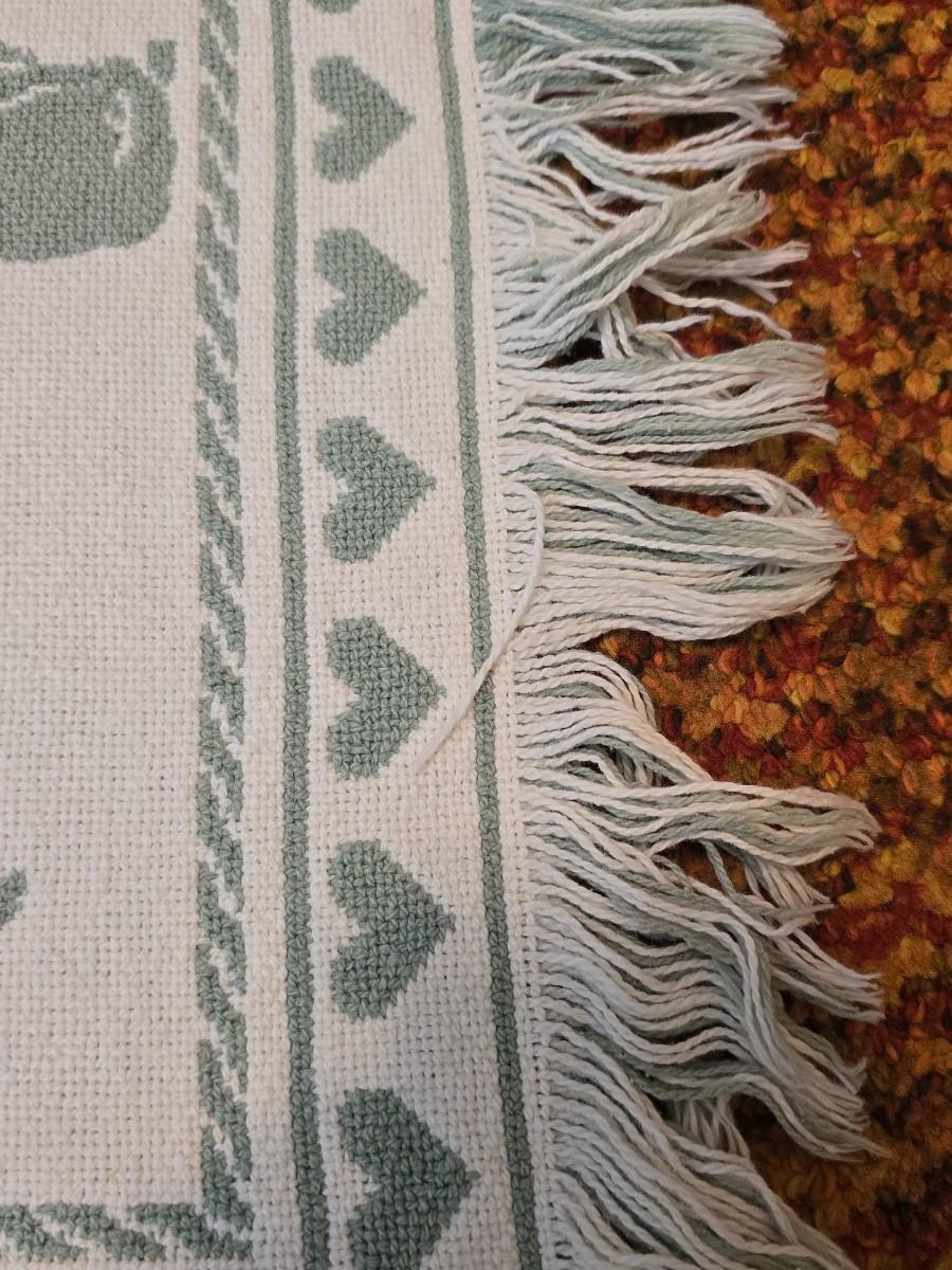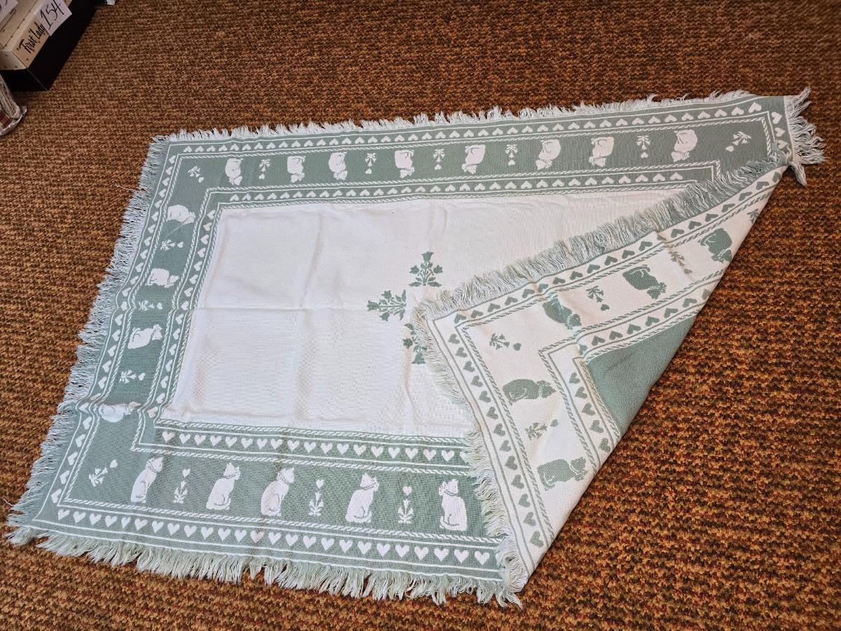 handmade green and white crochet blanket with a leaves pattern and fringed edges with a knitted reverse cat themed throw