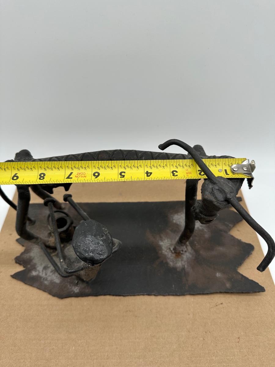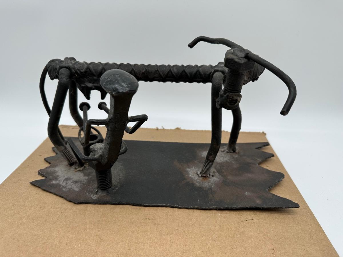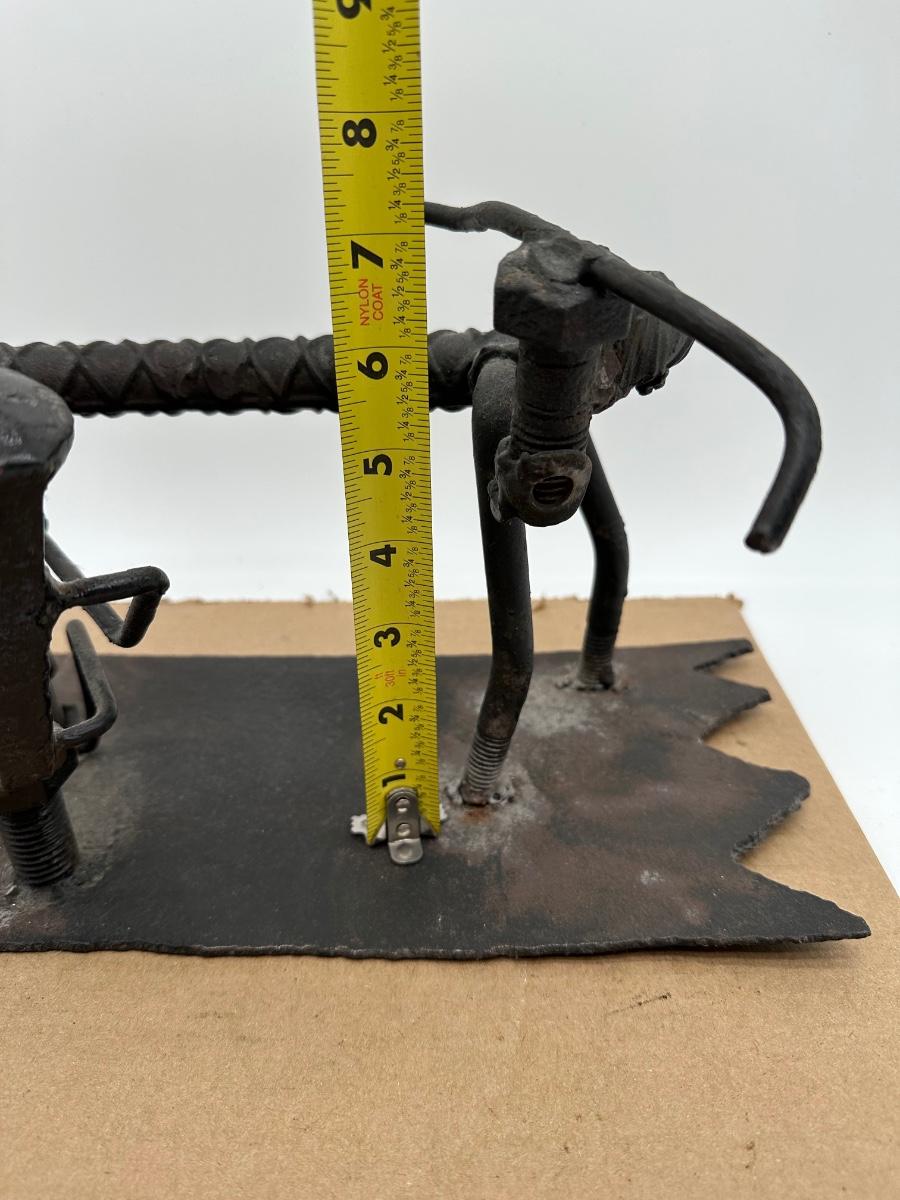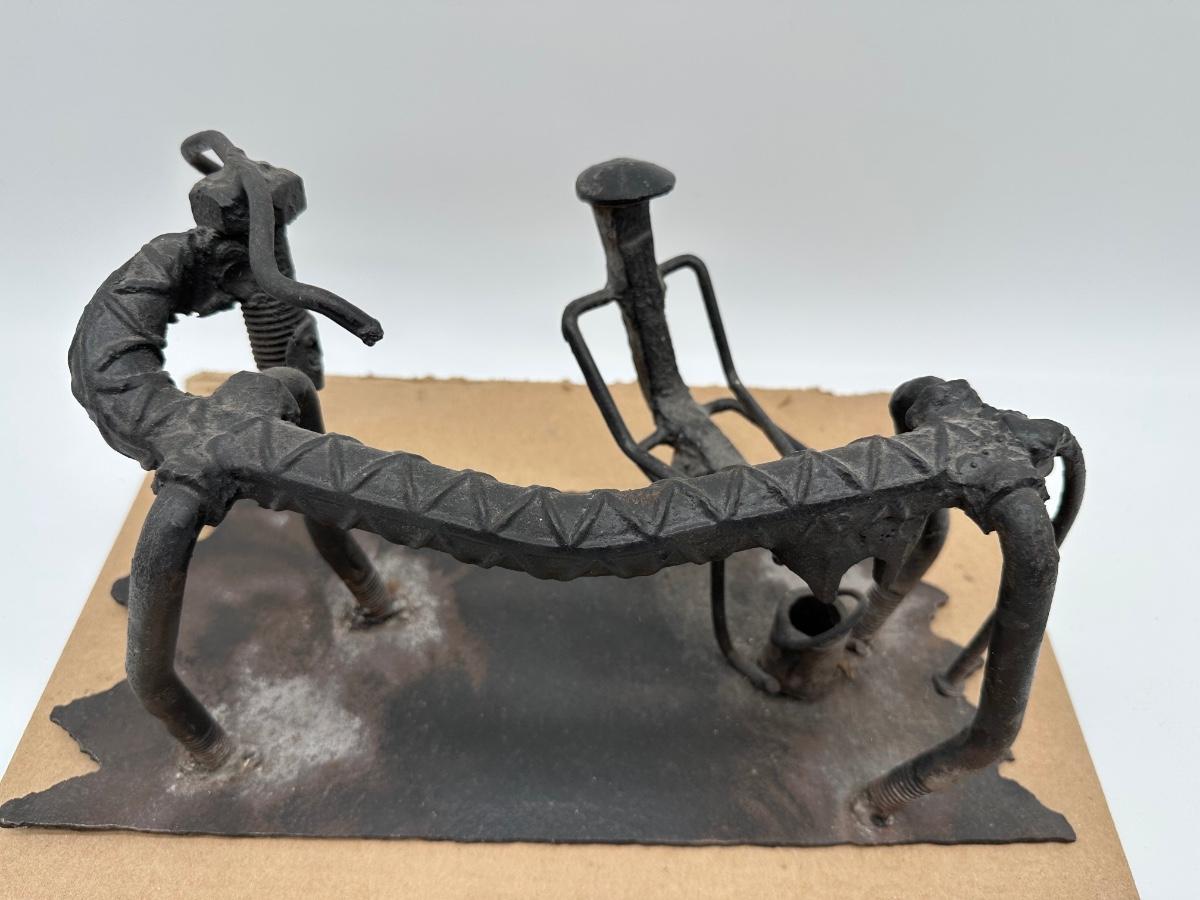 Unique hand-crafted welded metal sculpture made from rebar, bolts, and steel hardware, formed into a small bench/seat design. Heavy industrial look with great texture and patina. Perfect as folk art, industrial décor, desk display, or conversation piece.