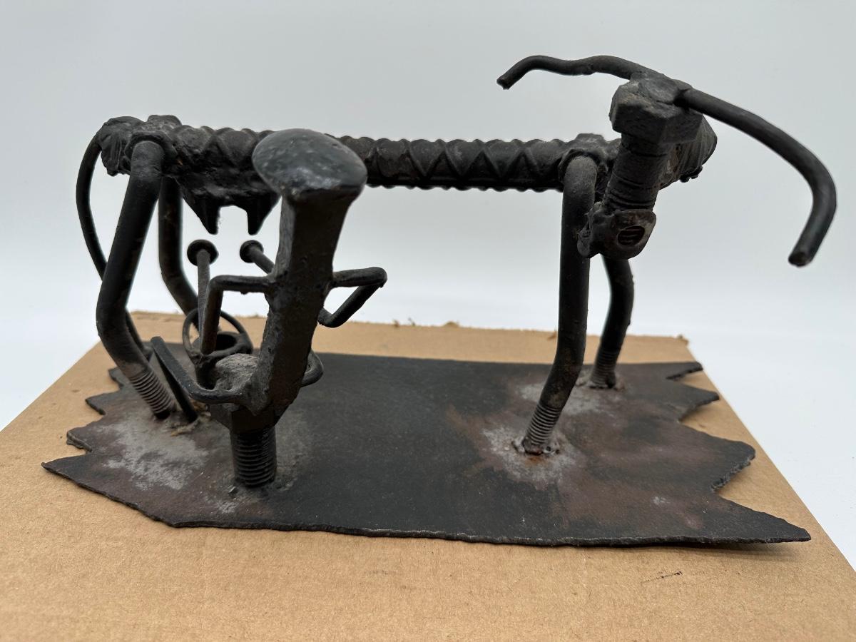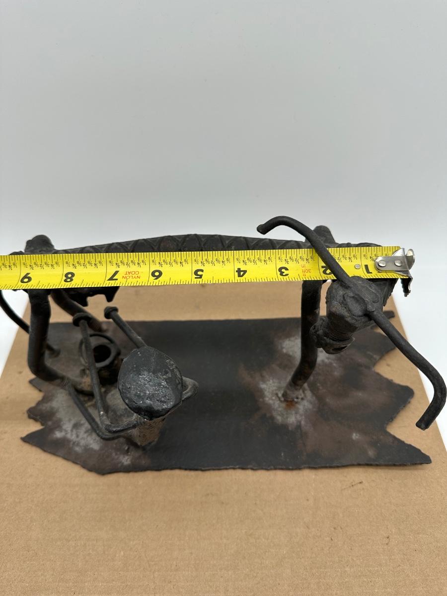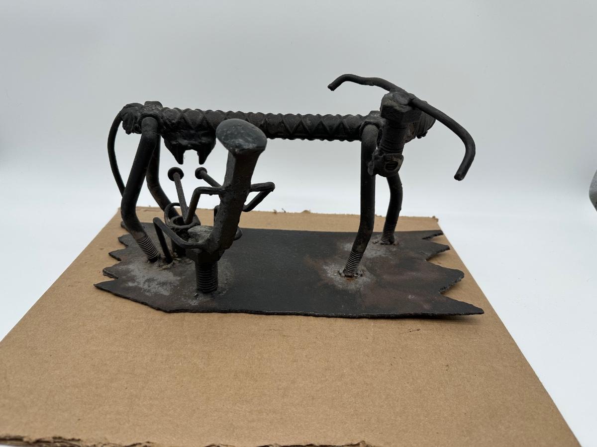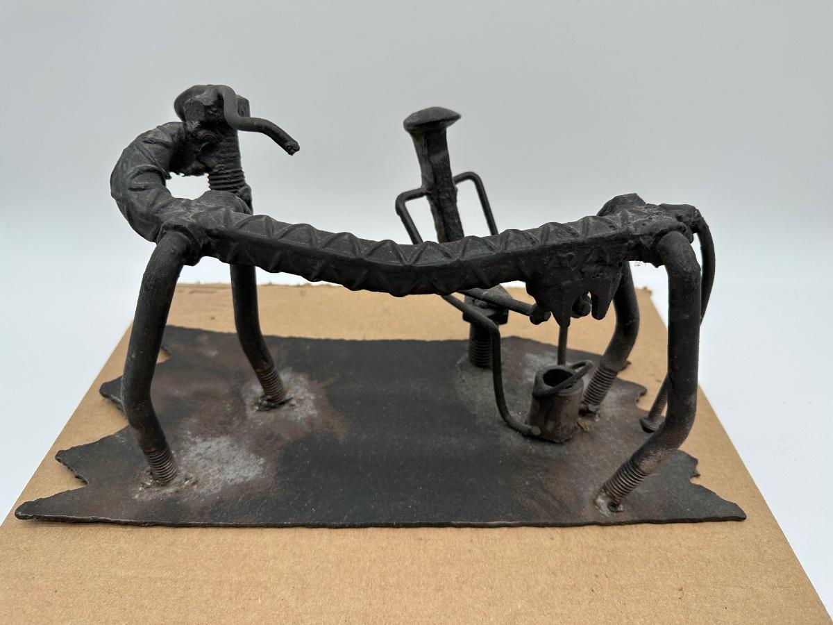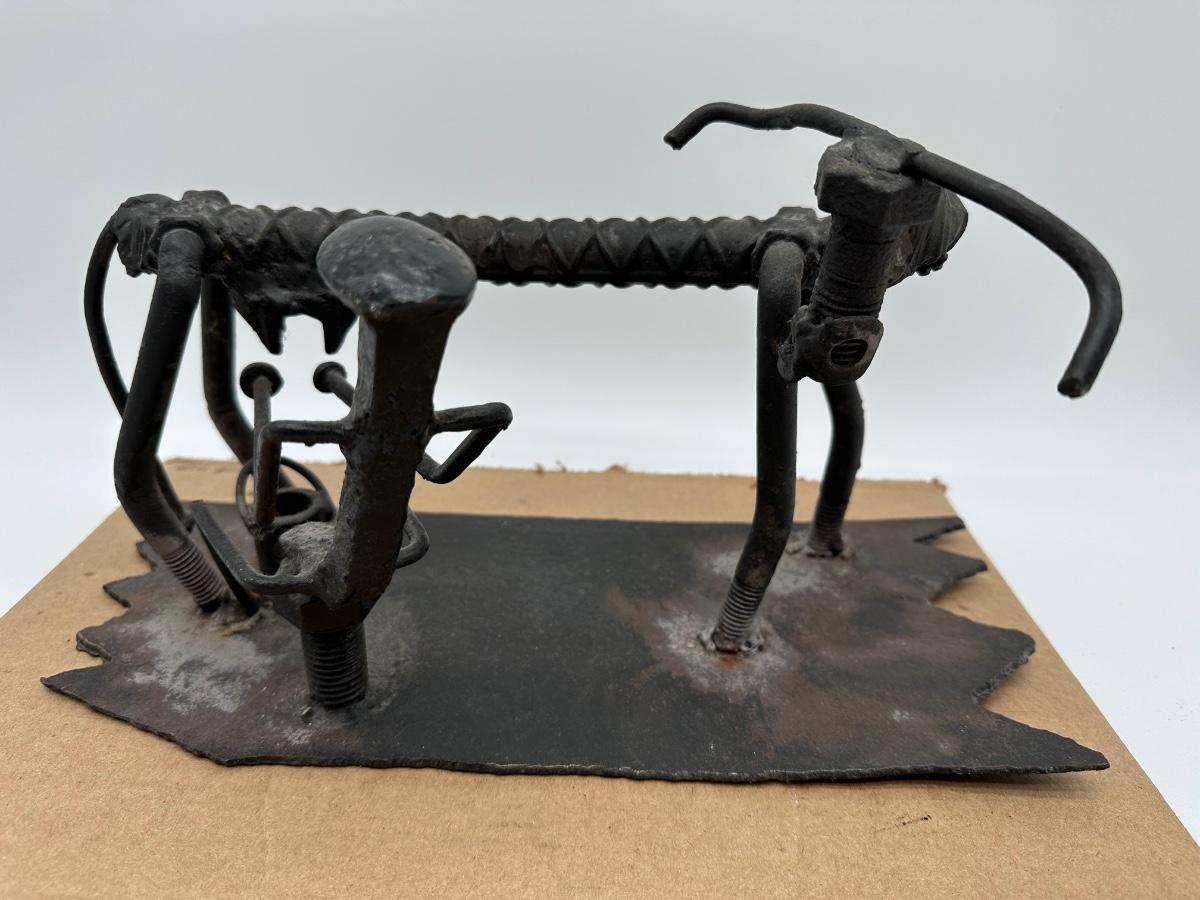 Unique hand-crafted welded metal sculpture made from rebar, bolts, and steel hardware, formed into a small bench/seat design. Heavy industrial look with great texture and patina. Perfect as folk art, industrial décor, desk display, or conversation piece.