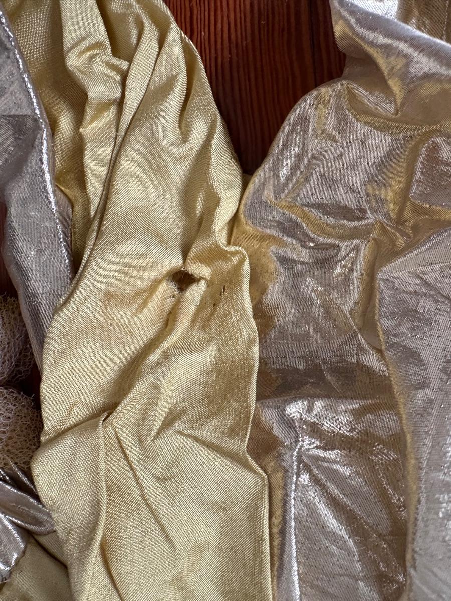The gold one has a small hole in the back of its pant holes and his hat needs to be pinned back down, see picture.