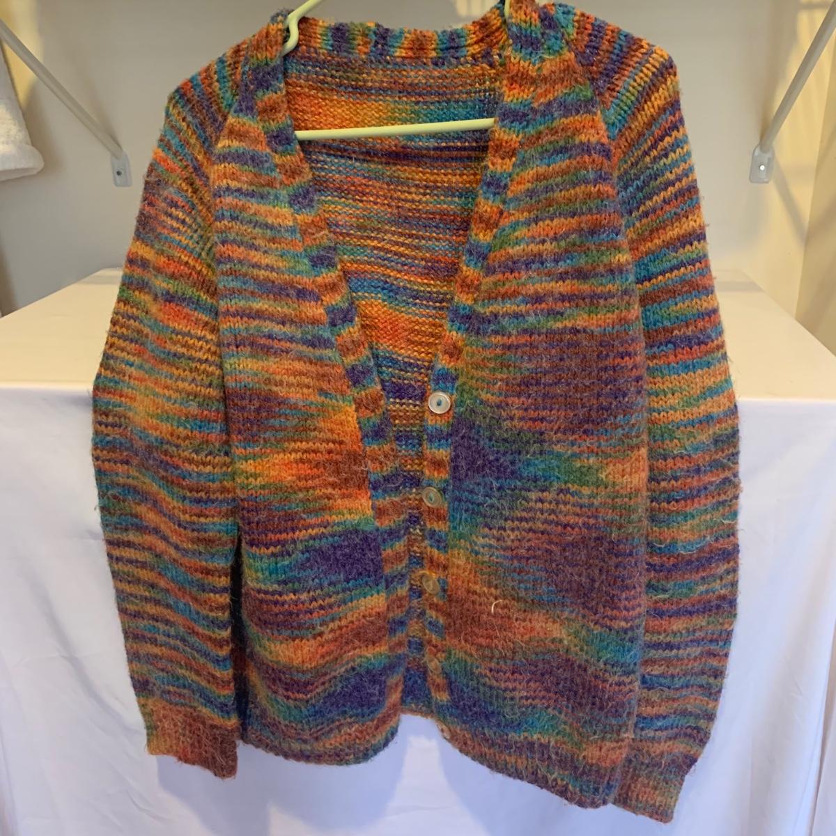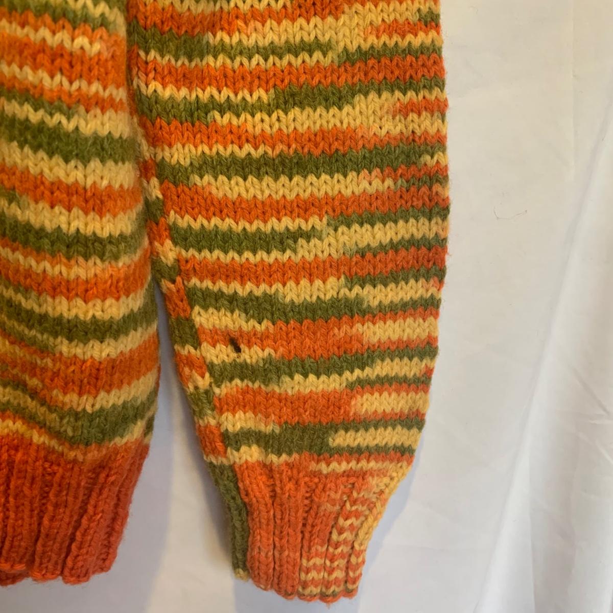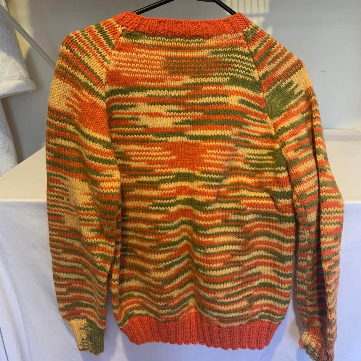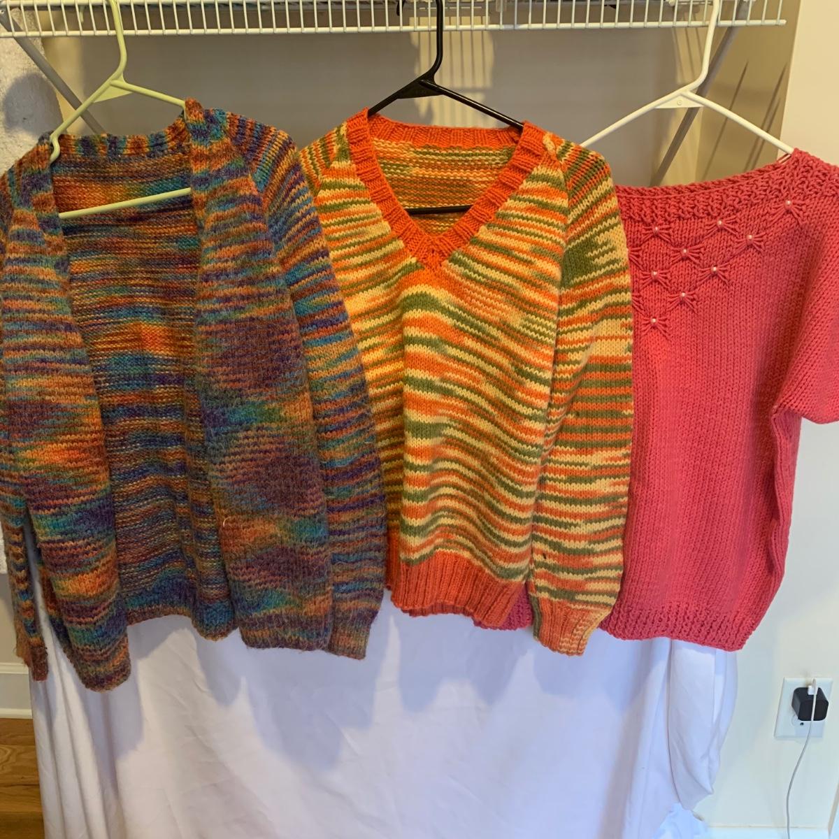 This lot includes three knit sweaters that appear to be handmade. The rainbow cardigan sweater has some pilling and fuzz (see photos). The sweaters appear to fit a women’s size Small-Medium. Tje orangs and green sweater measures 16" at the shoulders, 20" sleeves and a 22" length. Shipping available.