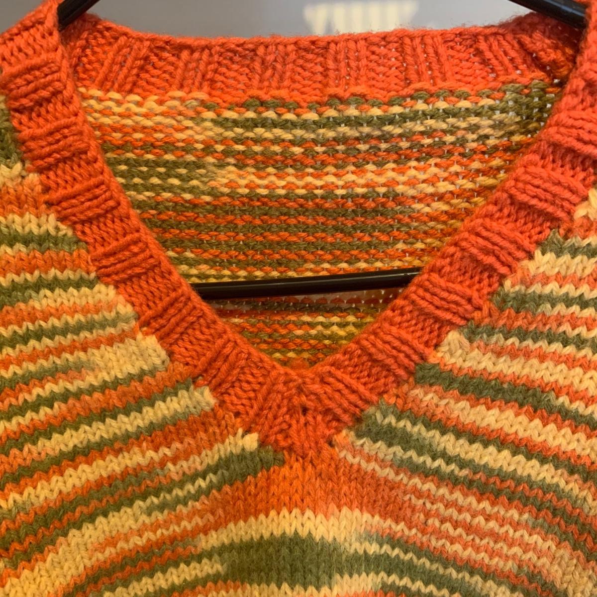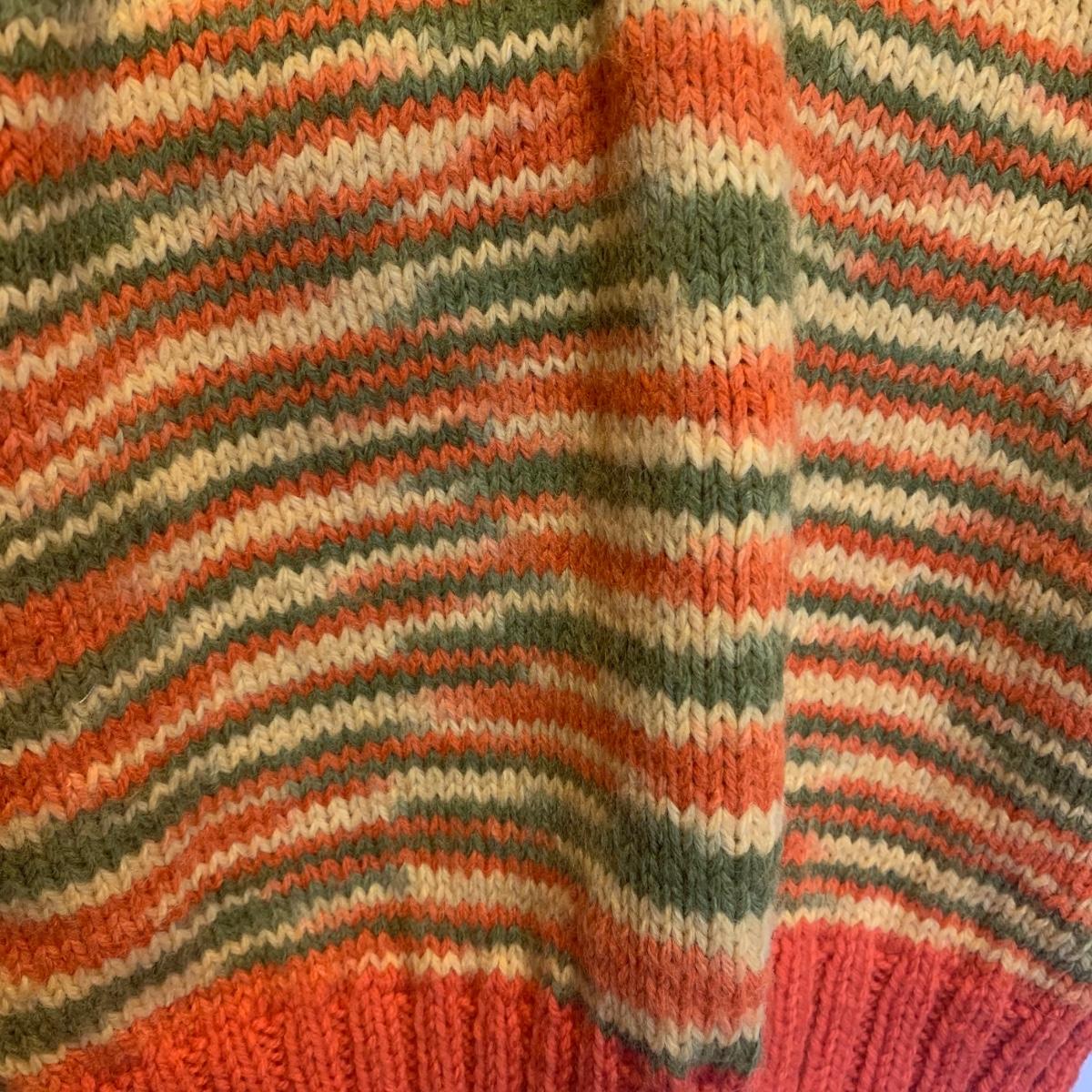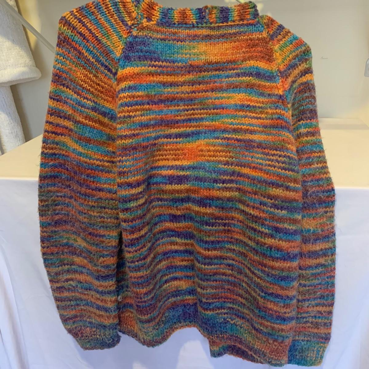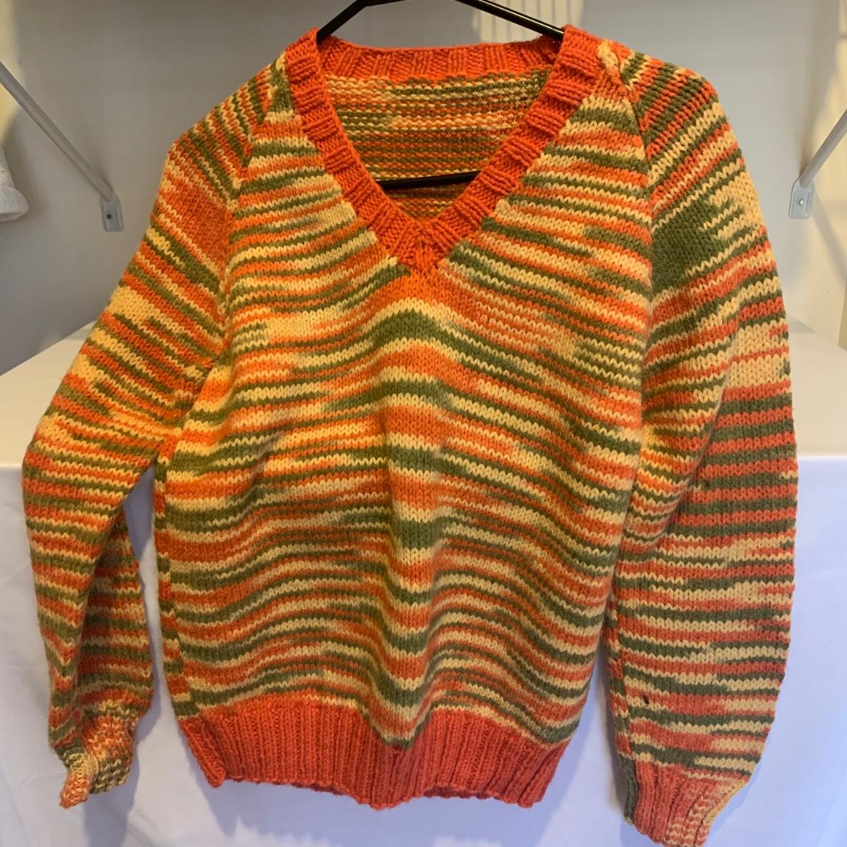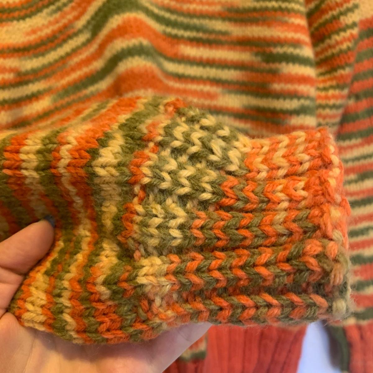 This lot includes three knit sweaters that appear to be handmade. The rainbow cardigan sweater has some pilling and fuzz (see photos). The sweaters appear to fit a women’s size Small-Medium. Tje orangs and green sweater measures 16" at the shoulders, 20" sleeves and a 22" length. Shipping available.