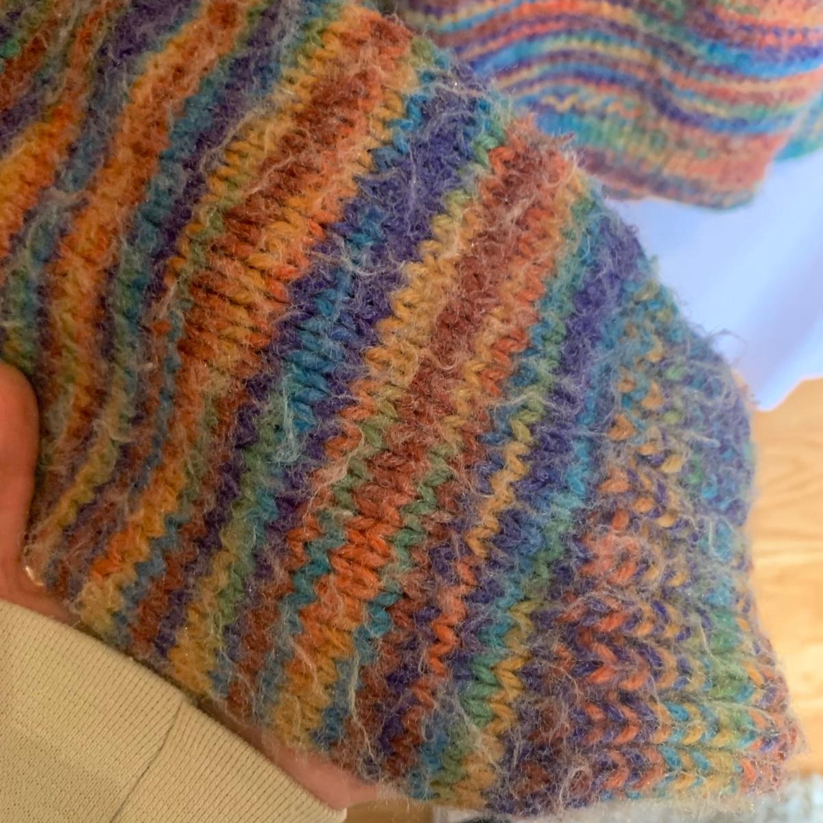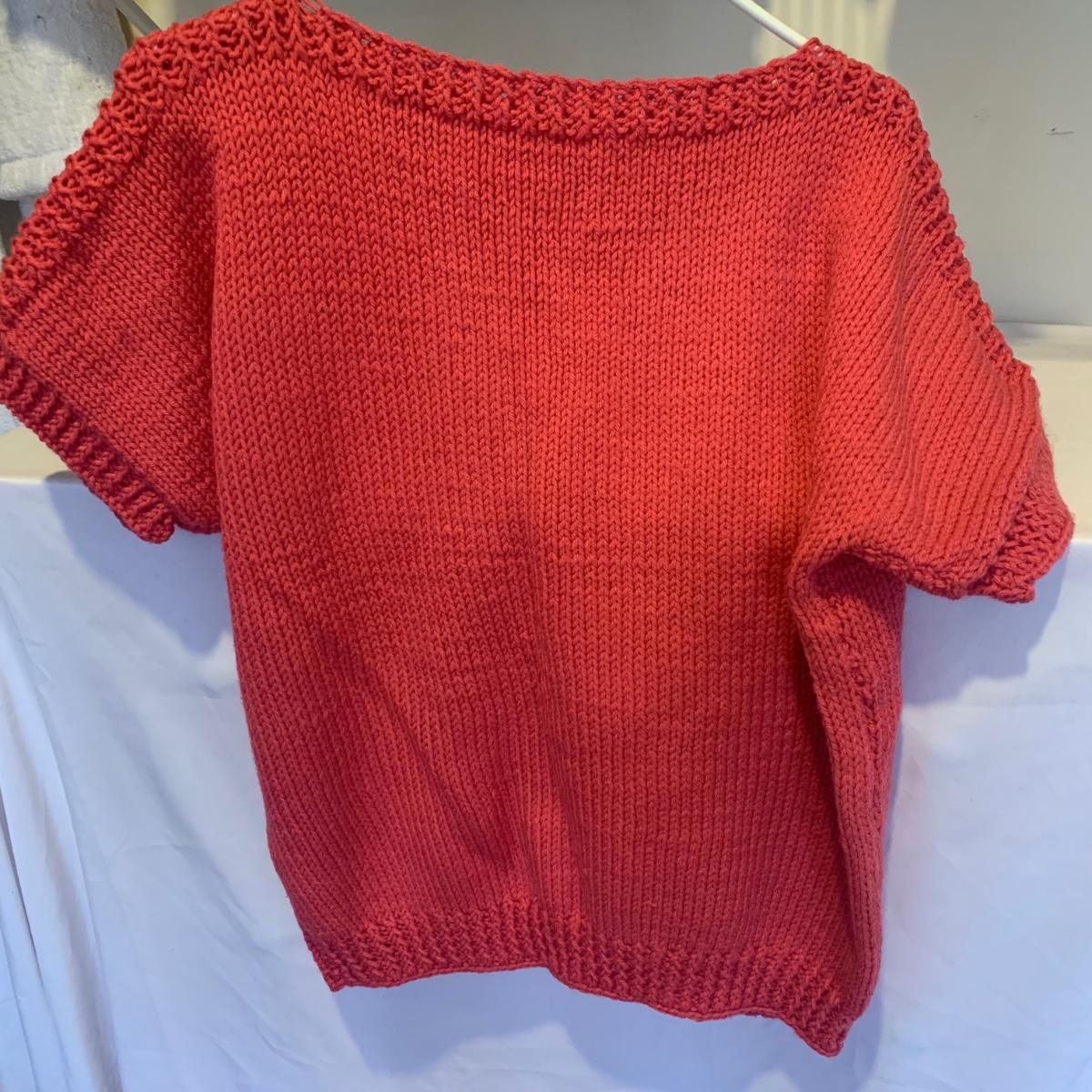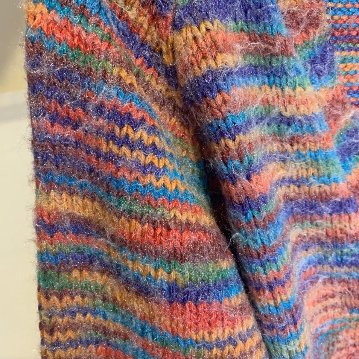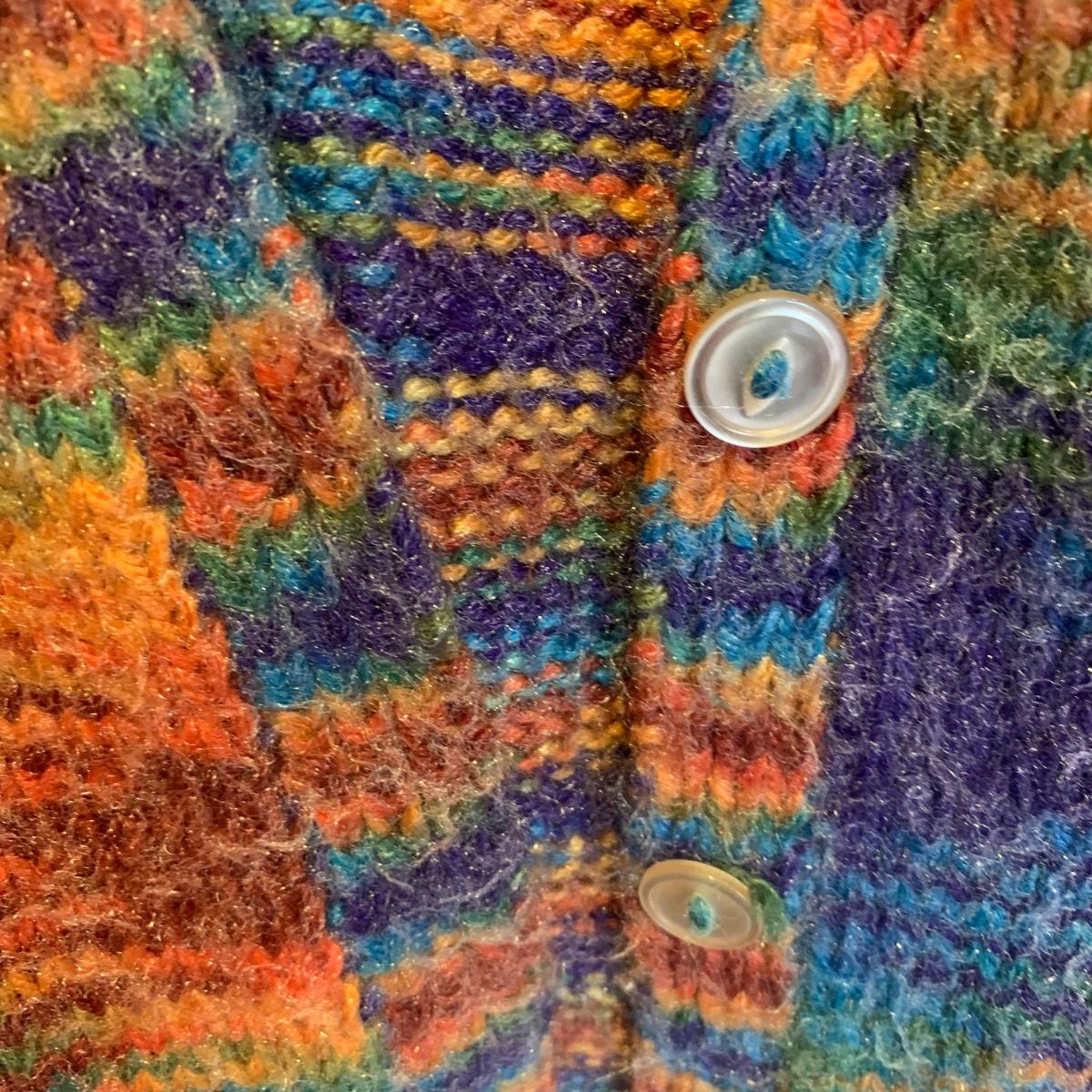 This lot includes three knit sweaters that appear to be handmade. The rainbow cardigan sweater has some pilling and fuzz (see photos). The sweaters appear to fit a women’s size Small-Medium. Tje orangs and green sweater measures 16" at the shoulders, 20" sleeves and a 22" length. Shipping available.