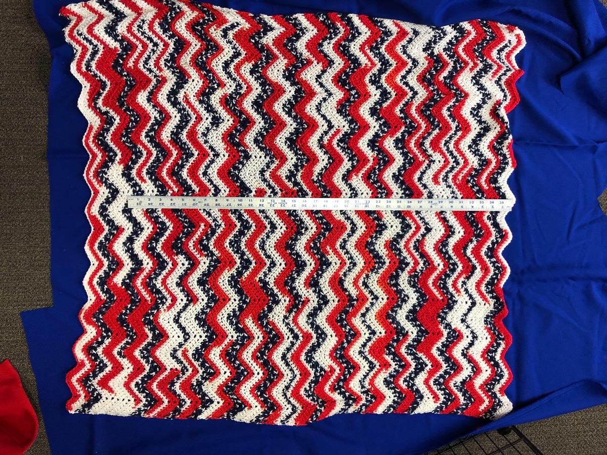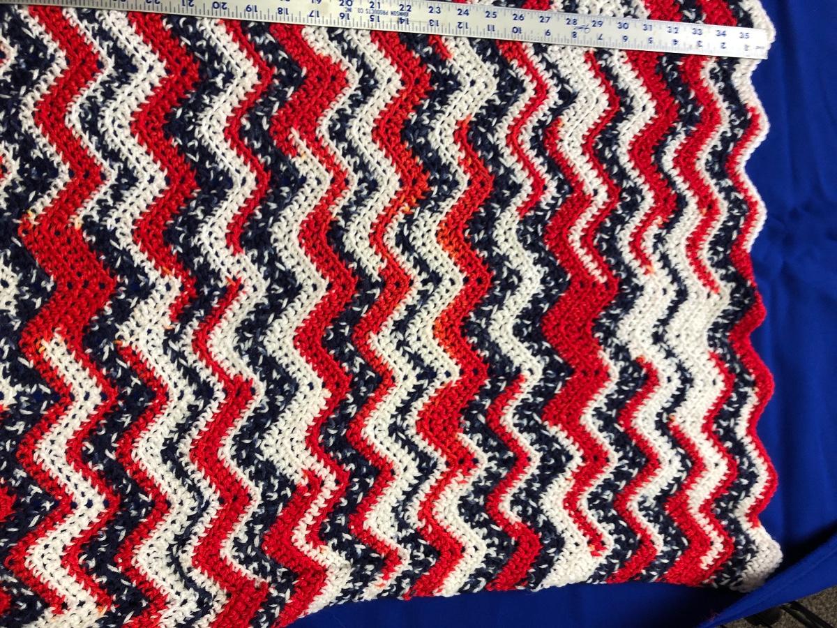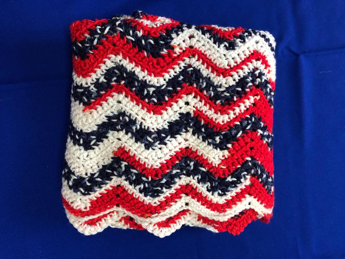 Handmade lap blanket 4’ x 4’, red White and blue, zigzag pattern
