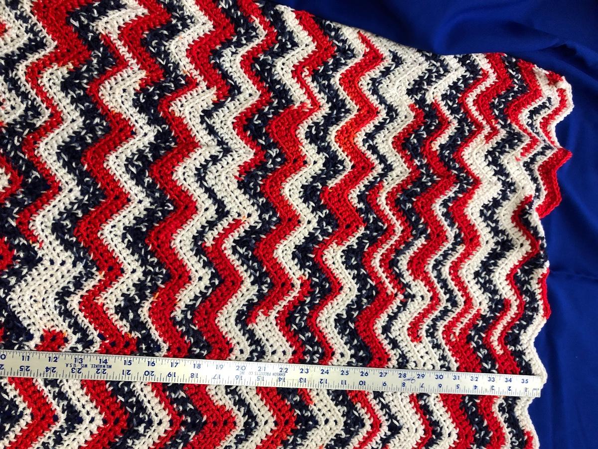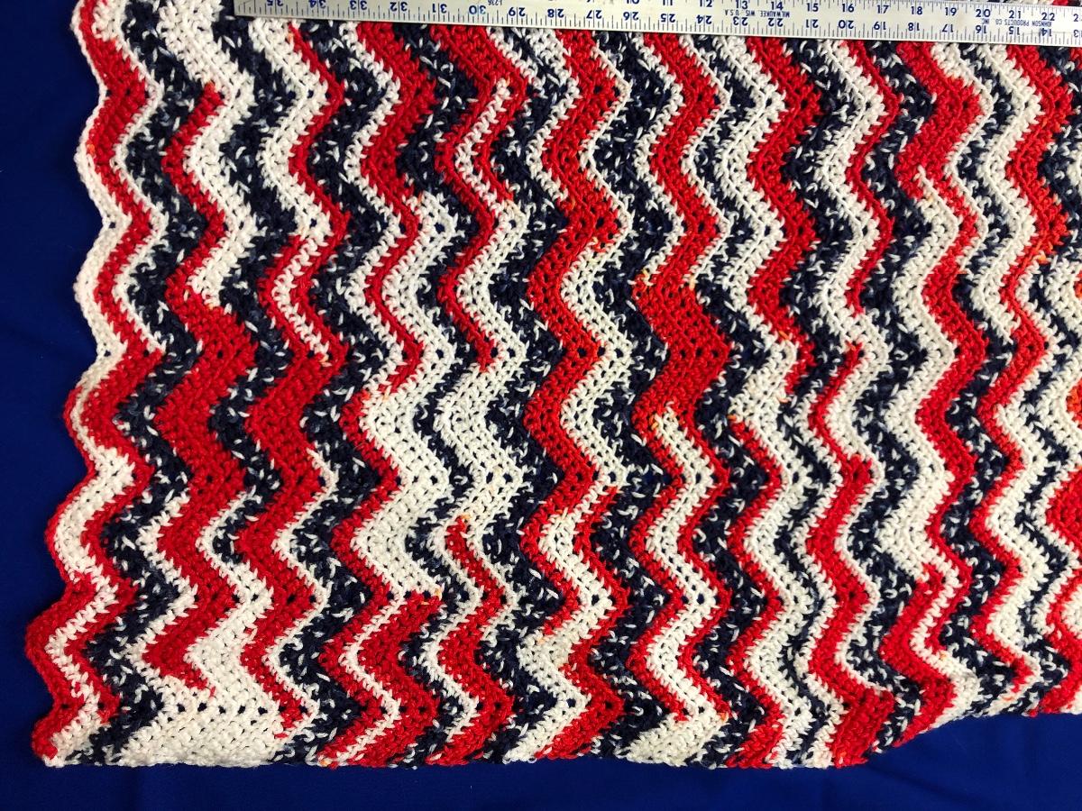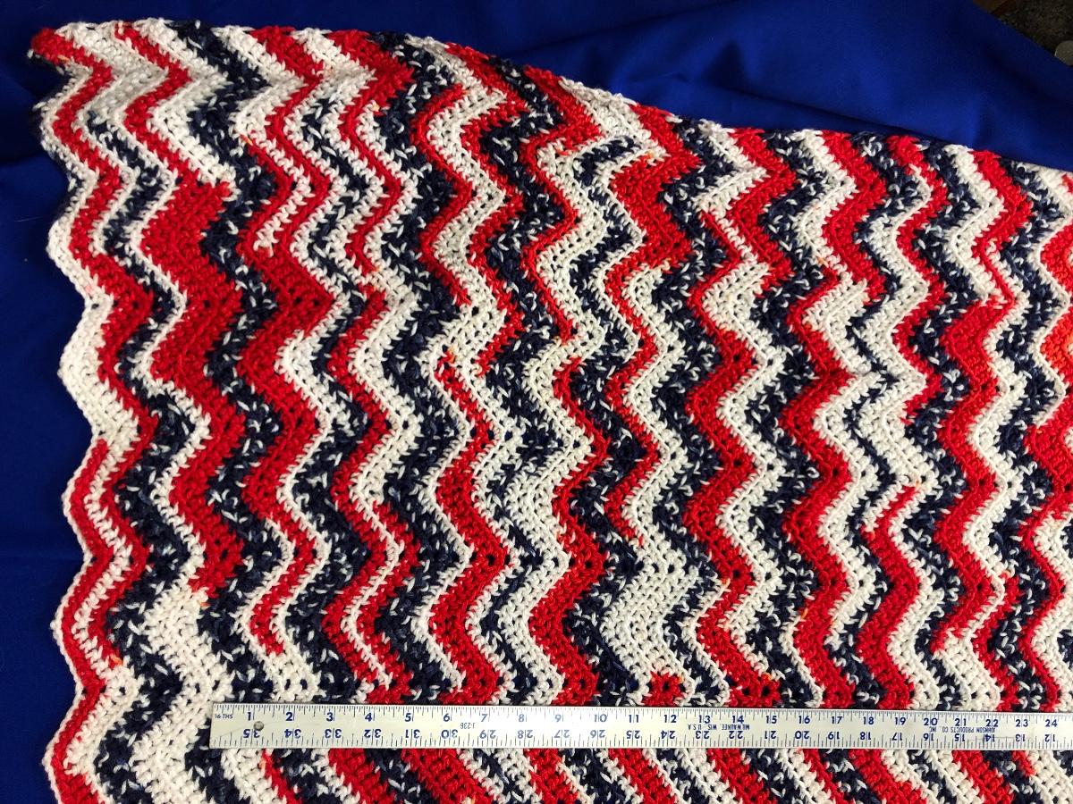 Handmade lap blanket 4’ x 4’, red White and blue, zigzag pattern