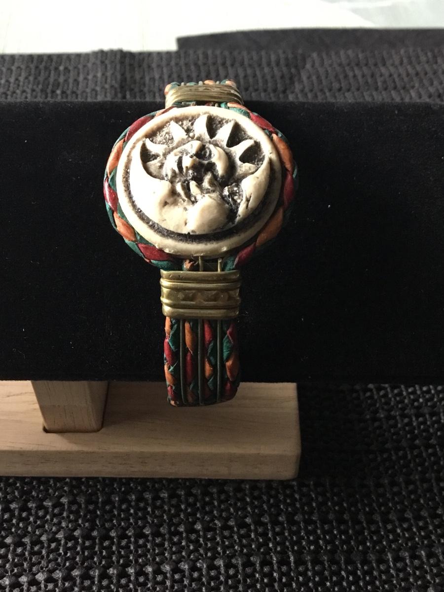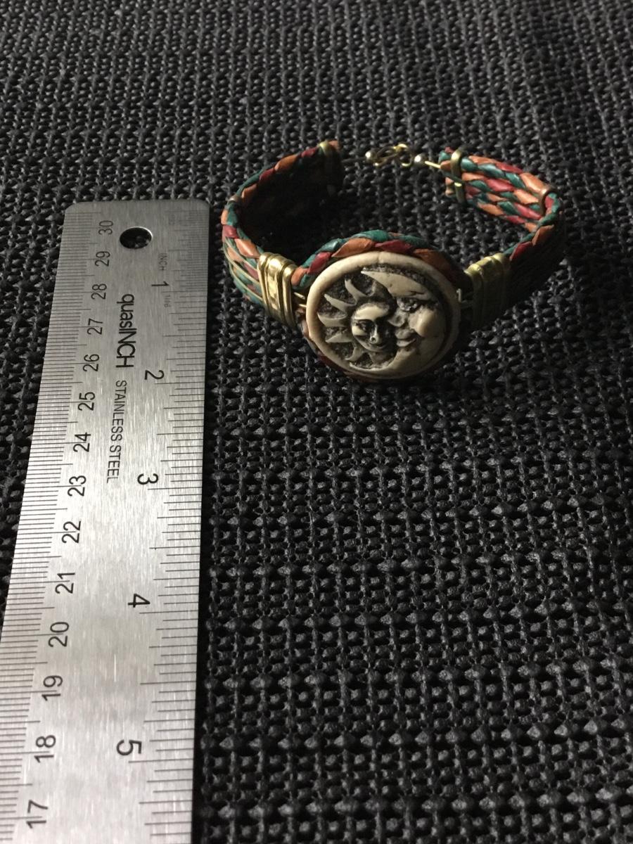 Handmade leather cuff bracelet carved sun and moon face centerpiece