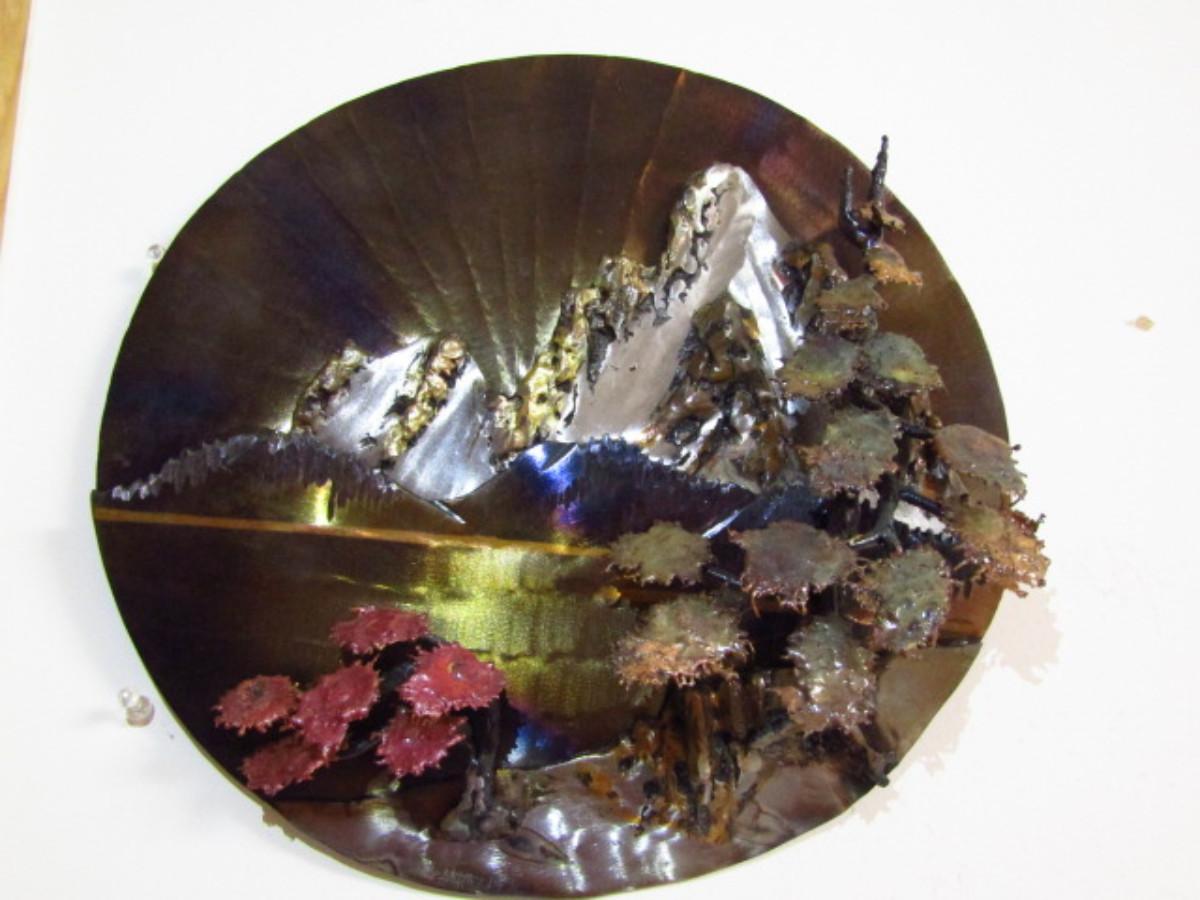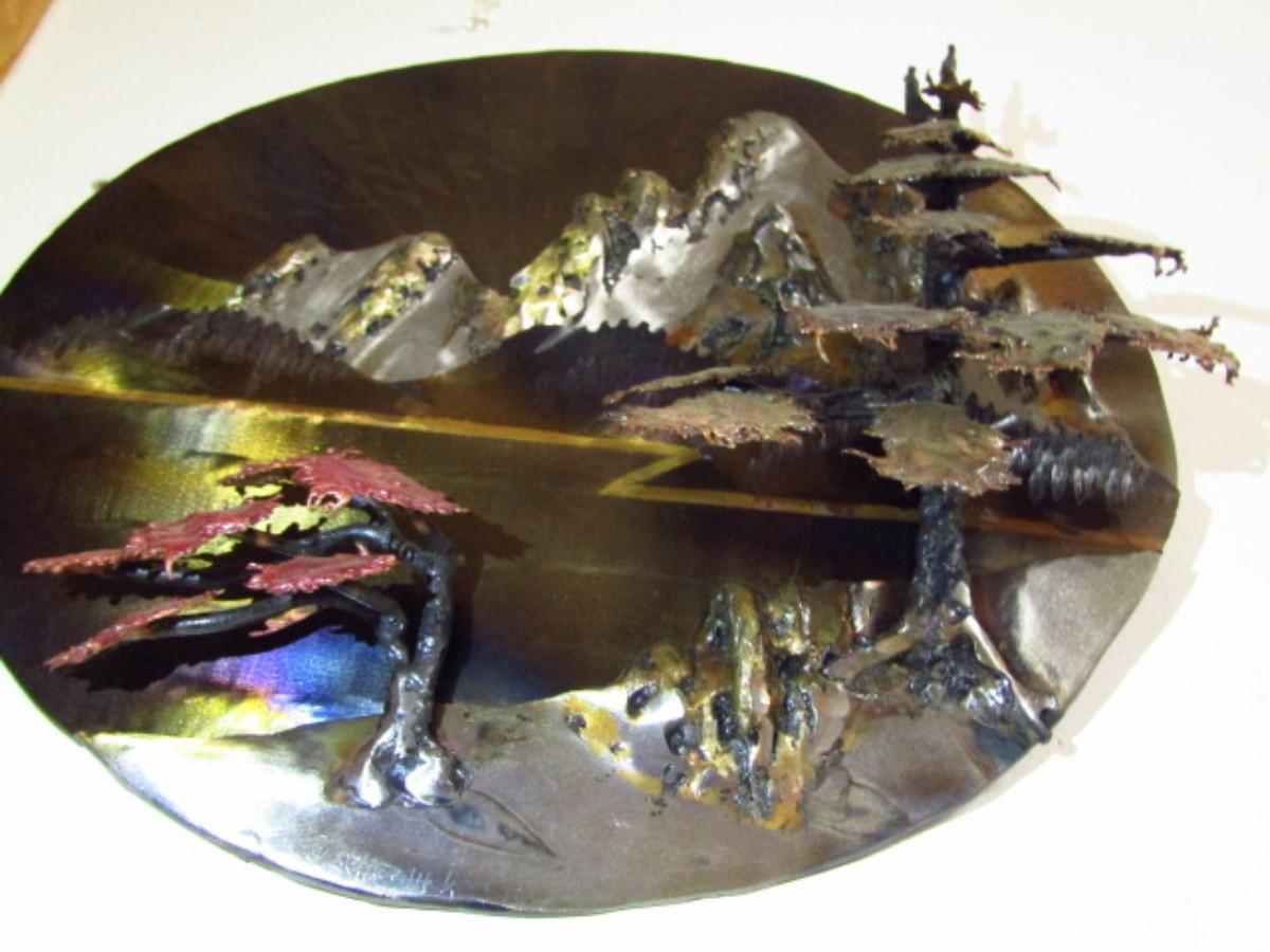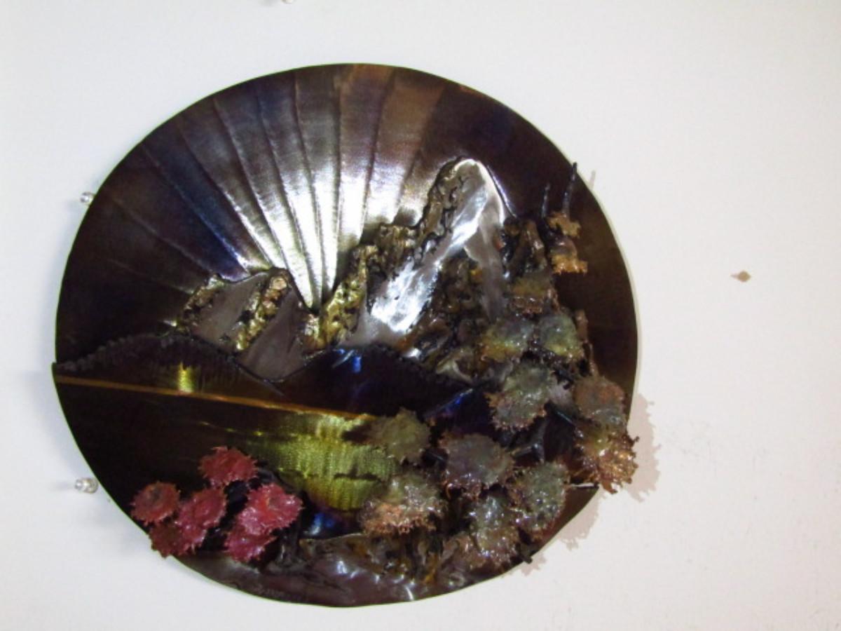 Handmade Metal 3-D Wall Art by Cody Steffler. This is a very heavy, well-made piece. Other examples of this artist's work can be found at steelcrazysculptures.com. This piece is classified as 'Round Mountain', is approx 12 inches in diameter, and retails for $295.