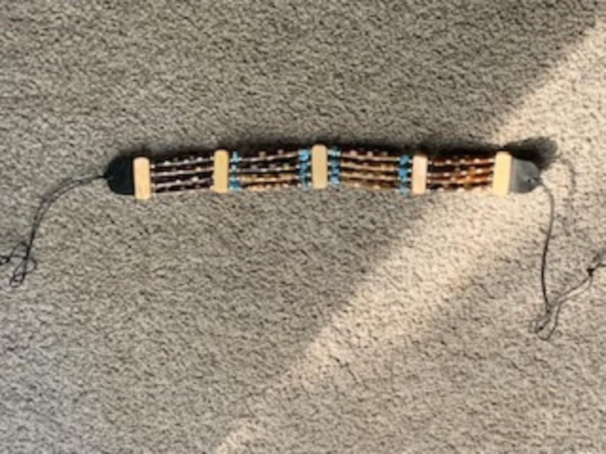 The multi-strand beadwork and the use of turquoise with earthy tones give it a striking, tribal-inspired aesthetic. The rectangular spacers and knotted black cords suggest it could be a handmade choker or wide bracelet—possibly even a decorative armband depending on its size.
