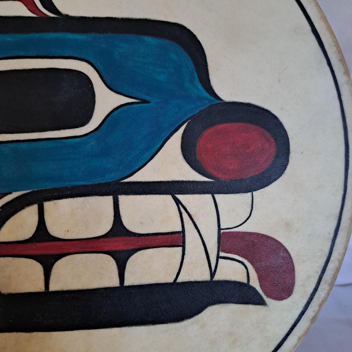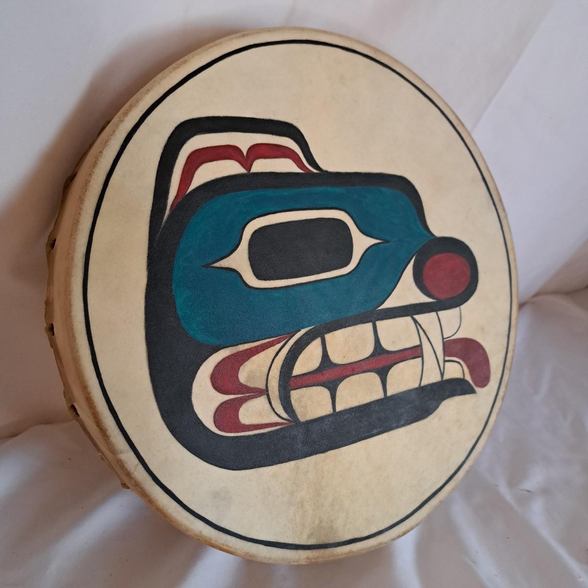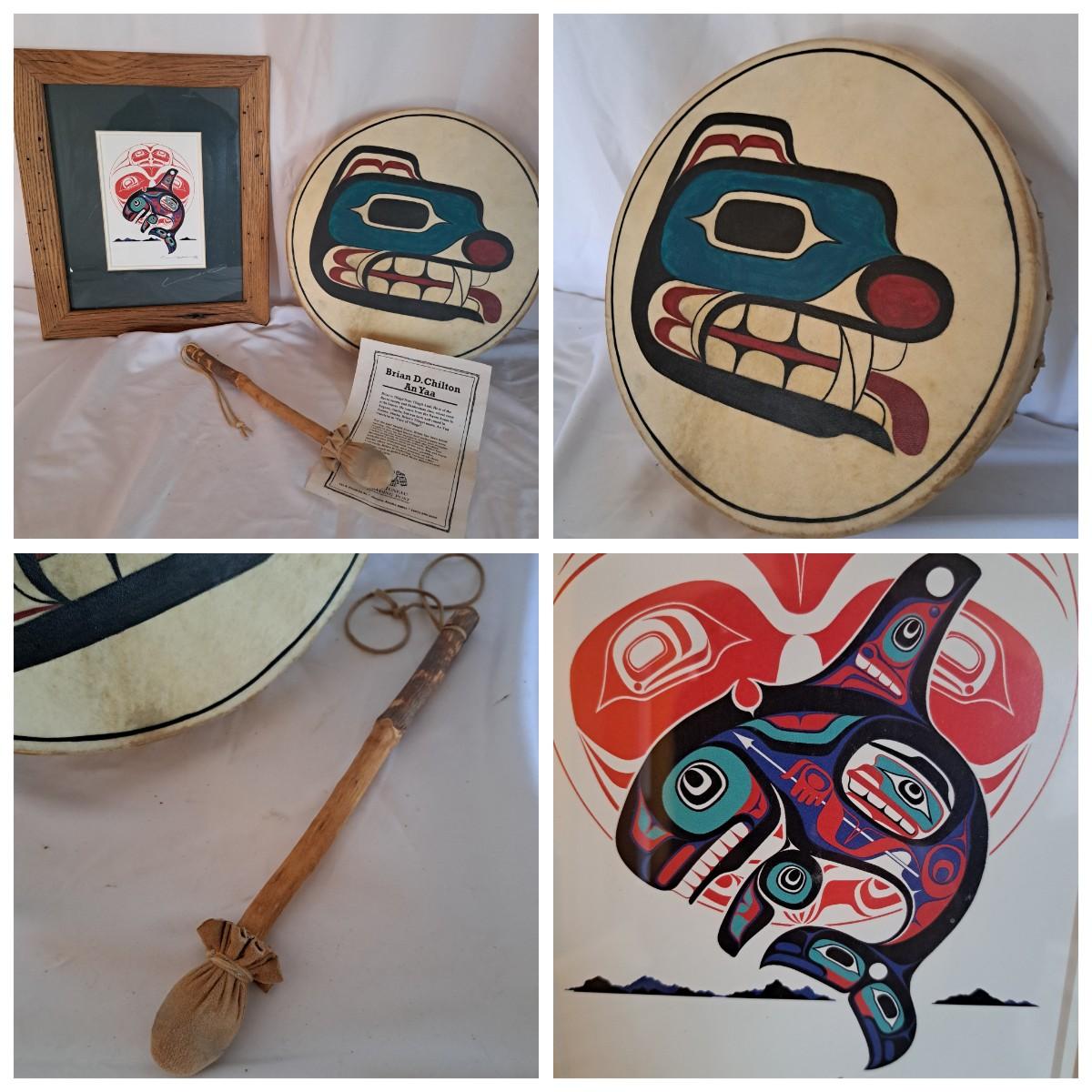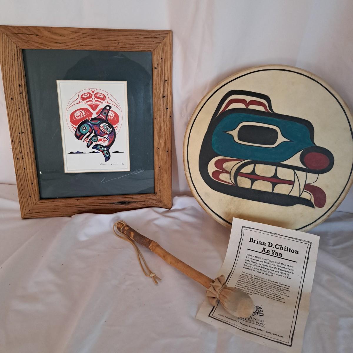 Lot includes a beautiful hand-made and hand-painted skin drum, titled, "Tlingit Bear" by Tlingit artist Brian D. Chilton. Drum is 12"D x 3" and includes 12"L hand-carved wood and leather drumstick comes with an artist bio. Artist has name of animal handwritten inside of drum as shown. Also, a 1991 print of an original signed serigraph by artist Yukie Adam's 12" x 14.5"H matted and set in a wood frame. The serigraph, titled "Natsilane," depicts the Blackfish creator myth of the Tlingit and Haida Native cultures. Shipping available. Shipping can be costly. We suggest contacting our preferred local shipping provider, Postage Express, with dimensions and getting an estimate before bidding: (828) 255-9250 or shipping@postageexpressnc.com.
