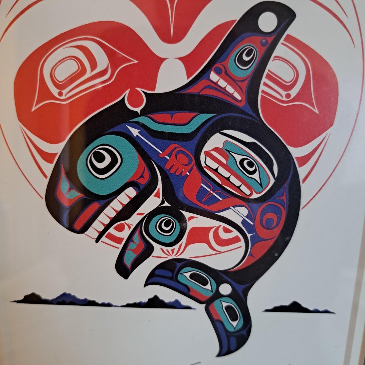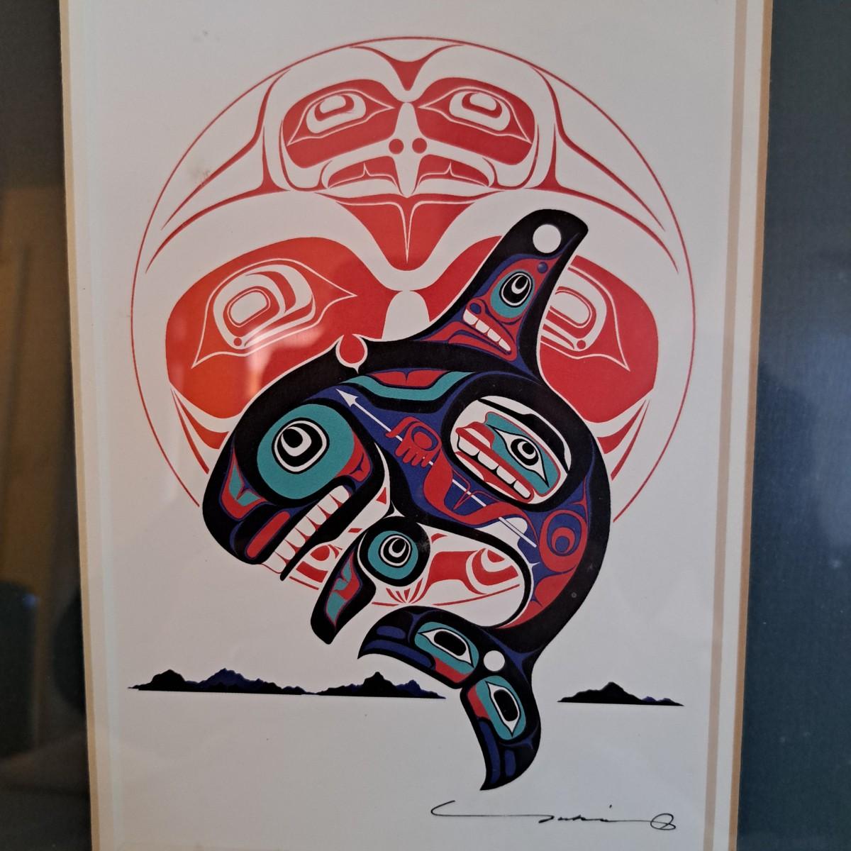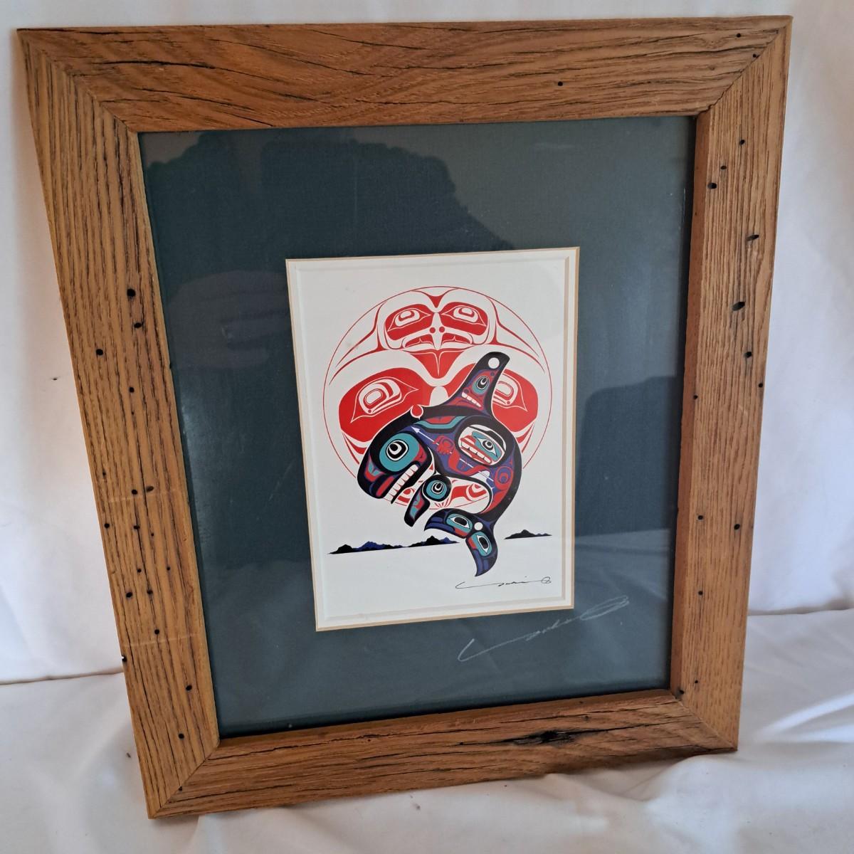 Lot includes a beautiful hand-made and hand-painted skin drum, titled, "Tlingit Bear" by Tlingit artist Brian D. Chilton. Drum is 12"D x 3" and includes 12"L hand-carved wood and leather drumstick comes with an artist bio. Artist has name of animal handwritten inside of drum as shown. Also, a 1991 print of an original signed serigraph by artist Yukie Adam's 12" x 14.5"H matted and set in a wood frame. The serigraph, titled "Natsilane," depicts the Blackfish creator myth of the Tlingit and Haida Native cultures. Shipping available. Shipping can be costly. We suggest contacting our preferred local shipping provider, Postage Express, with dimensions and getting an estimate before bidding: (828) 255-9250 or shipping@postageexpressnc.com.