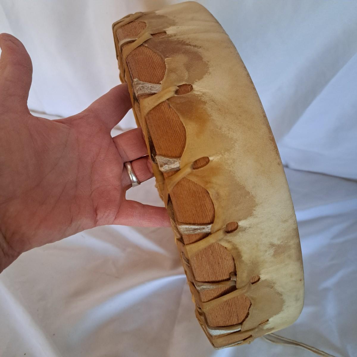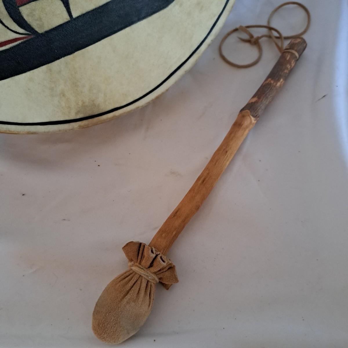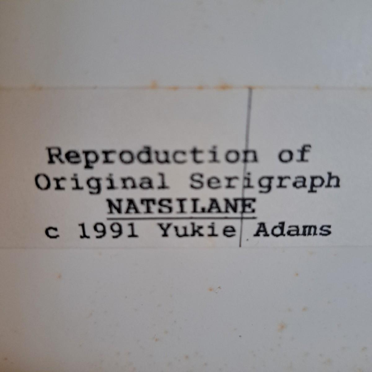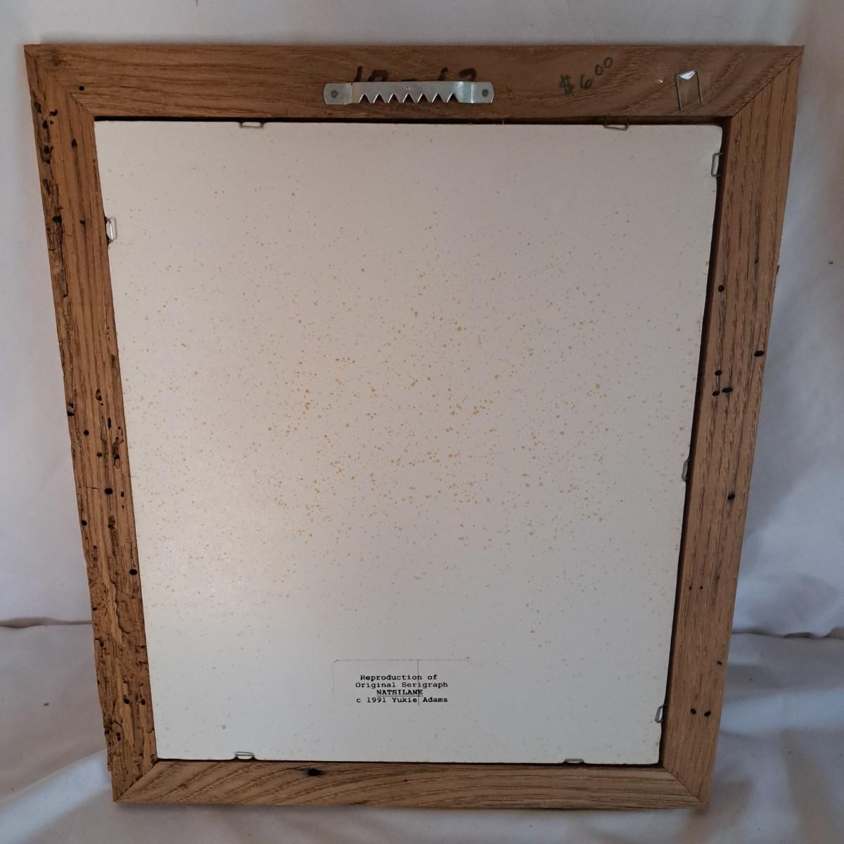 Lot includes a beautiful hand-made and hand-painted skin drum, titled, "Tlingit Bear" by Tlingit artist Brian D. Chilton. Drum is 12"D x 3" and includes 12"L hand-carved wood and leather drumstick comes with an artist bio. Artist has name of animal handwritten inside of drum as shown. Also, a 1991 print of an original signed serigraph by artist Yukie Adam's 12" x 14.5"H matted and set in a wood frame. The serigraph, titled "Natsilane," depicts the Blackfish creator myth of the Tlingit and Haida Native cultures. Shipping available. Shipping can be costly. We suggest contacting our preferred local shipping provider, Postage Express, with dimensions and getting an estimate before bidding: (828) 255-9250 or shipping@postageexpressnc.com.